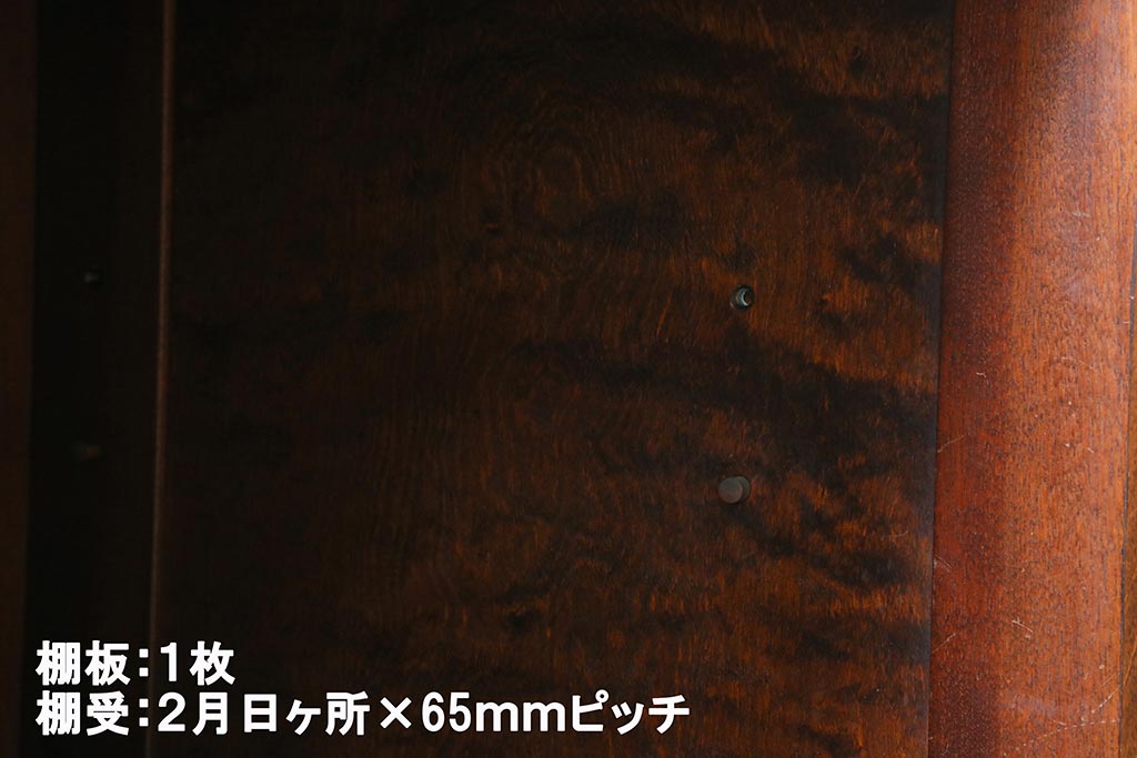 棚板は取り外しできます。棚板は各1枚あります。右下のみ棚受けは2ヶ所、65mmピッチで調整できます。棚幅サイズのものが1枚の作りです。