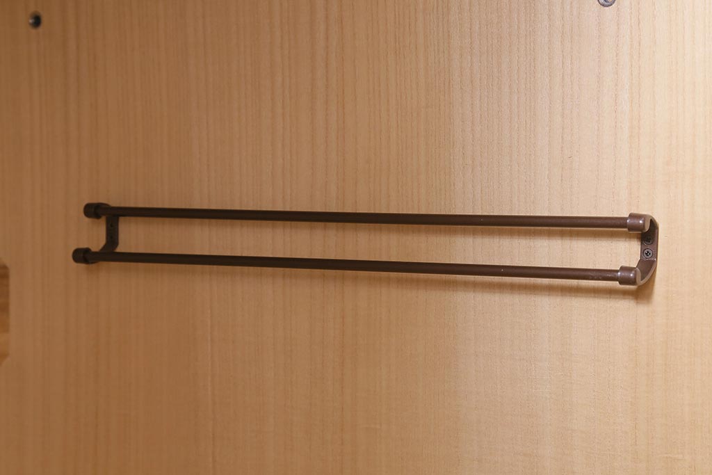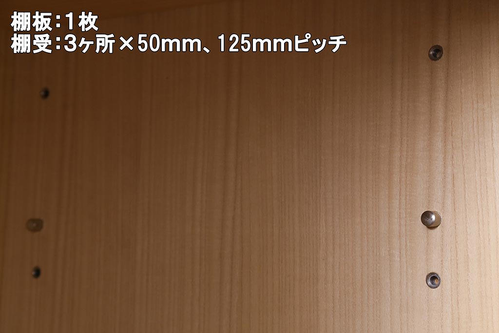 棚板は取り外しできます。棚板は1枚、棚受け3ヶ所、50mm・125mmピッチで調整できます。棚幅サイズのものが1枚のつくりです。