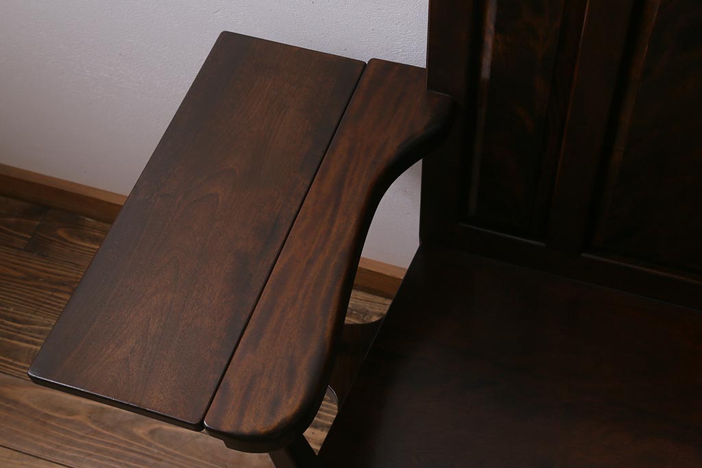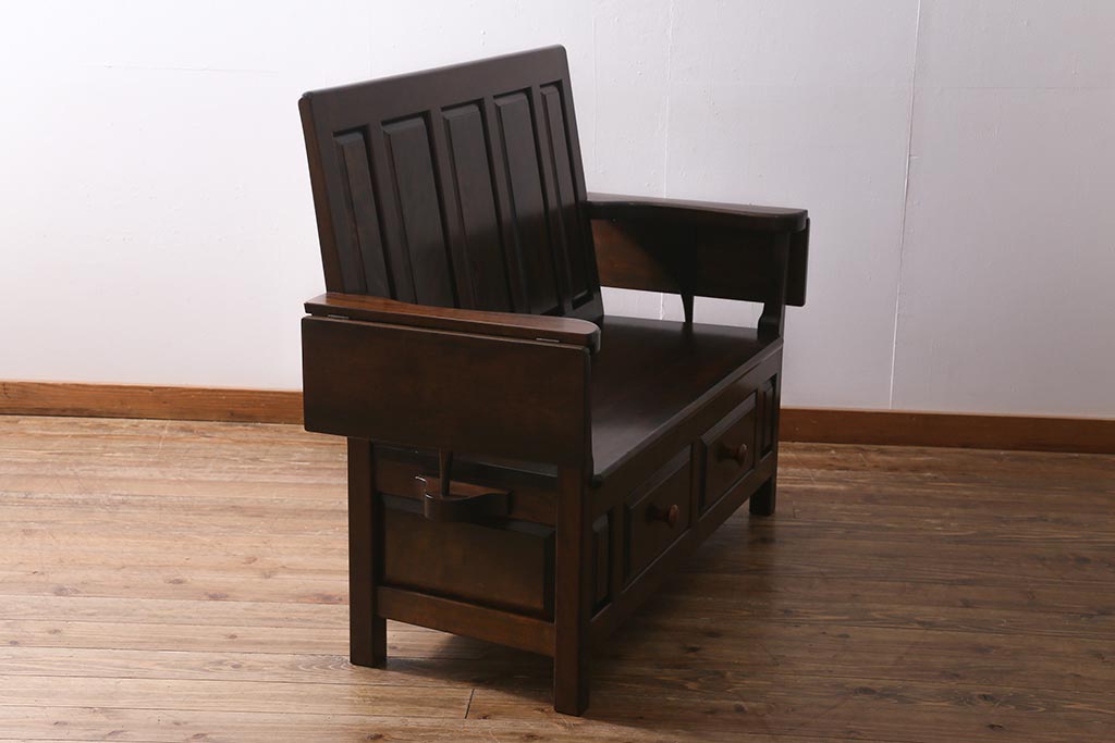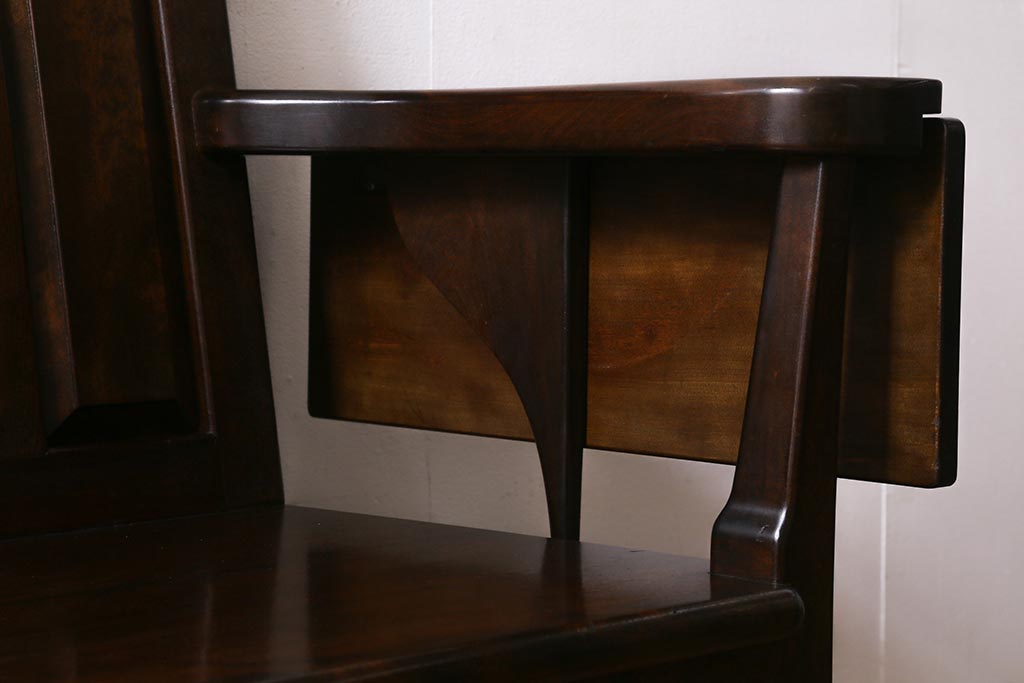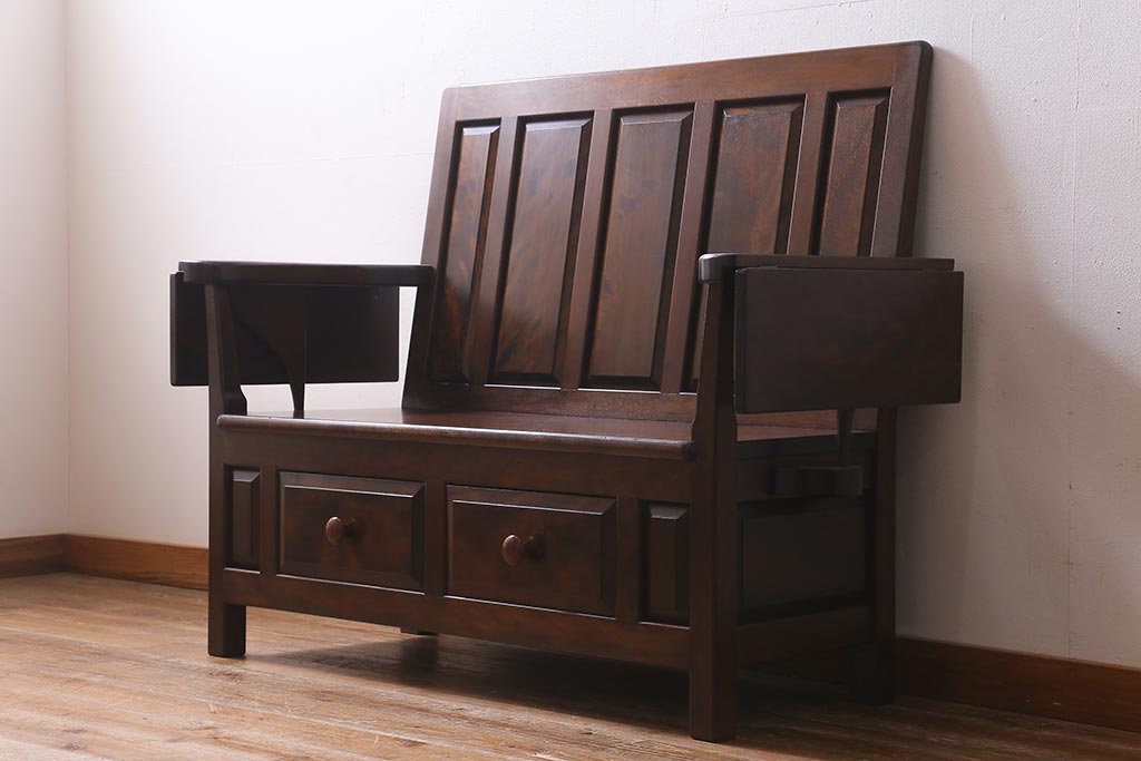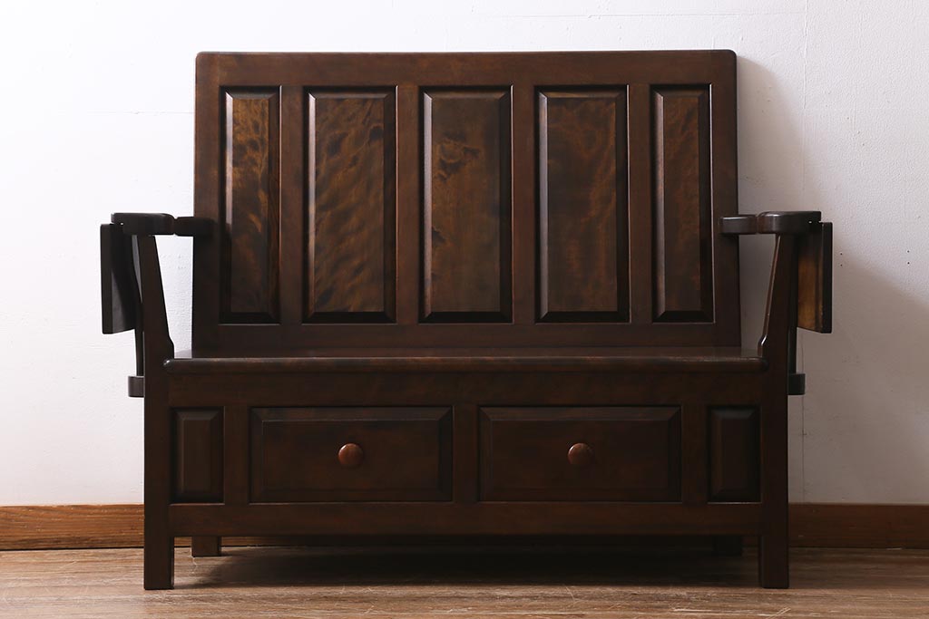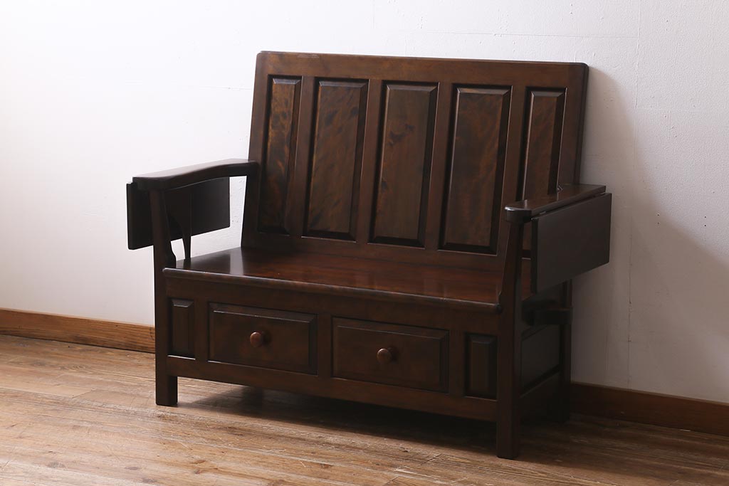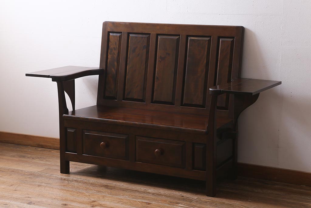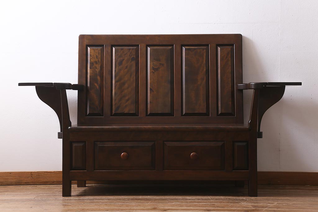 椅子・ベンチ> ベンチ > 中古 松本民芸家具 2人掛け シックなデザインの羽根付ベンチ(長椅子、二人掛けベンチ)(R-039522)