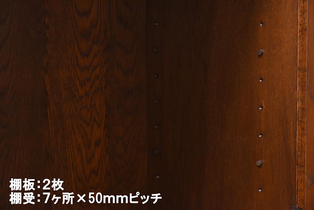 棚板は取り外しできます。棚板は2枚あります。棚受けは7ヶ所、50mmピッチで調整できます。棚幅サイズのものが1枚の作りです。