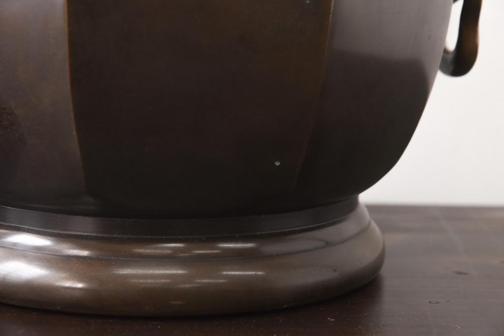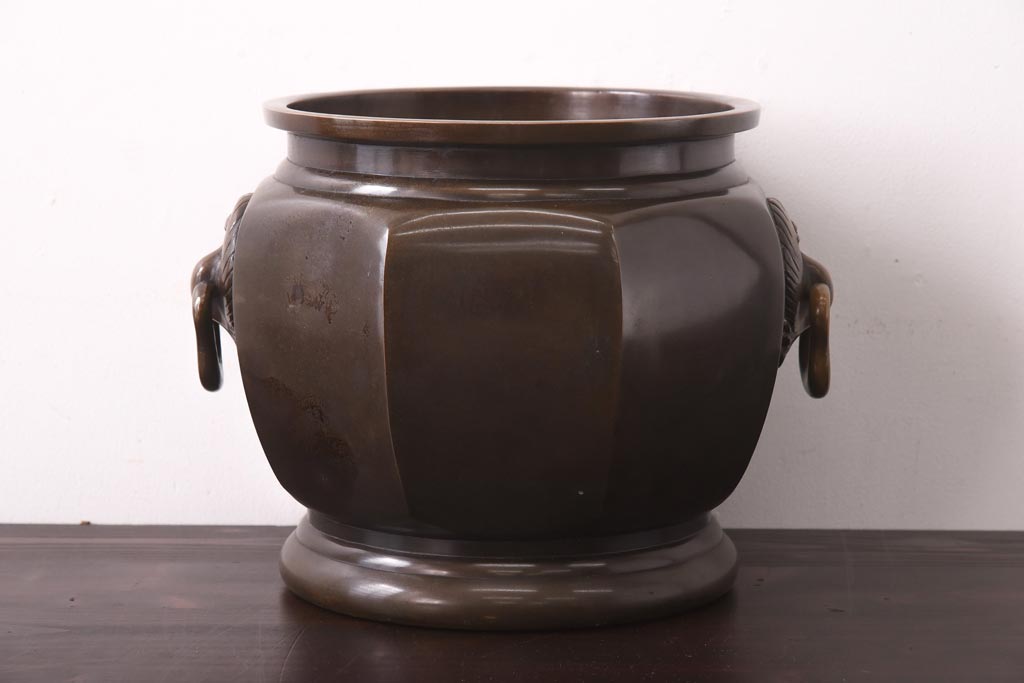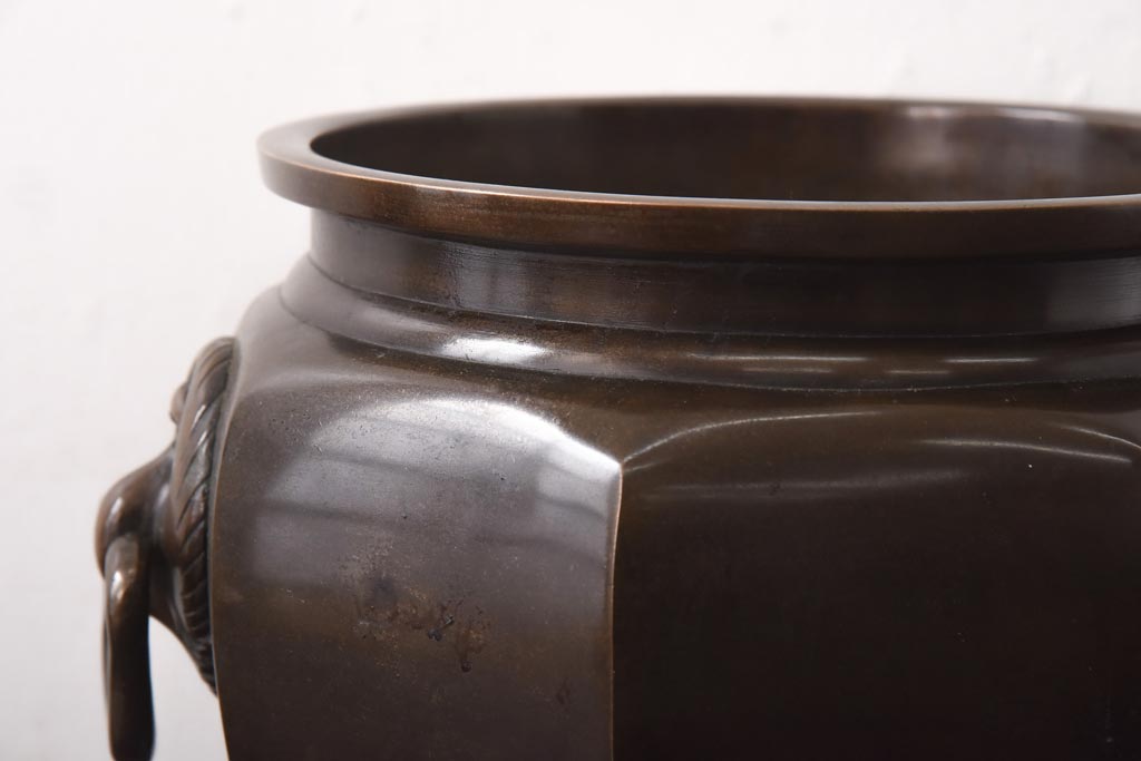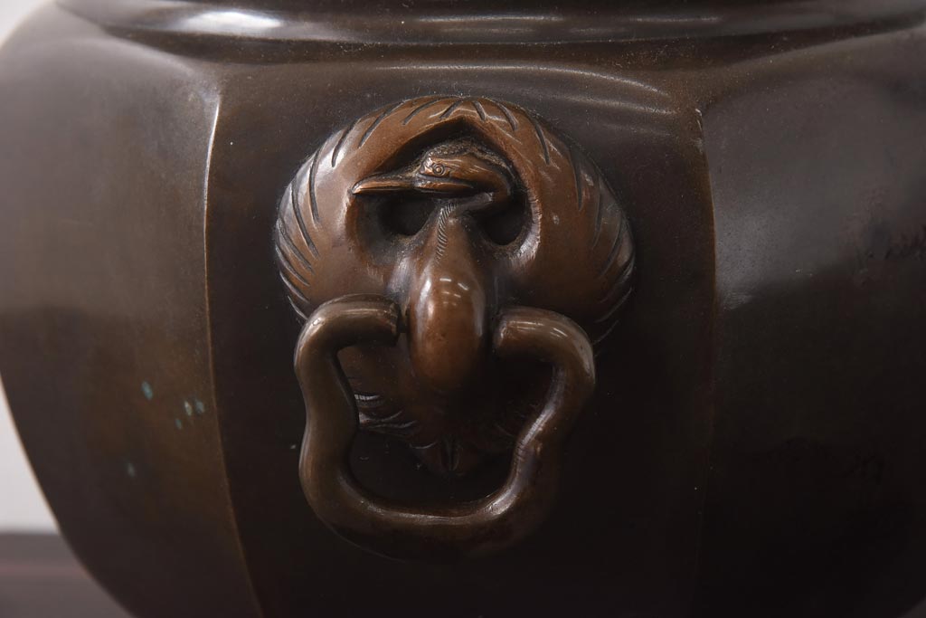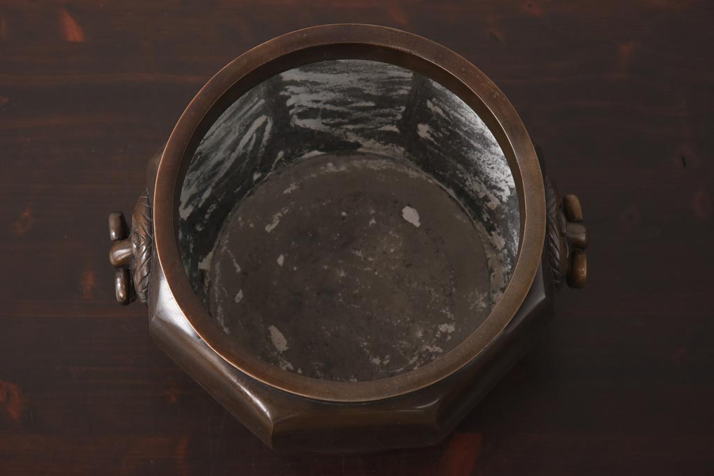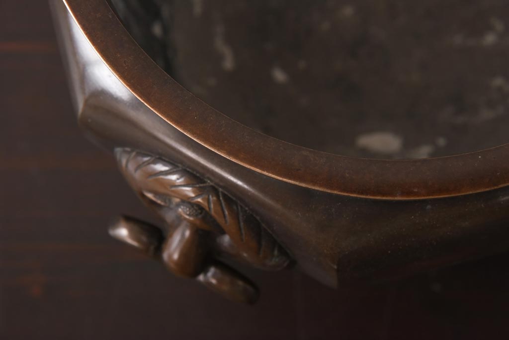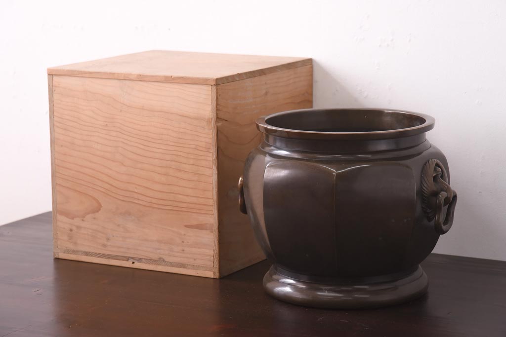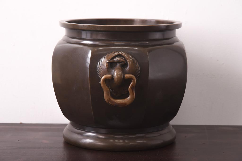 アンティーク雑貨 古民具 大正期 鶴紋 耳付銅製火鉢・箱付き(手炙り)(R-039258)