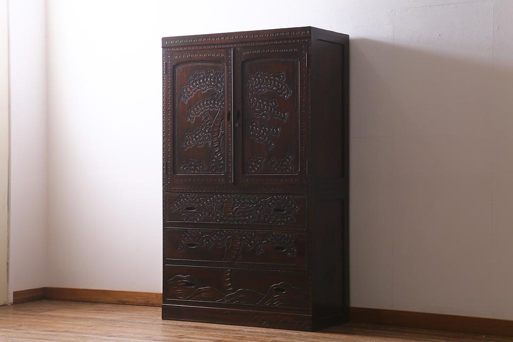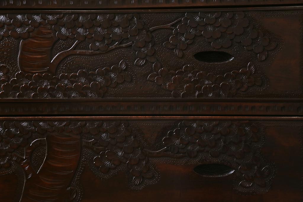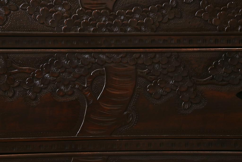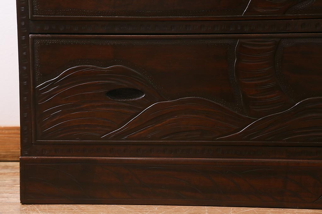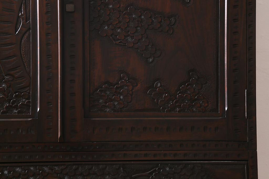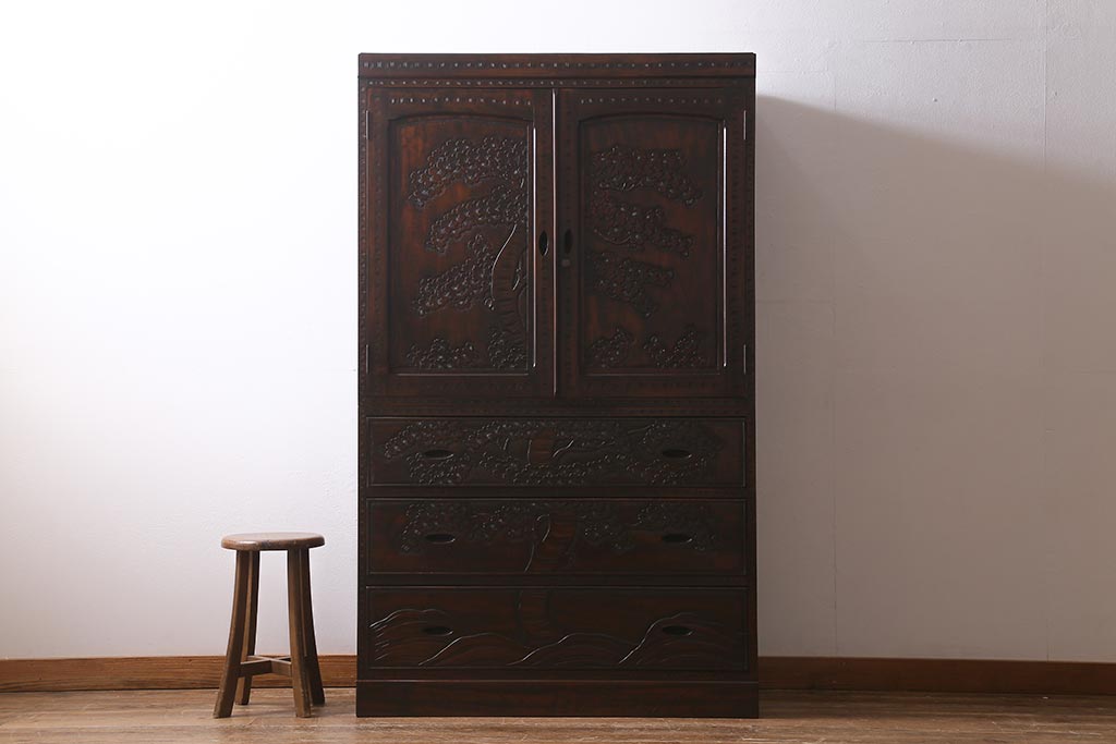 民芸家具 > 中古 伝統工芸 軽井沢彫り 咲き誇る桜の浮き彫りが目を引く重ね衣装箪笥(和タンス、引き出し、衣装盆付き、着物箪笥)(R-039717)