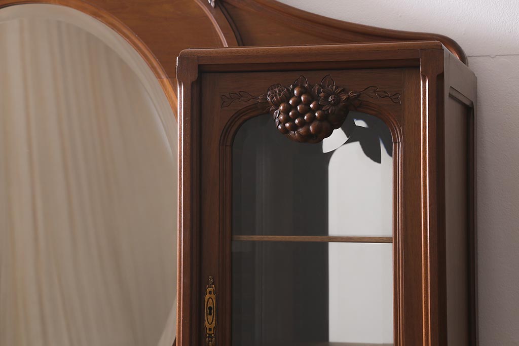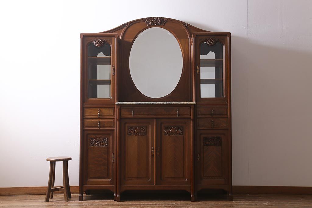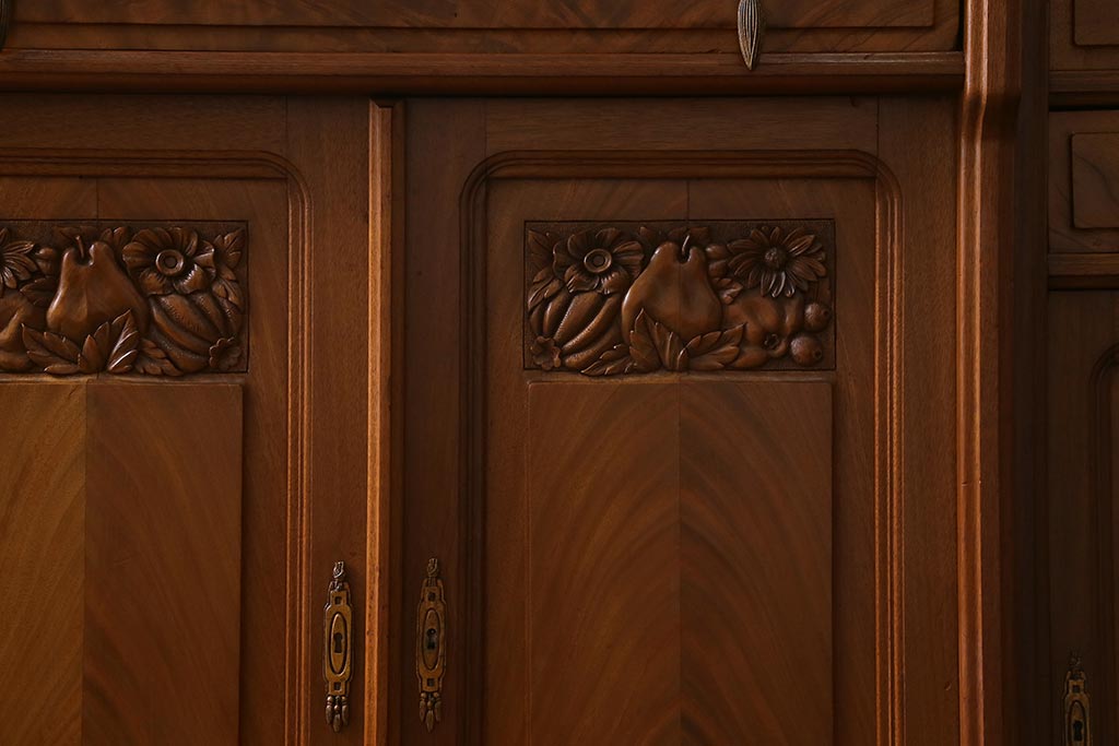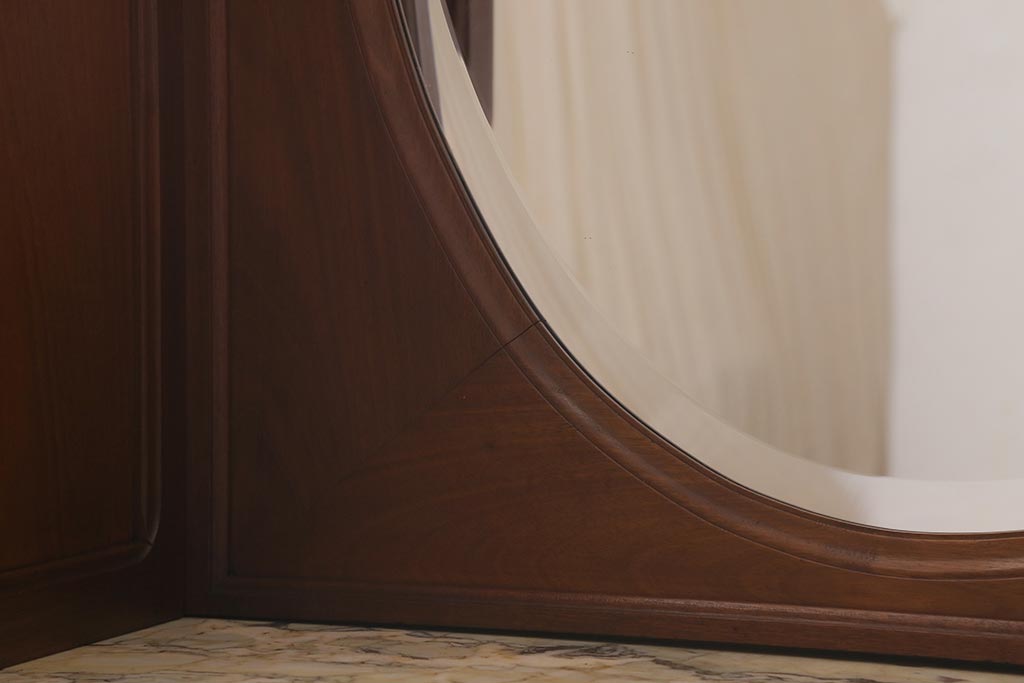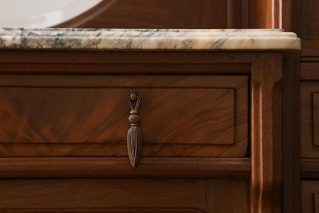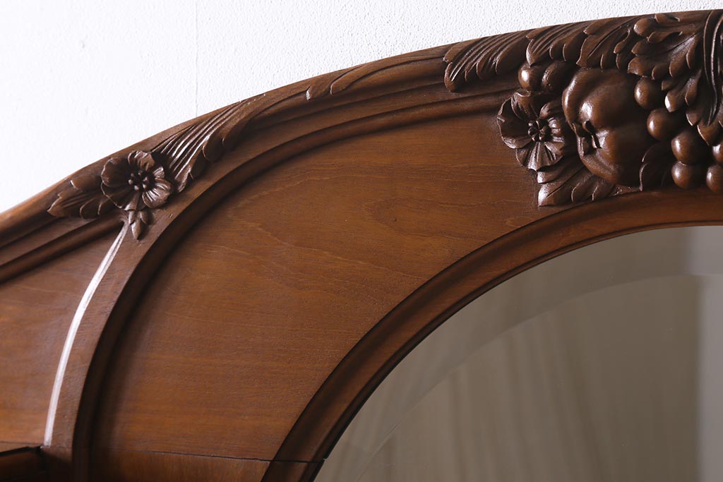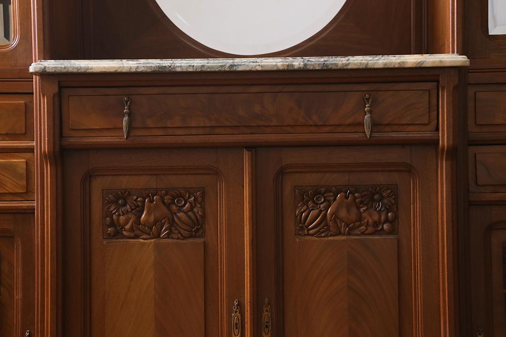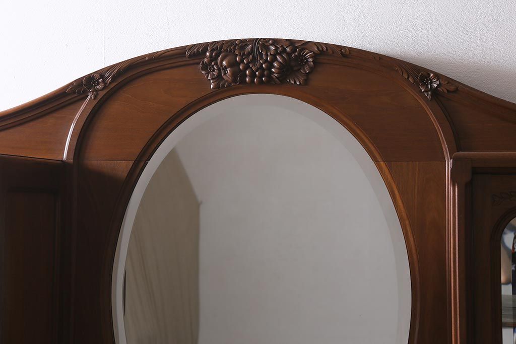 - 正面の大きなミラーや大理石の作業台、果物や花がモチーフの彫刻など、優美で上品なデザインが目を引きます。扉や引き出しの取っ手にも細かな細工が施されており、どこから見ても丁寧なつくりを感じられます。明るいお色味なので、気品あるデザインでありながら生活の中に取り入れやすい温かみも感じられます。