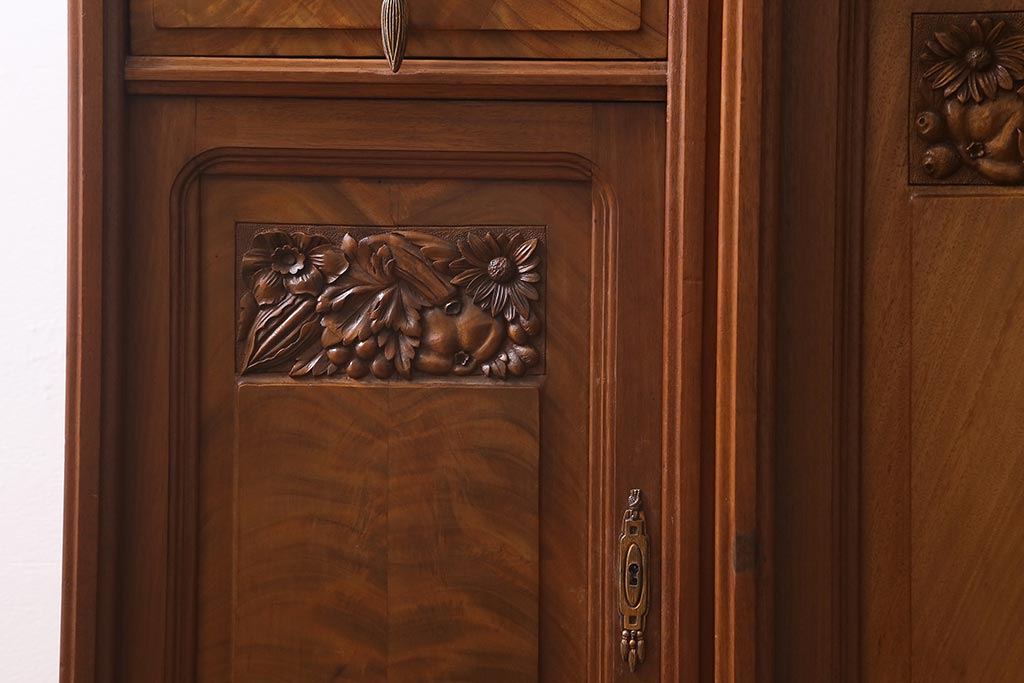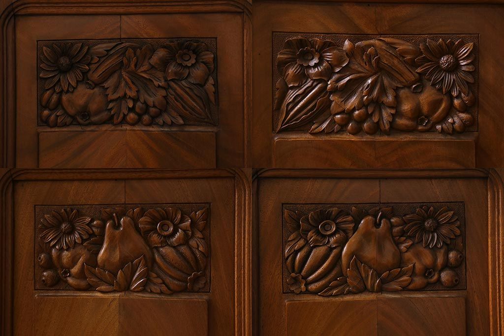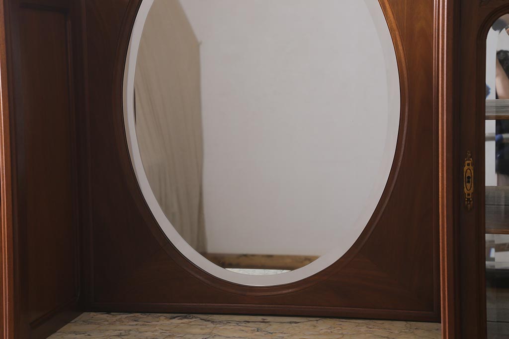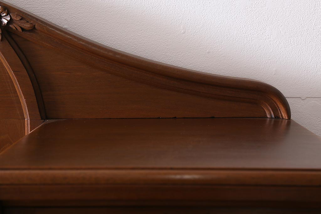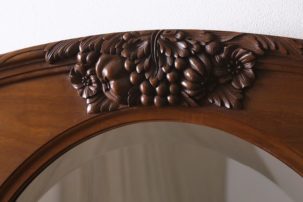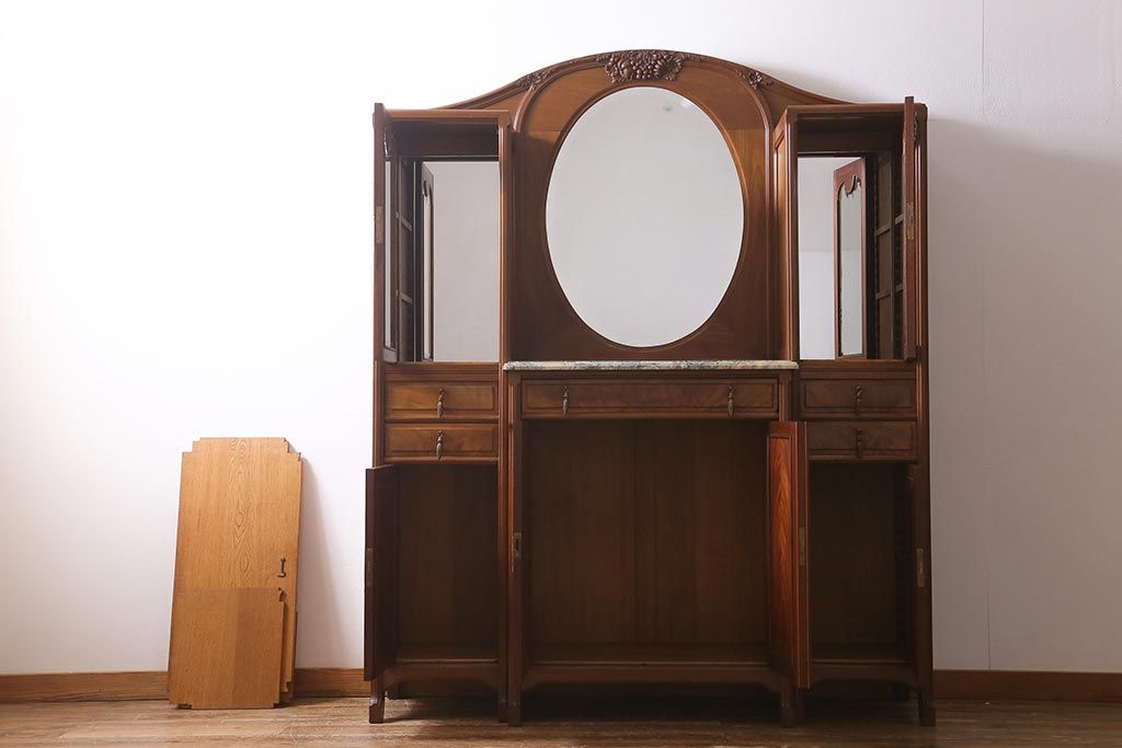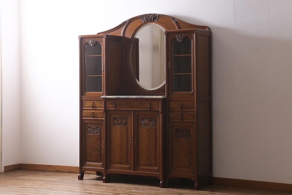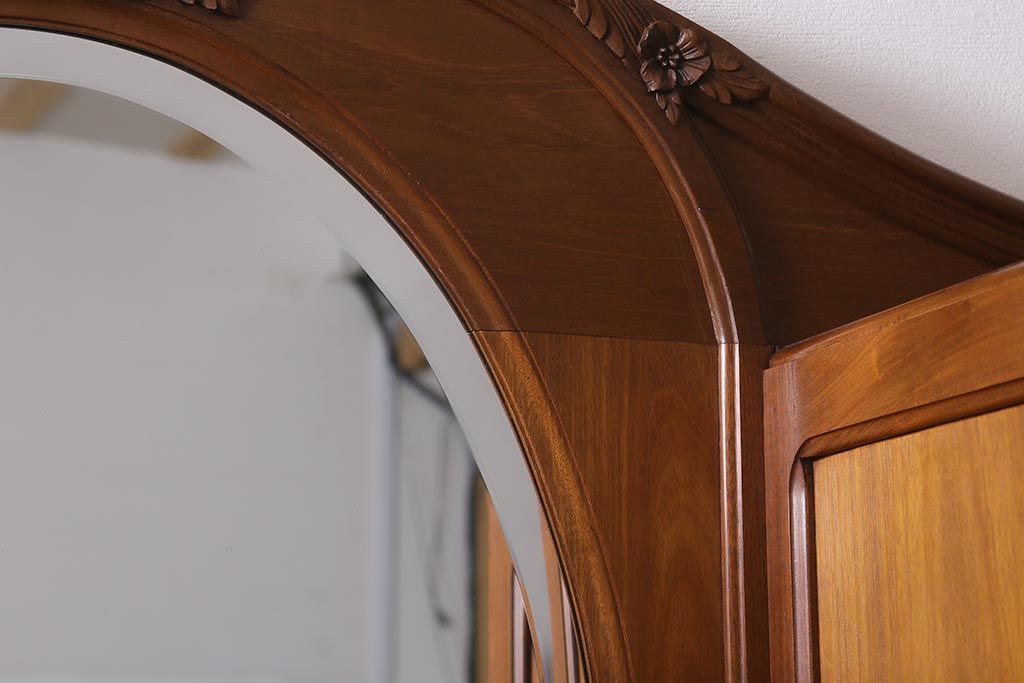 - 正面の大きなミラーや大理石の作業台、果物や花がモチーフの彫刻など、優美で上品なデザインが目を引きます。扉や引き出しの取っ手にも細かな細工が施されており、どこから見ても丁寧なつくりを感じられます。明るいお色味なので、気品あるデザインでありながら生活の中に取り入れやすい温かみも感じられます。