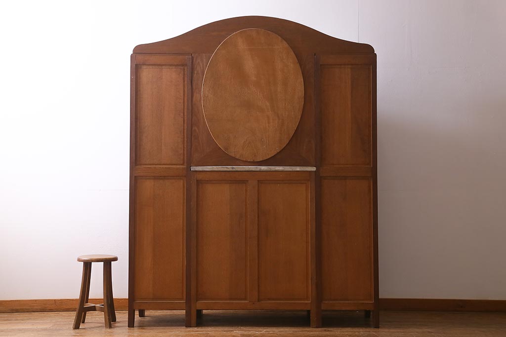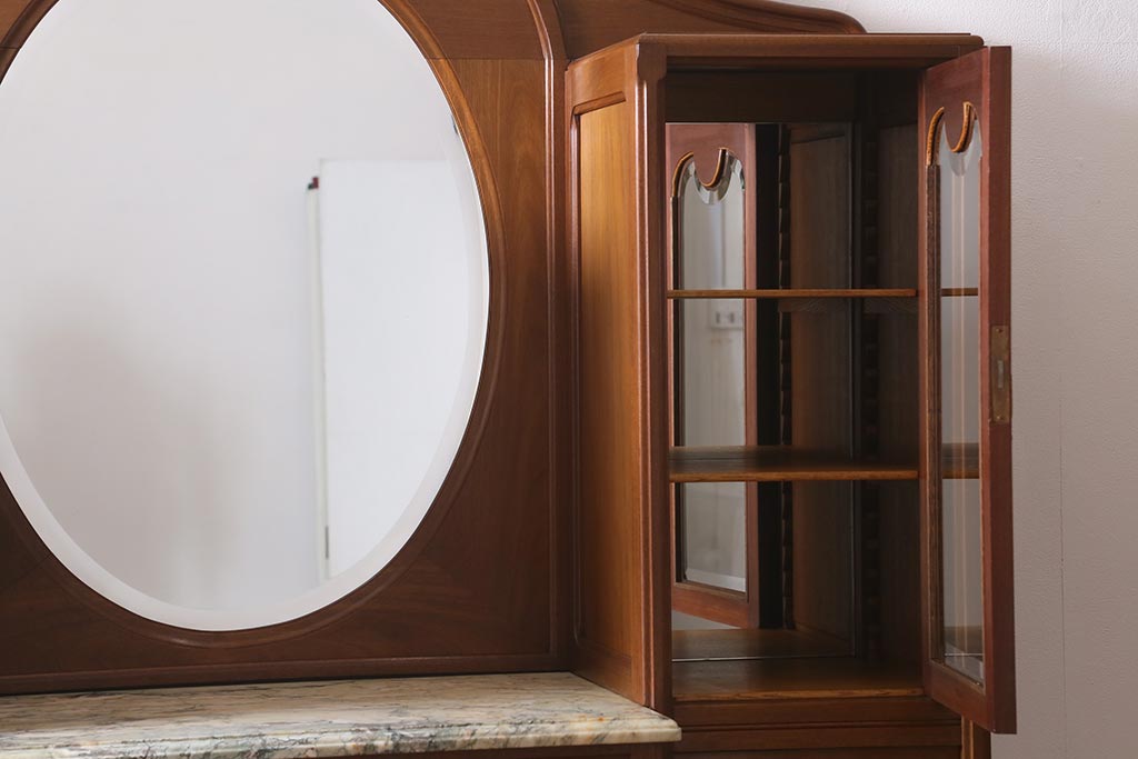 使うほどに味が増していくウォールナット材製のキャビネットです。ラウンド型の大きなミラーや大理石の作業台が、エレガントな雰囲気を醸し出していますね。また、棚数が多く、引き出しも付いているため、実用性も兼ね備えています。クラシカルな雰囲気のお部屋や、アンティークスタイルのお部屋で使えば、優美な雰囲気を盛り上げてくれますよ。
