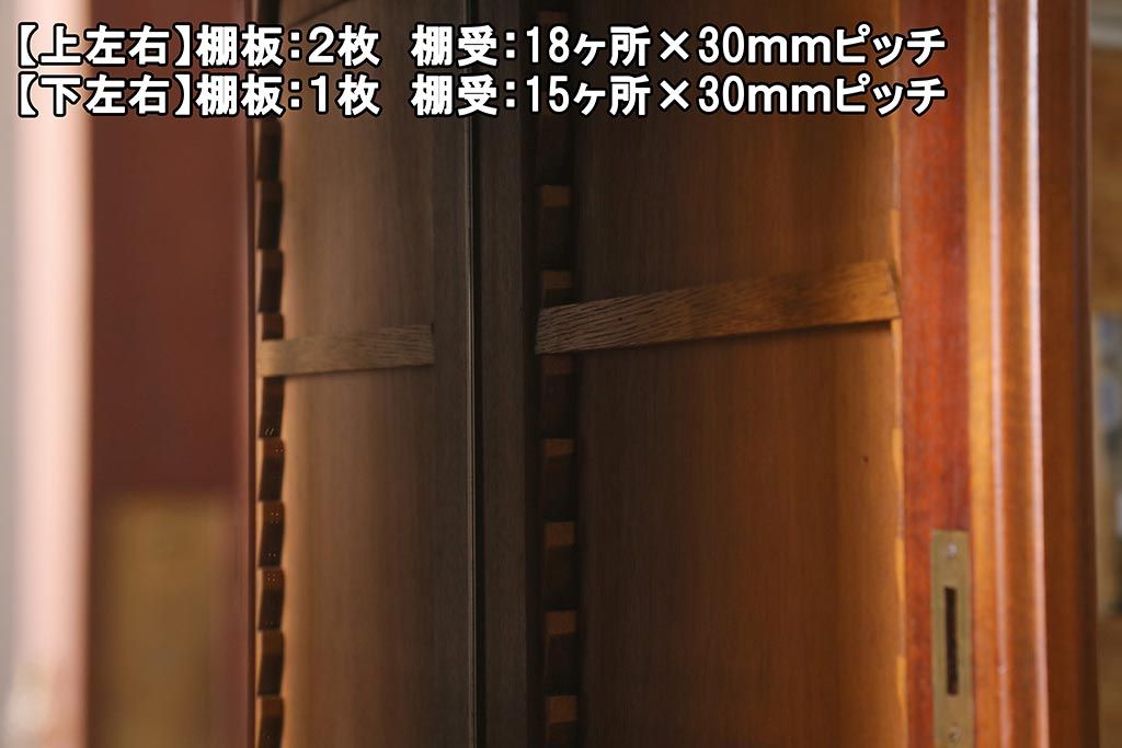 棚板は取り外しできます。上段棚板は左右に各2枚あり、棚受けは各18ヶ所、30mmピッチで調整できます。下段棚板は左右に各1枚あり、棚受けは各15ヶ所、30mmピッチで調整できます。棚幅サイズのものが1枚の作りです。