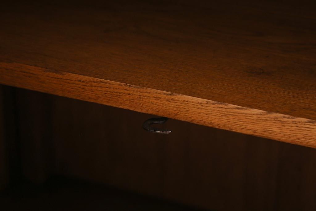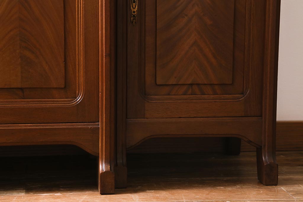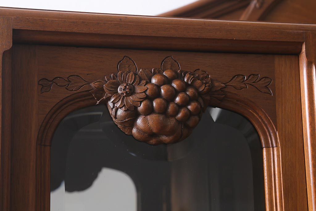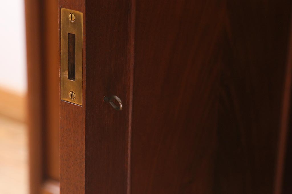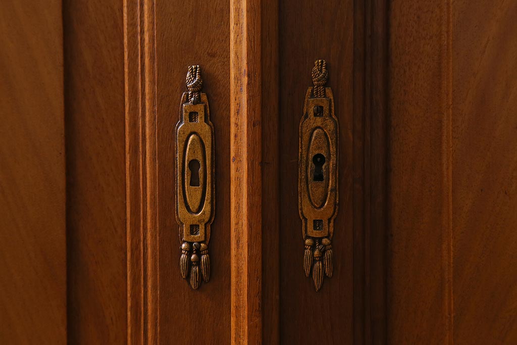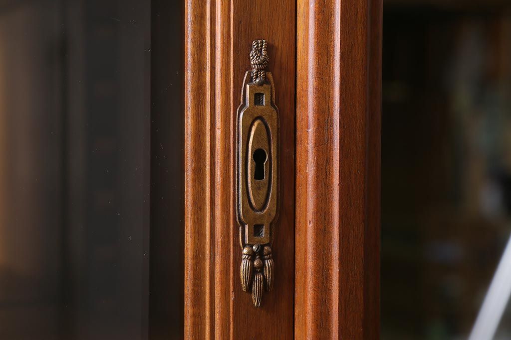 ガラス戸の棚には鍵をかけることもできます。アンティーク品らしいクラシカルなデザインが可愛いですね。
