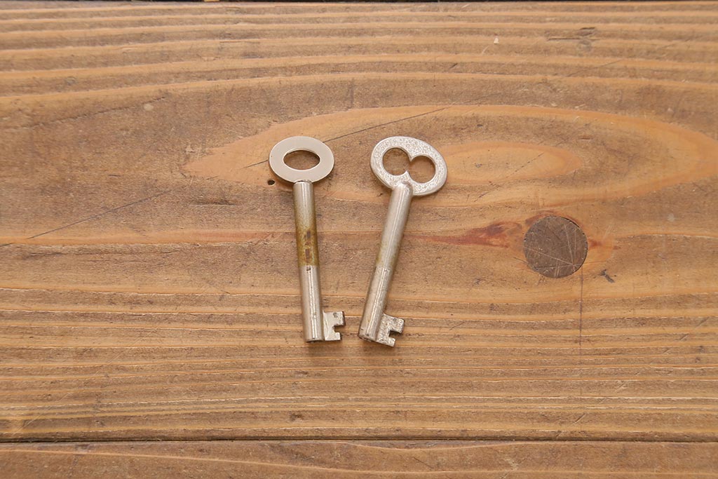 鍵は付属します。画像にありますように、袋に入れお付けします。スムーズに動くように調整していますが、あくまでも古いものや中古品ですので、長期の使用保証は出来かねます。ご購入後不具合が発生した場合は、当店でサポートさせていただきますので、お気軽にご相談くださいませ。