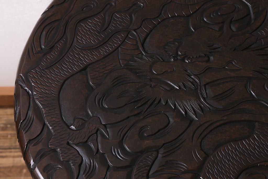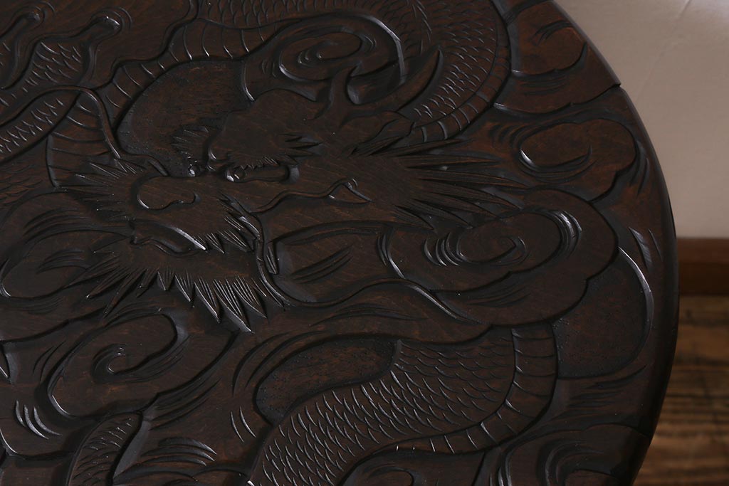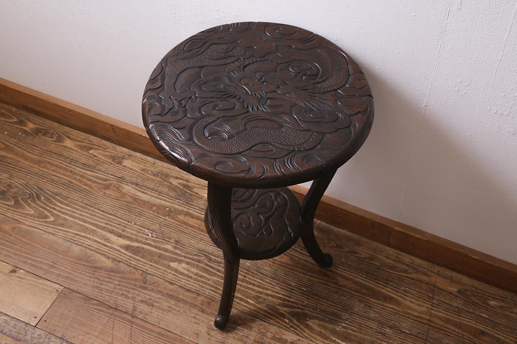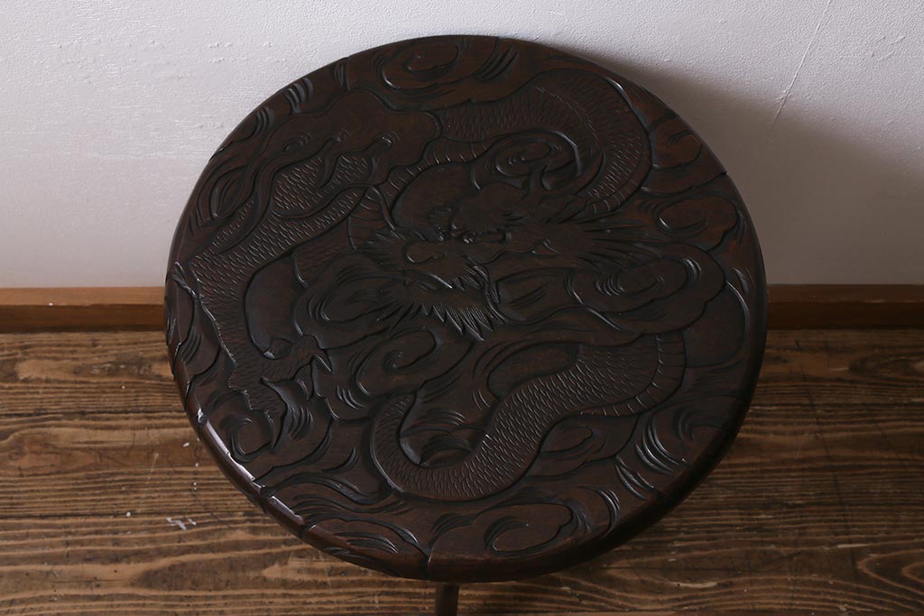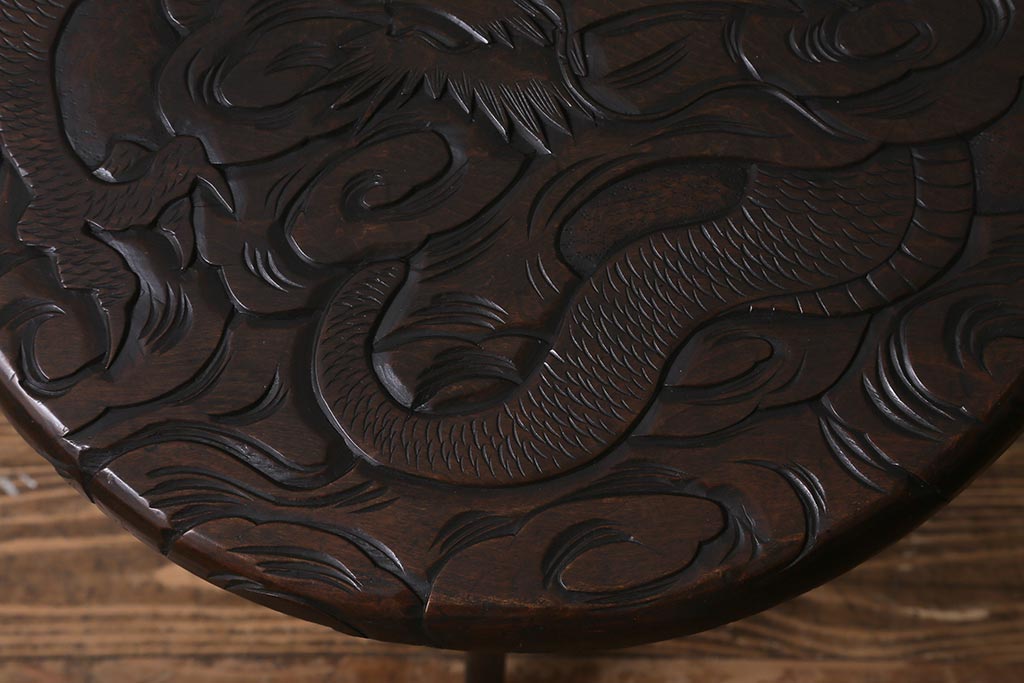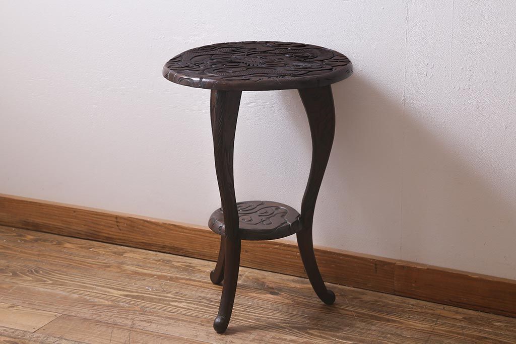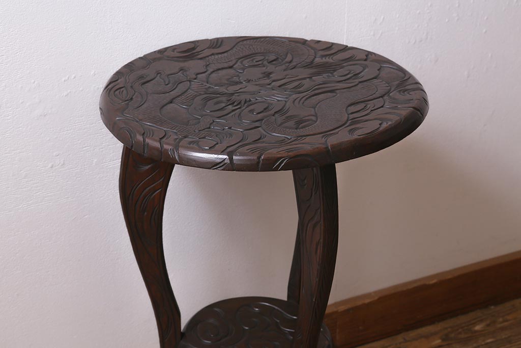 テーブル> 丸テーブル > 中古 伝統工芸 日光彫り 龍雲図 迫力ある彫刻のサイドテーブル(花台、飾り台)(R-039721)