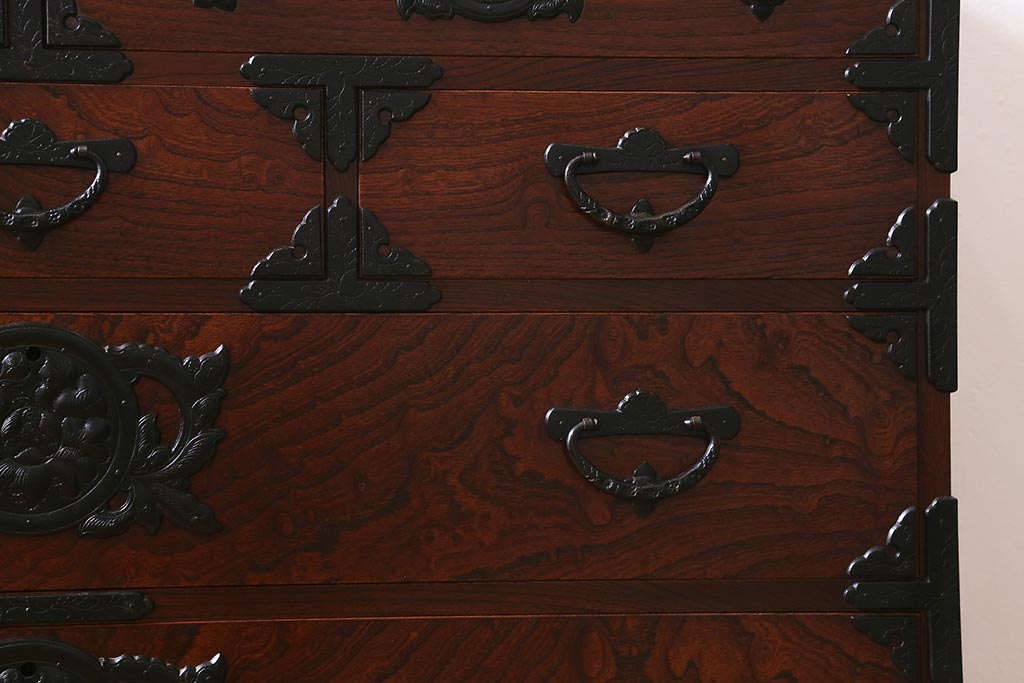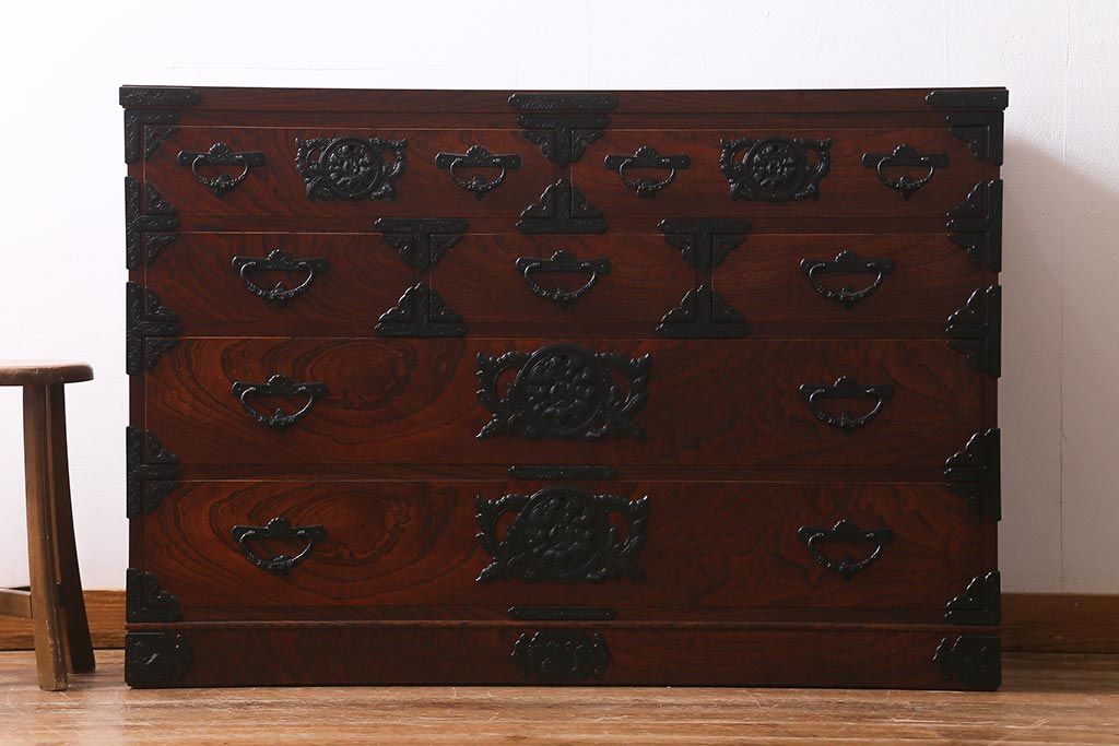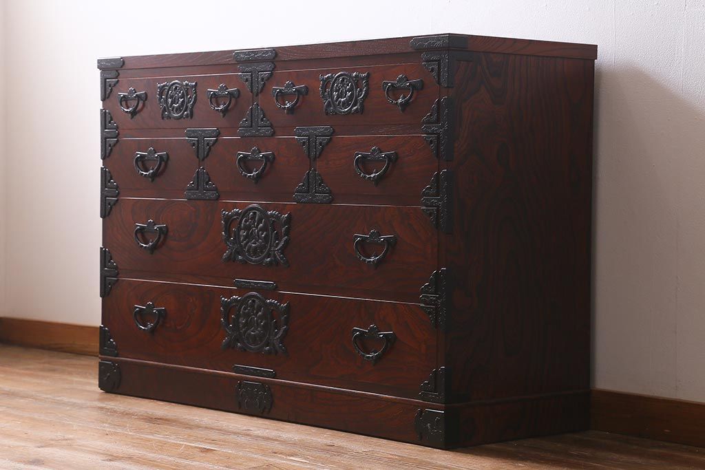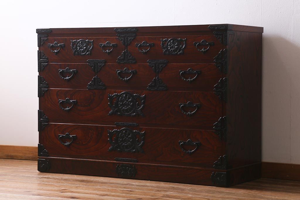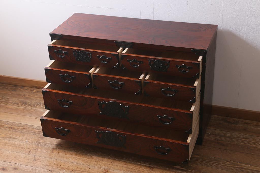 和箪笥> 衣装箪笥 > 中古 伝統民芸家具 岩谷堂箪笥 前板ケヤキ無垢材 菊幸 37 ローチェストN 華やかな意匠の四尺整理箪笥(衣装箪笥、整理タンス)(定価約46万円)(R-039741)