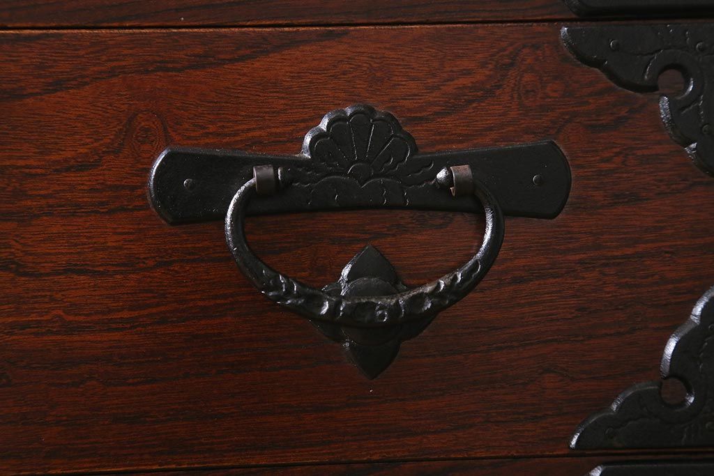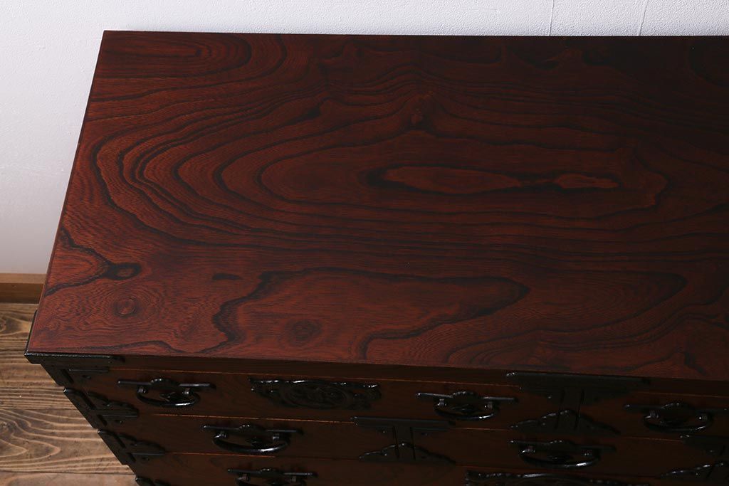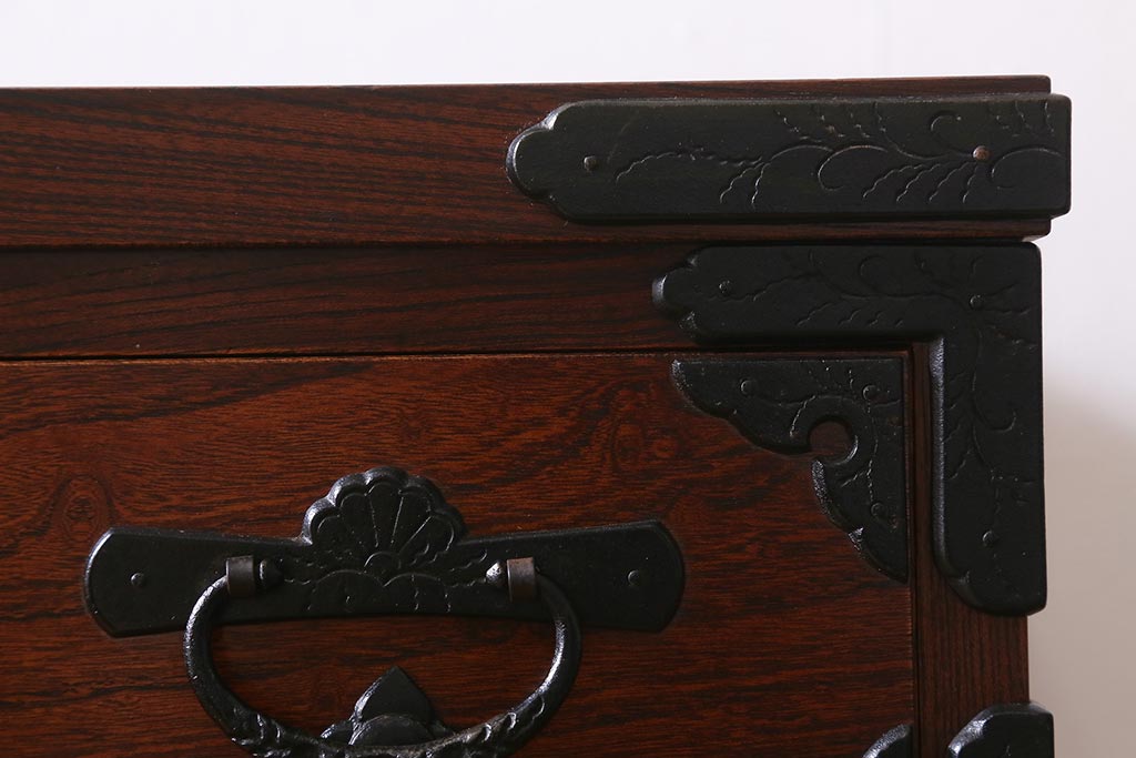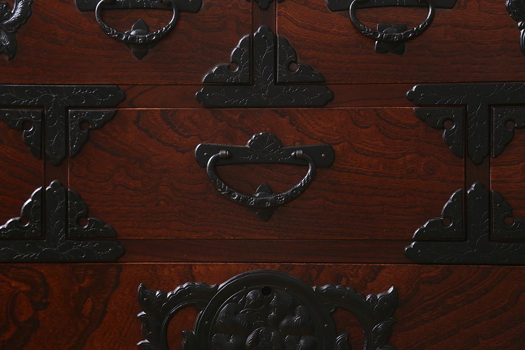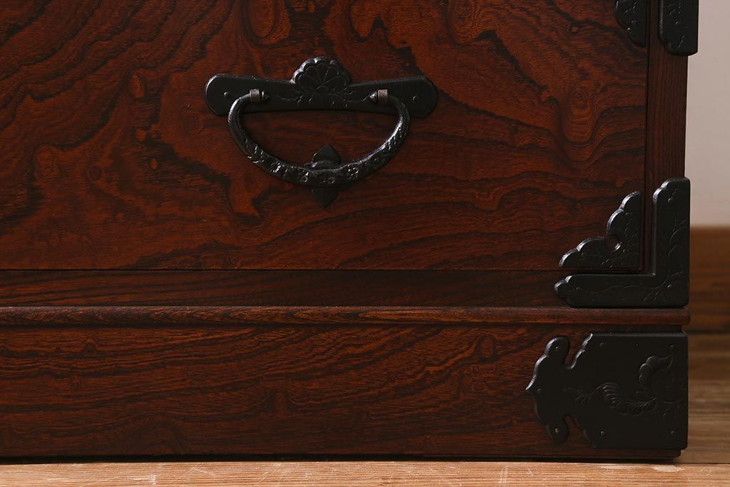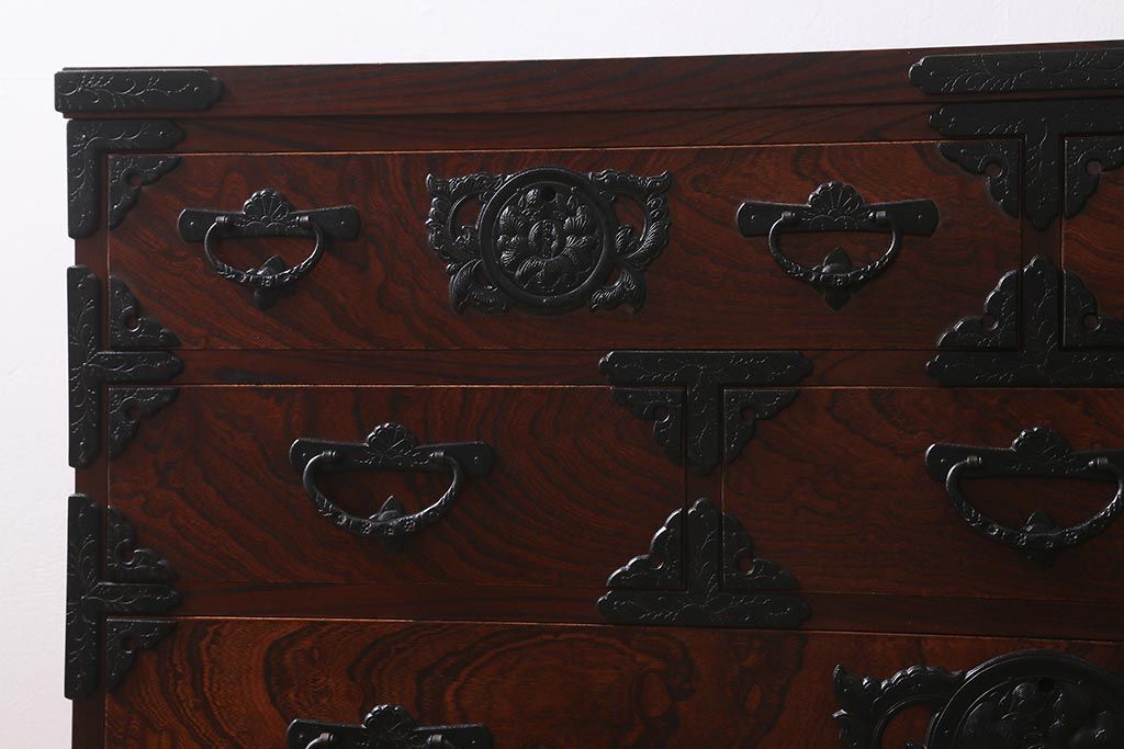 和箪笥> 衣装箪笥 > 中古 伝統民芸家具 岩谷堂箪笥 前板ケヤキ無垢材 菊幸 37 ローチェストN 華やかな意匠の四尺整理箪笥(衣装箪笥、整理タンス)(定価約46万円)(R-039741)