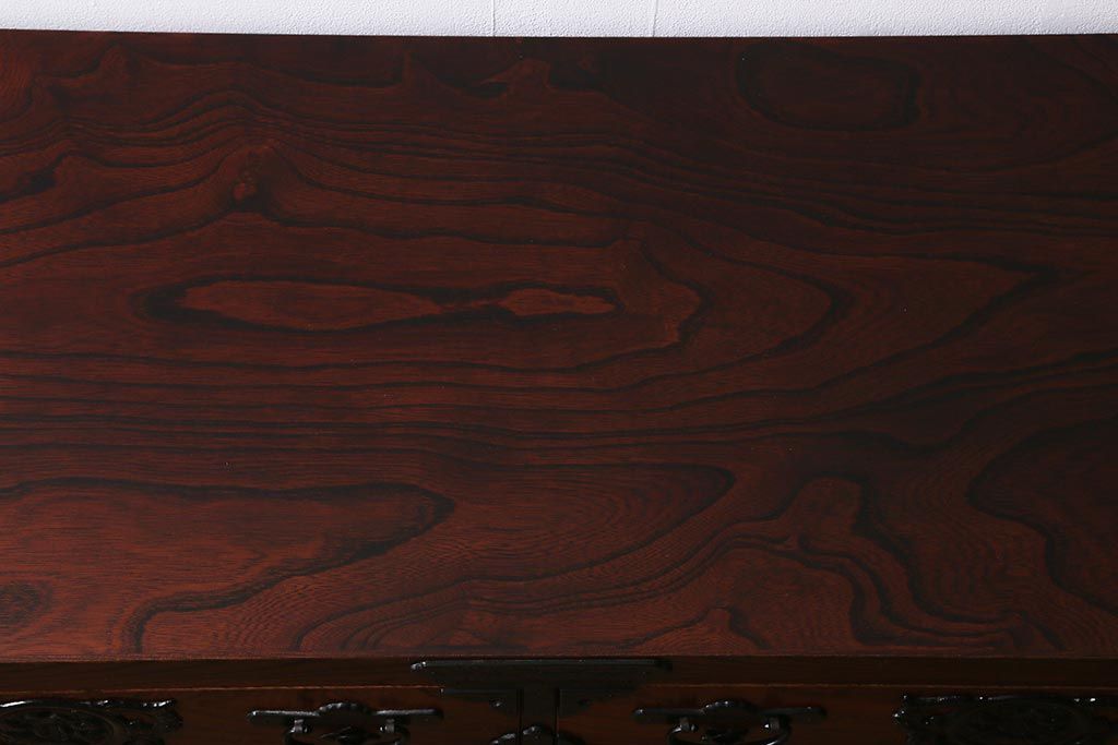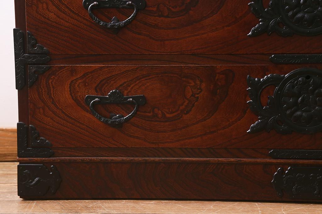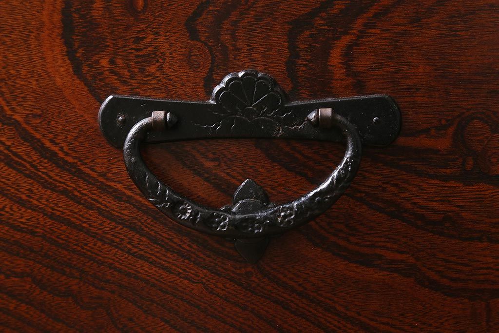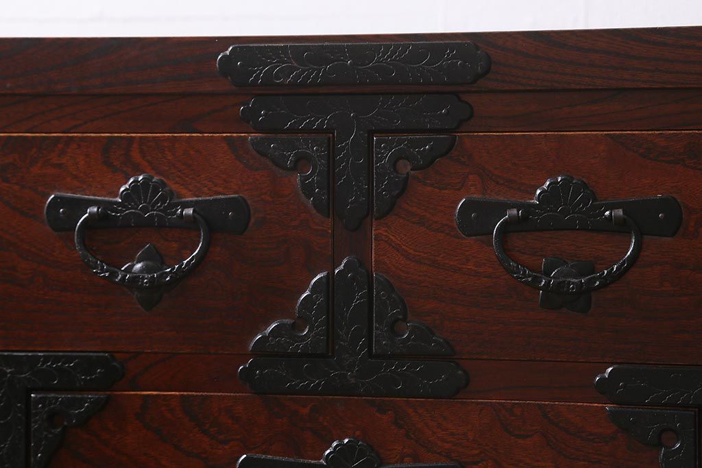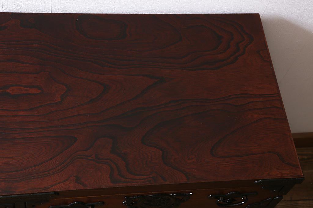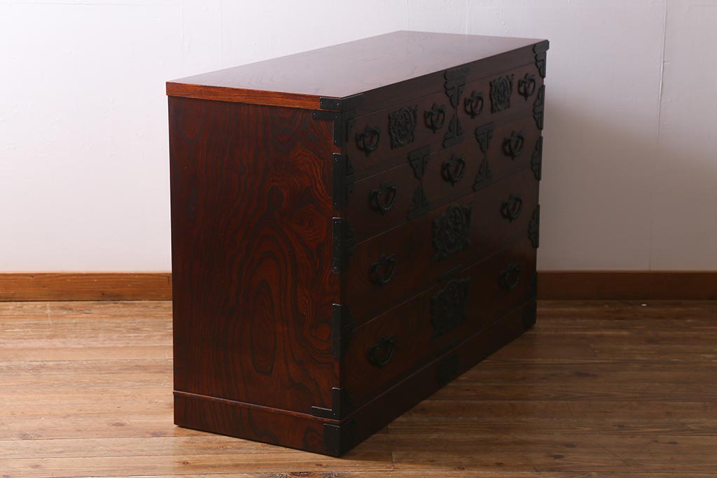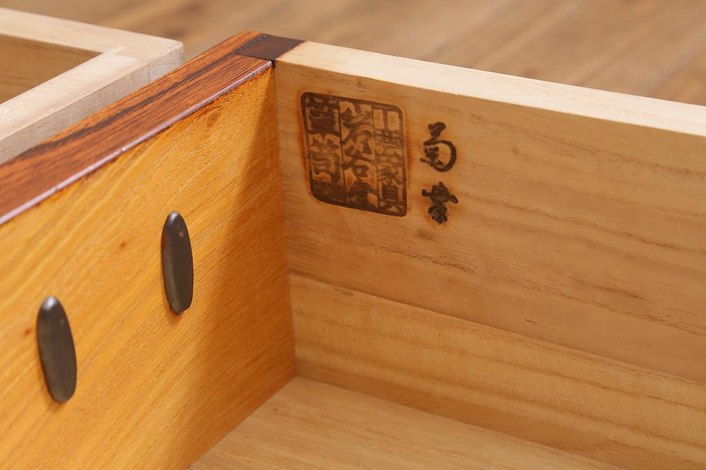 キャビネット・戸棚> テレビ台・ローボード > 中古 伝統民芸家具 岩谷堂箪笥 前板ケヤキ無垢材 菊幸 37 ローチェストN 華やかな意匠の四尺整理箪笥(衣装箪笥、整理タンス)(定価約46万円)(R-039741)