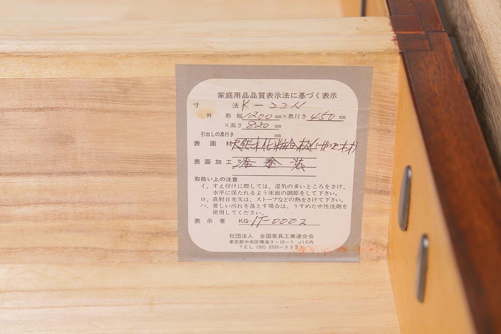 キャビネット・戸棚> サイドボード > 中古 伝統民芸家具 岩谷堂箪笥 前板ケヤキ無垢材 菊幸 37 ローチェストN 華やかな意匠の四尺整理箪笥(衣装箪笥、整理タンス)(定価約46万円)(R-039741)