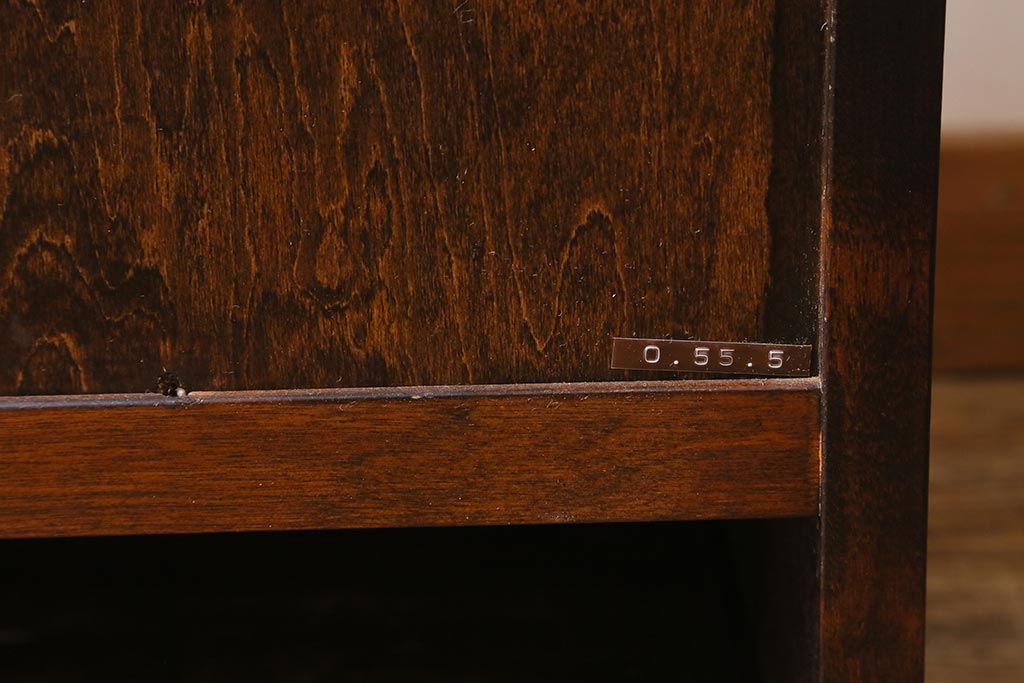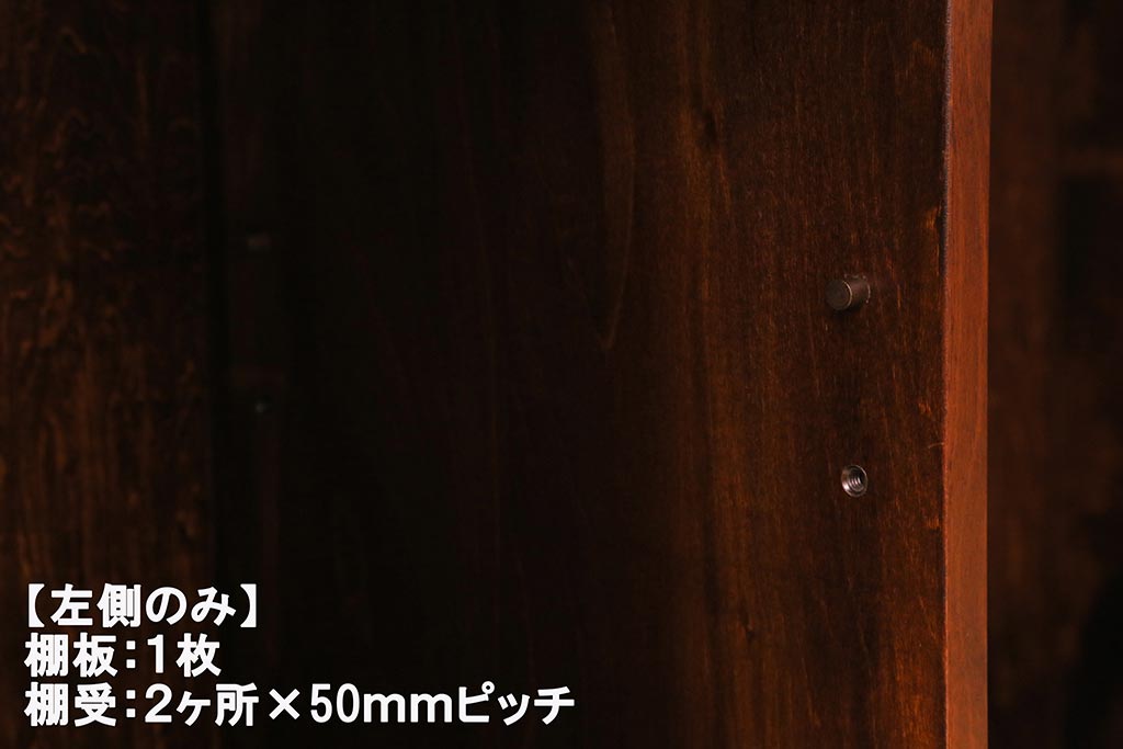 左側の棚板は取り外しできます。棚板は1枚あります。棚受けは2ヶ所、50mmピッチで調整できます。棚幅サイズのものが1枚の作りです。