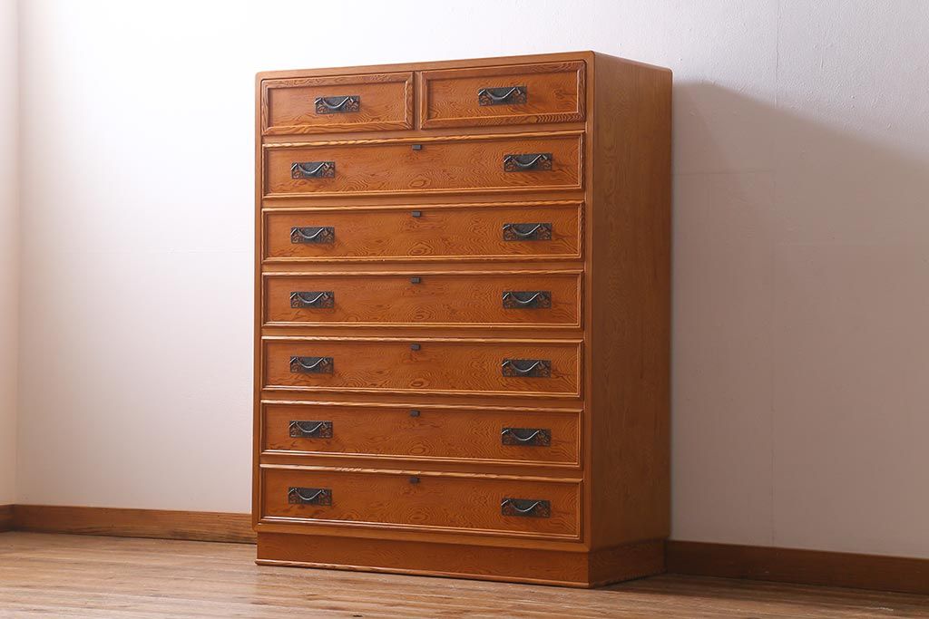 中古 民芸家具 屋久杉 中桐材 波打つような美しい木目に上品な金具が映えるチェスト(衣装箪笥、引き出し)(R-039814)です。