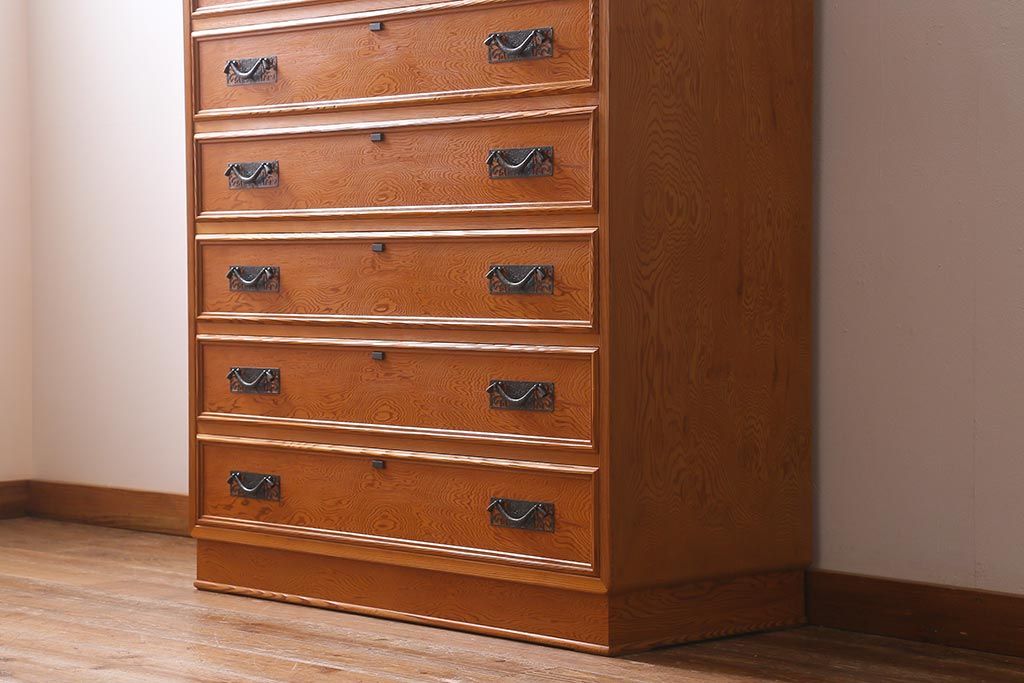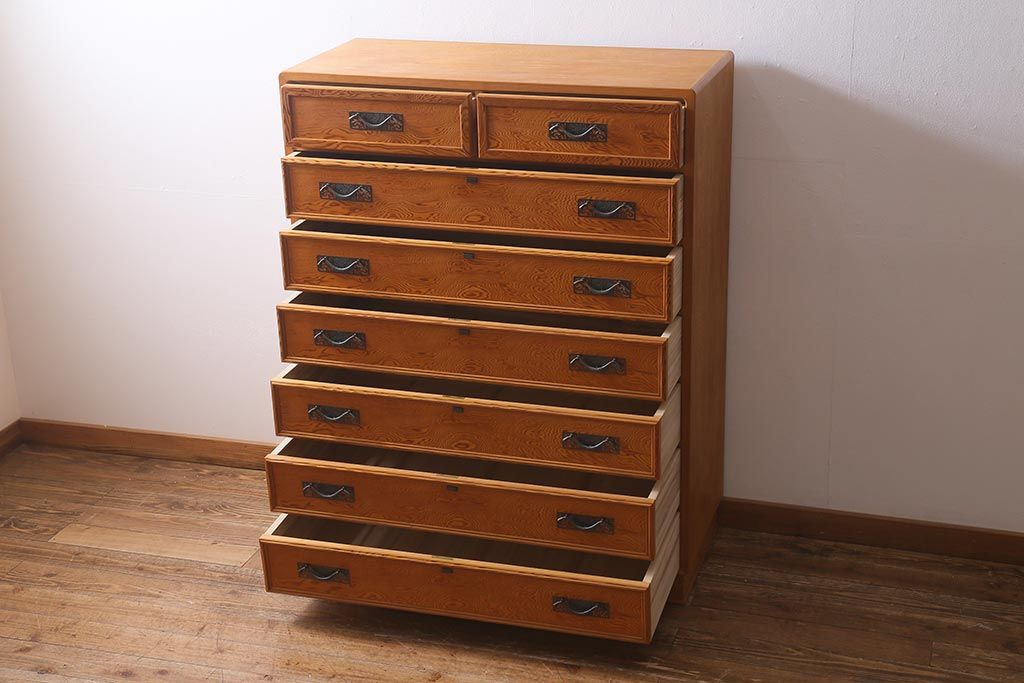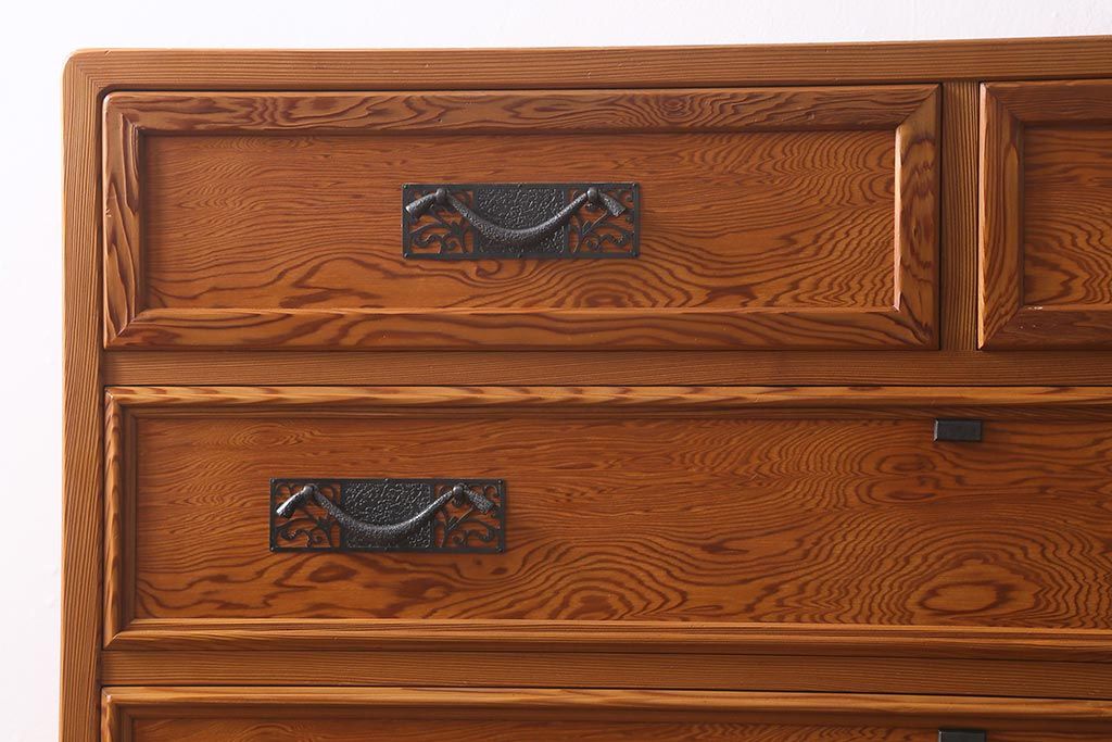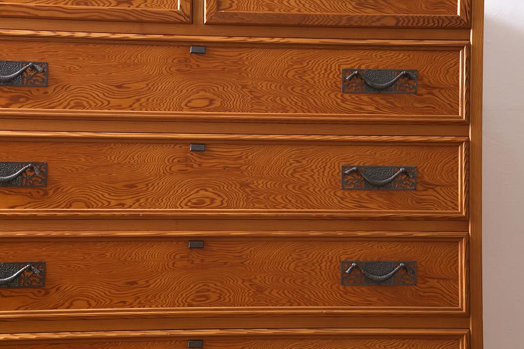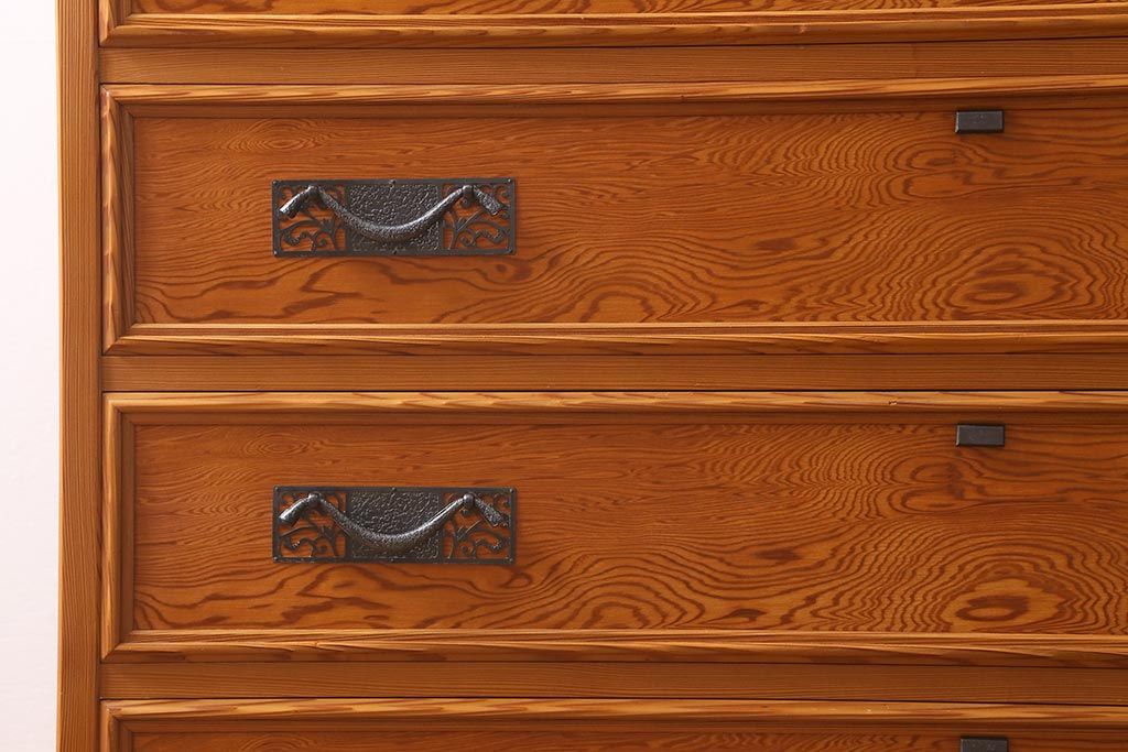 和箪笥> 衣装箪笥 > 中古 民芸家具 屋久杉 中桐材 波打つような美しい木目に上品な金具が映えるチェスト(衣装箪笥、引き出し、桐箪笥、桐たんす)(R-039814)