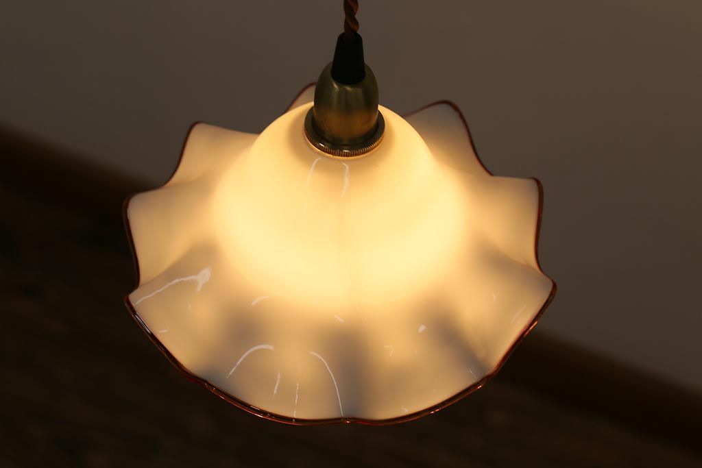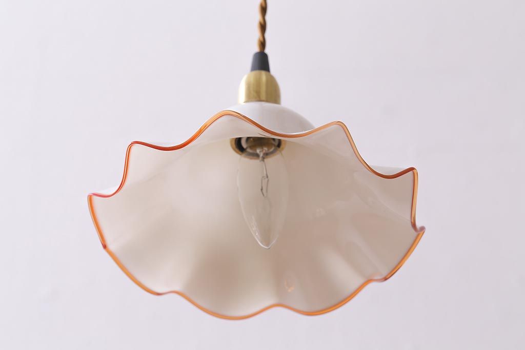 イギリスヴィンテージ照明 橙縁フリルが可愛いミルクガラスペンダントライト(ランプシェード、天井照明、ビンテージ、吊り下げ照明)(R-039914)です。