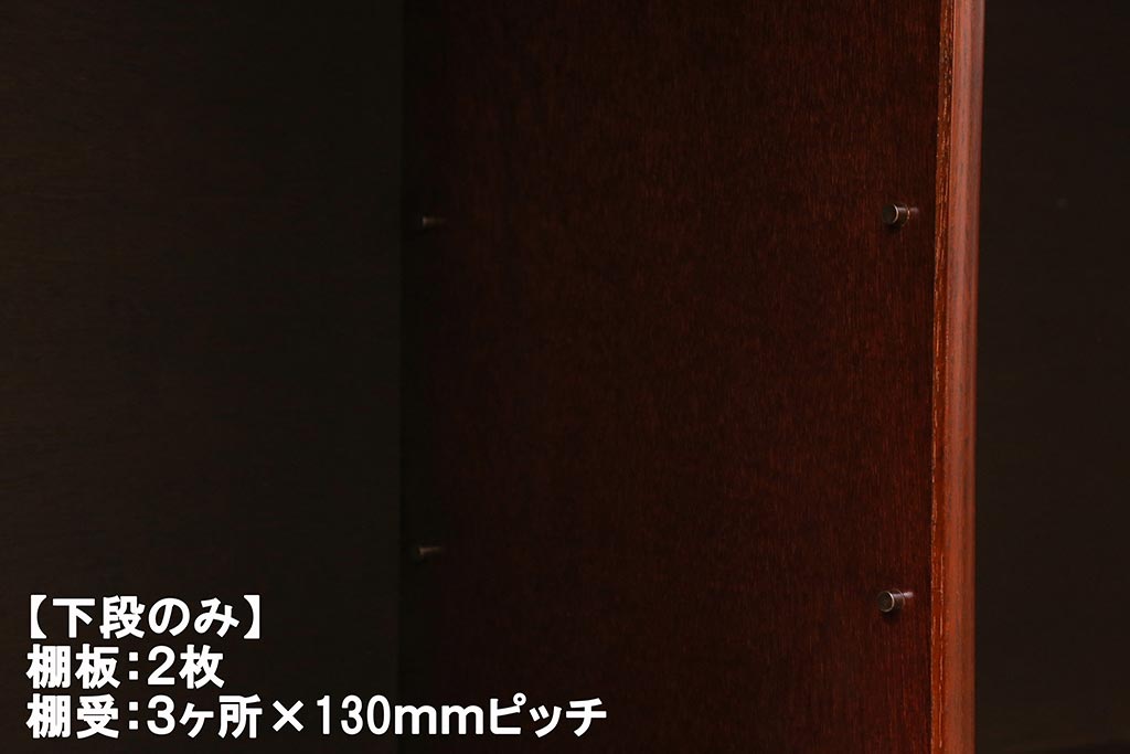 棚板は取り外しできます。棚板は上段1枚、下段2枚あります。下段のみ棚受けは3ヶ所、130mmピッチで調整できます。棚幅サイズのものが1枚の作りです。