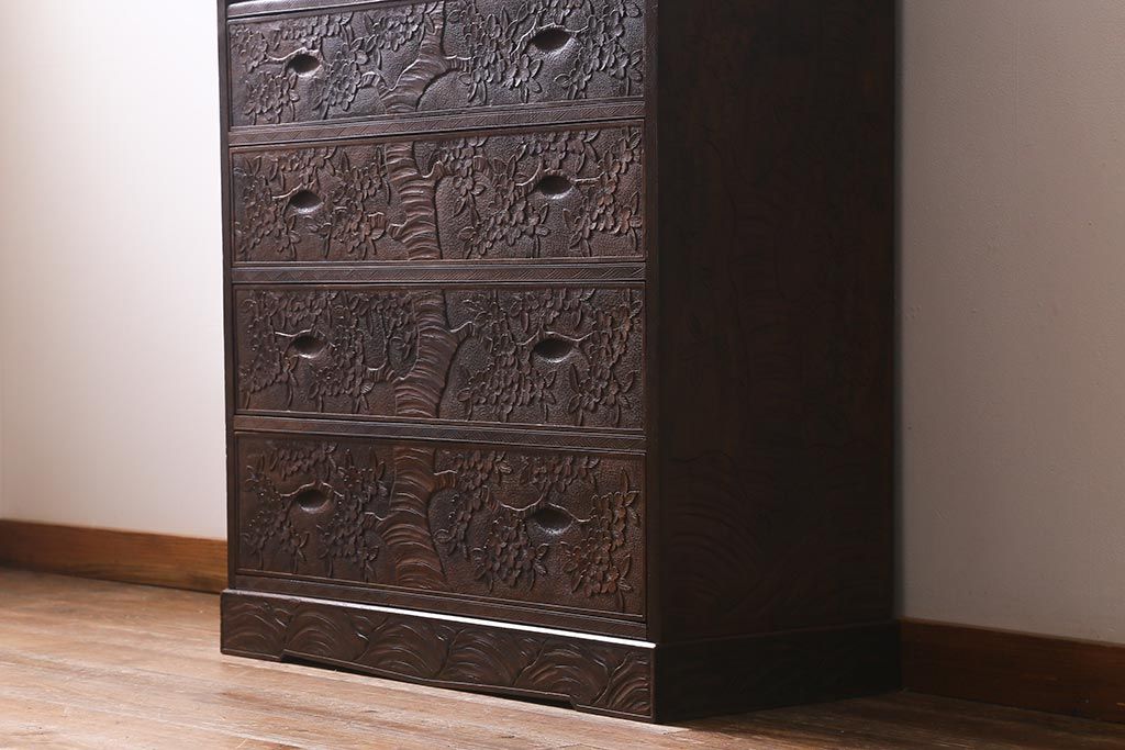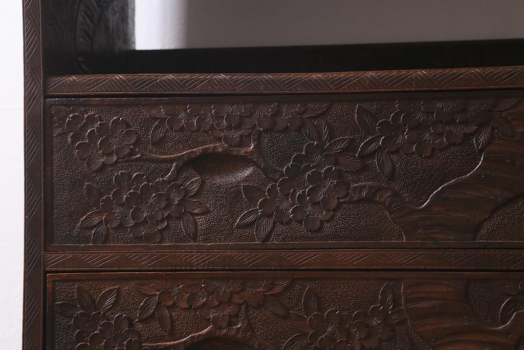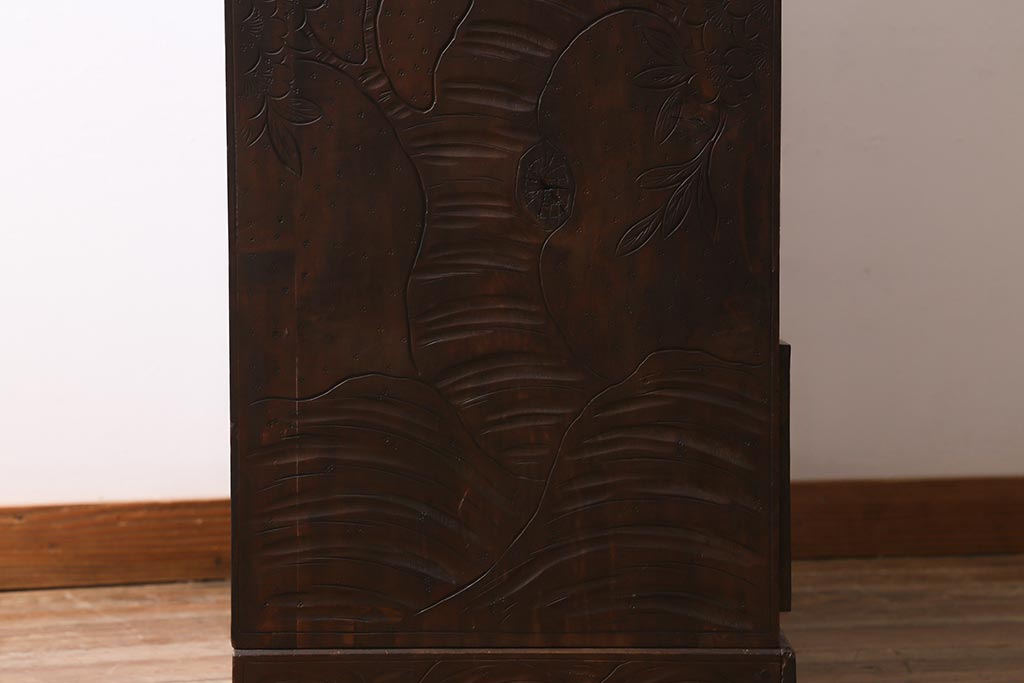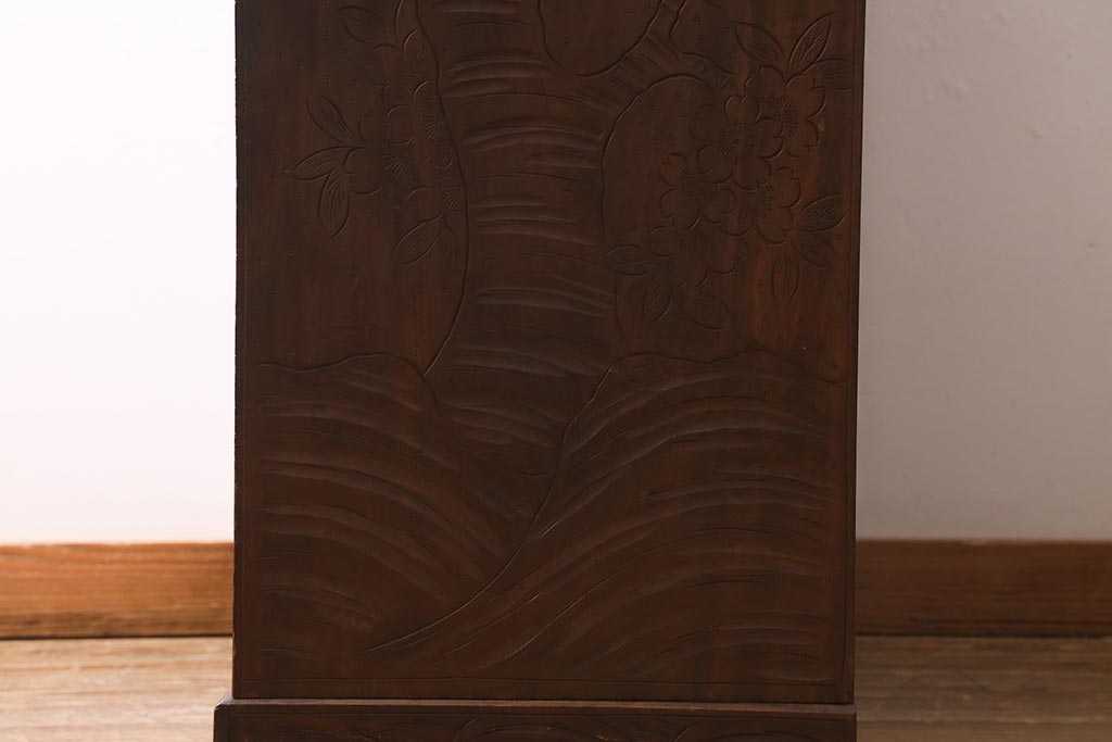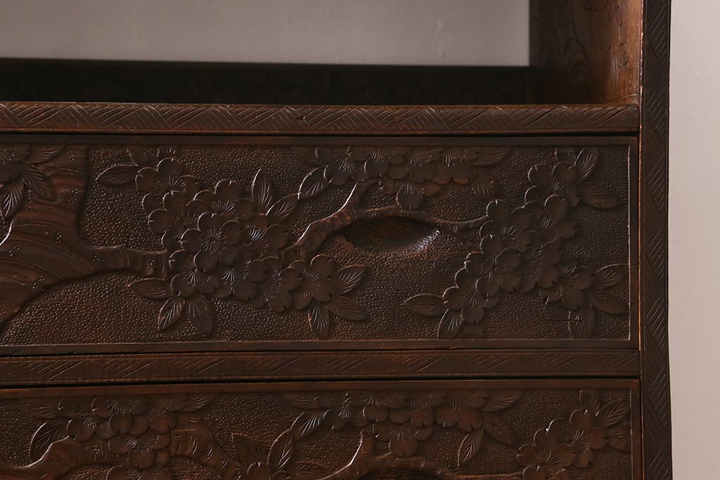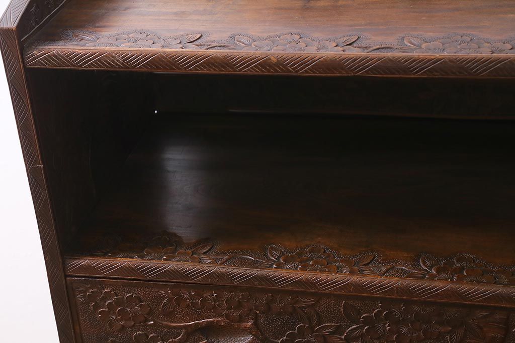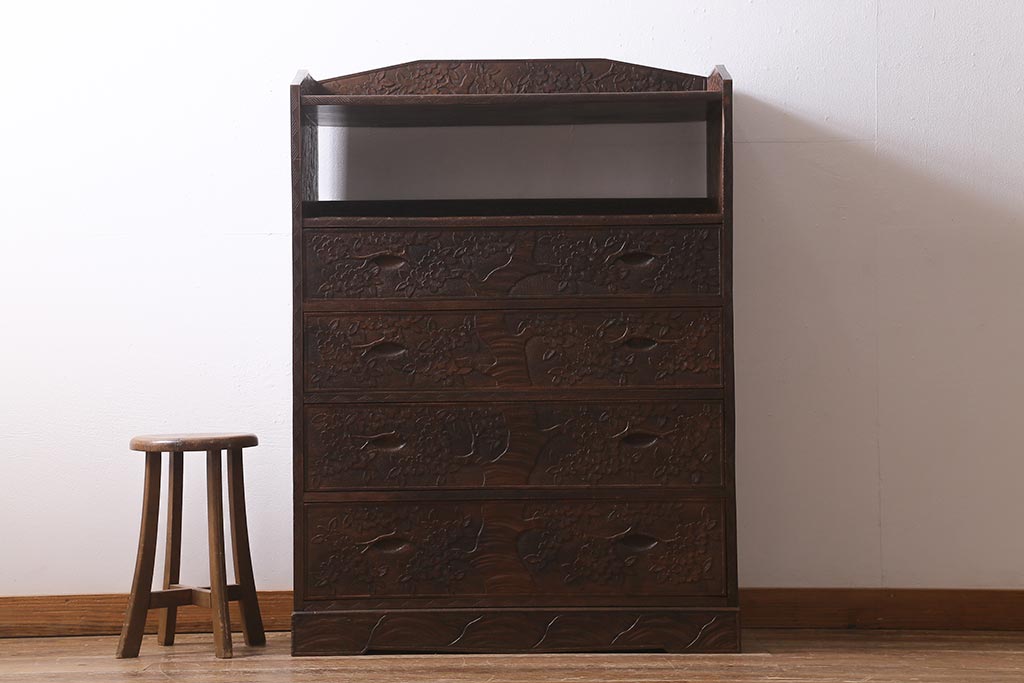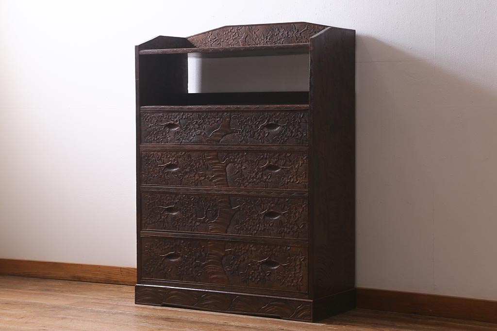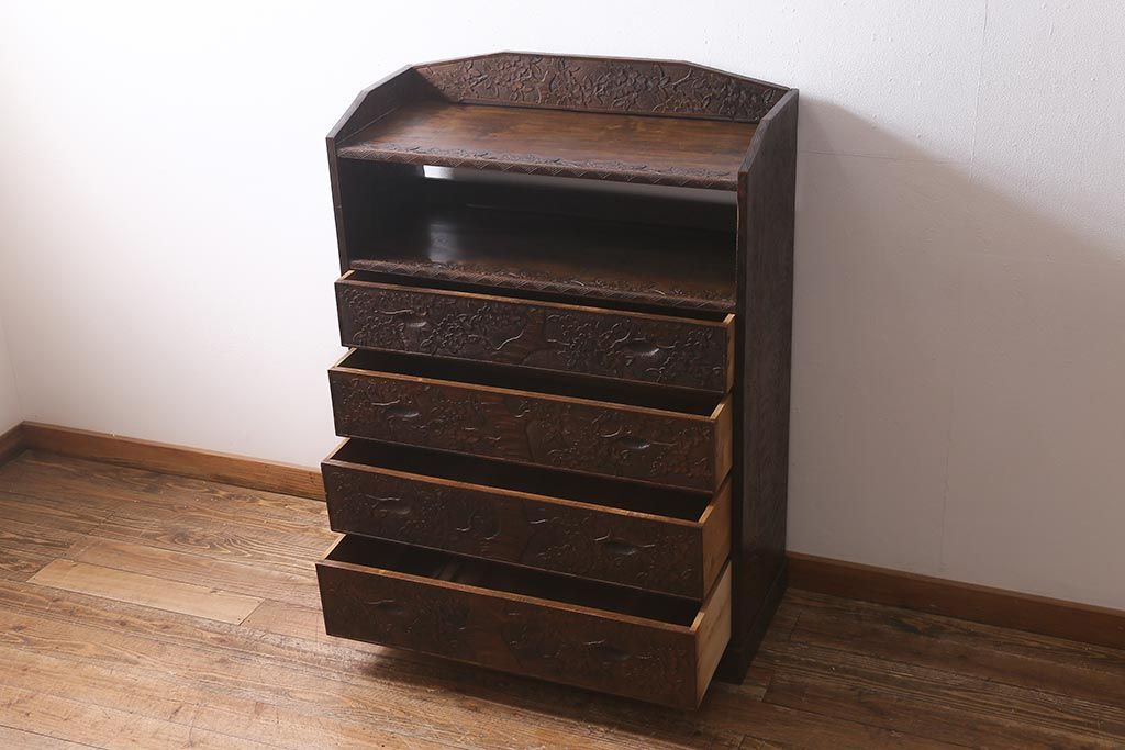 ラフジュ工房> 民芸家具 > ビンテージ家具 伝統工芸 軽井沢彫り 繊細な彫りが豪華さを演出する棚付きチェスト(衣装タンス、引き出し)(R-039943)