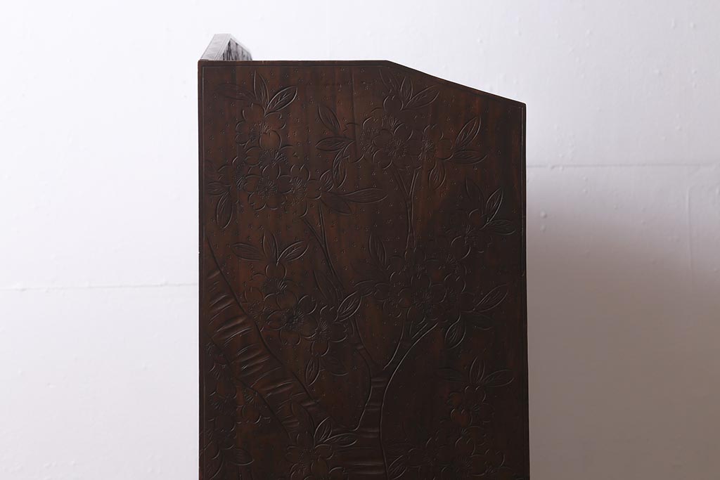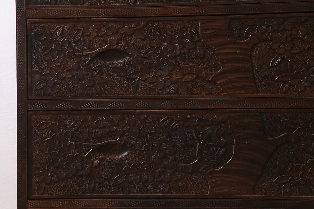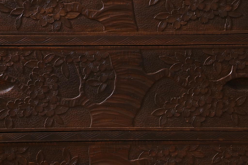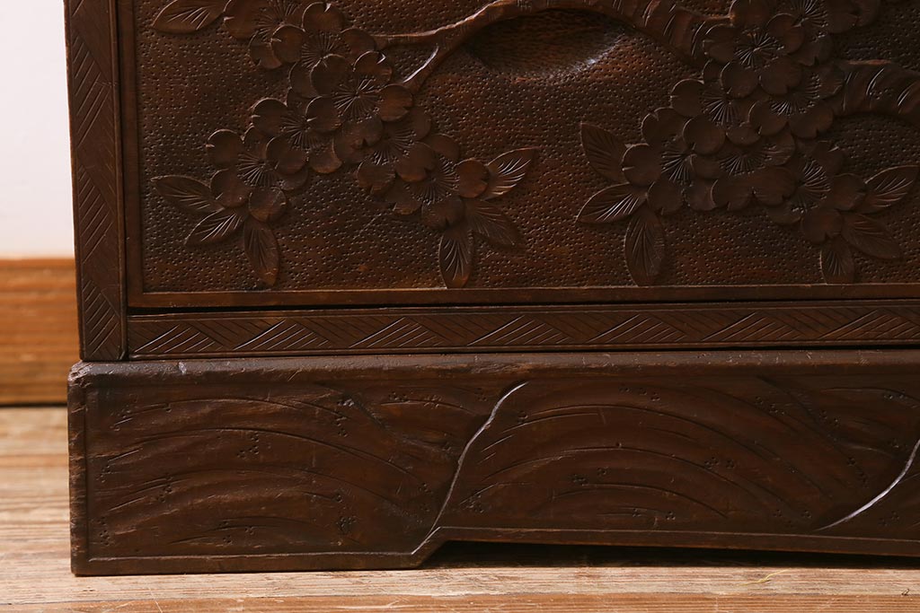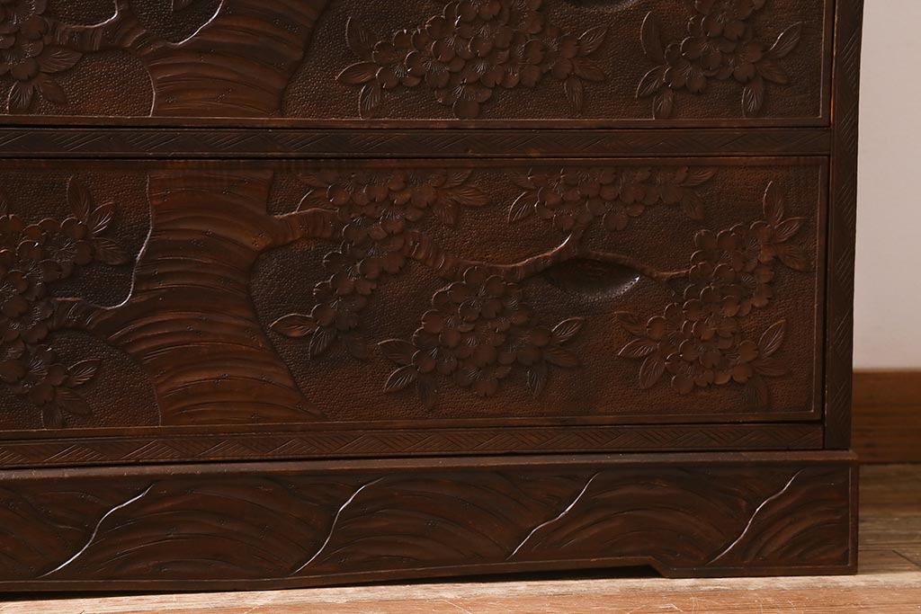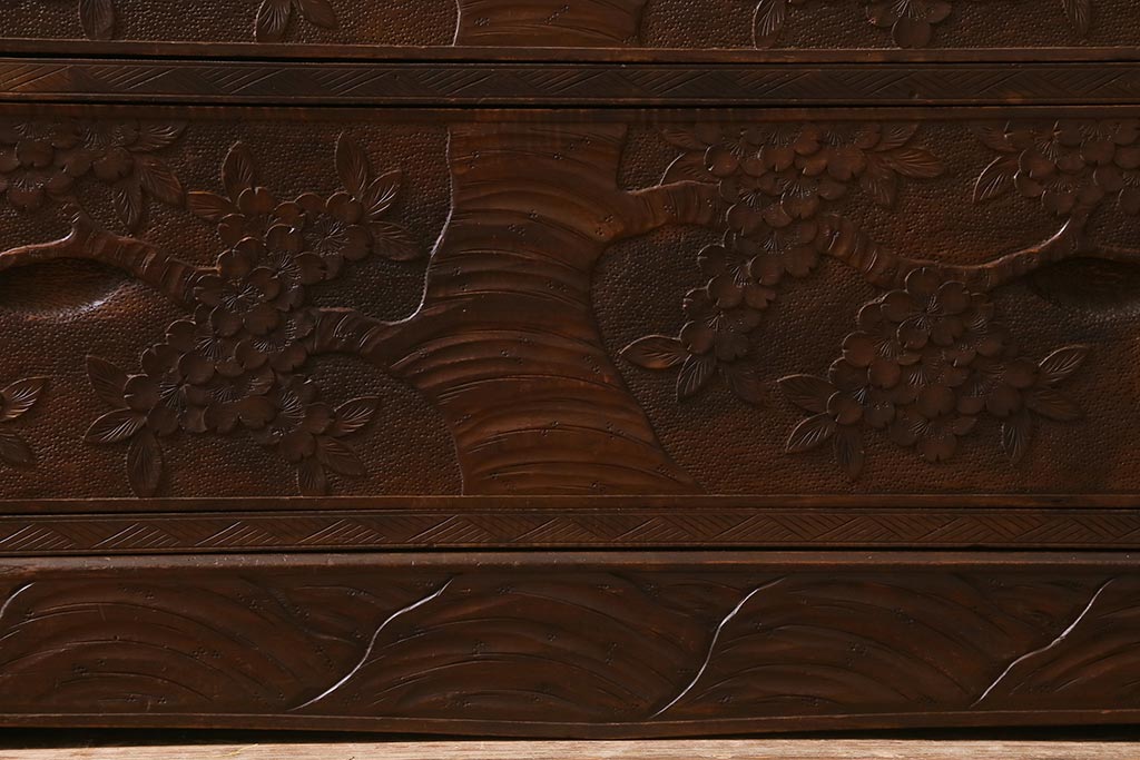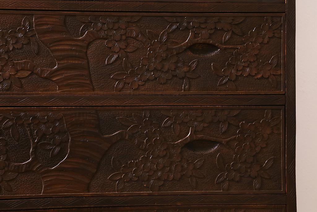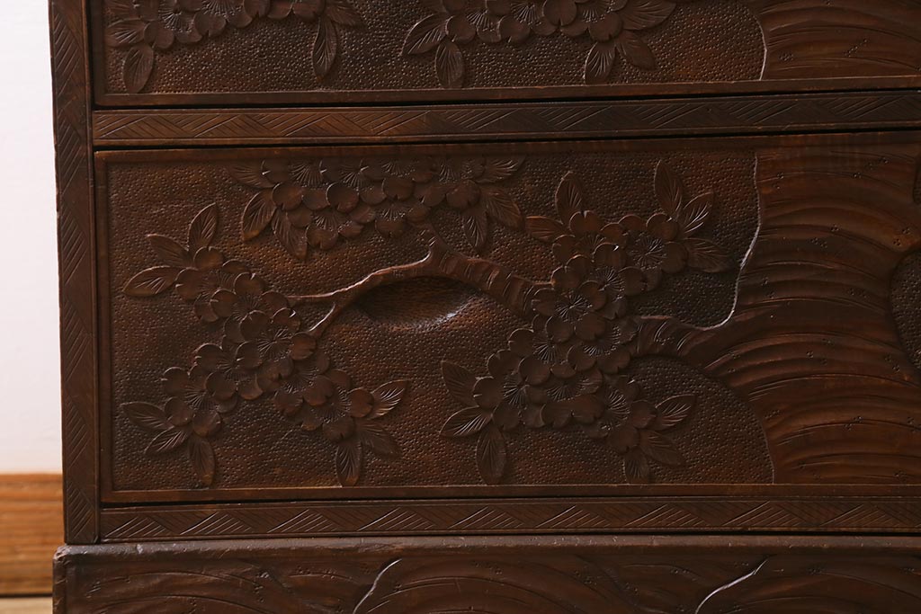 ラフジュ工房> 民芸家具 > ビンテージ家具 伝統工芸 軽井沢彫り 繊細な彫りが豪華さを演出する棚付きチェスト(衣装タンス、引き出し)(R-039943)