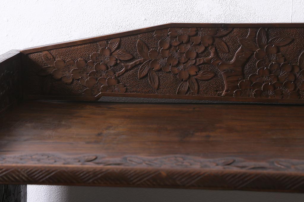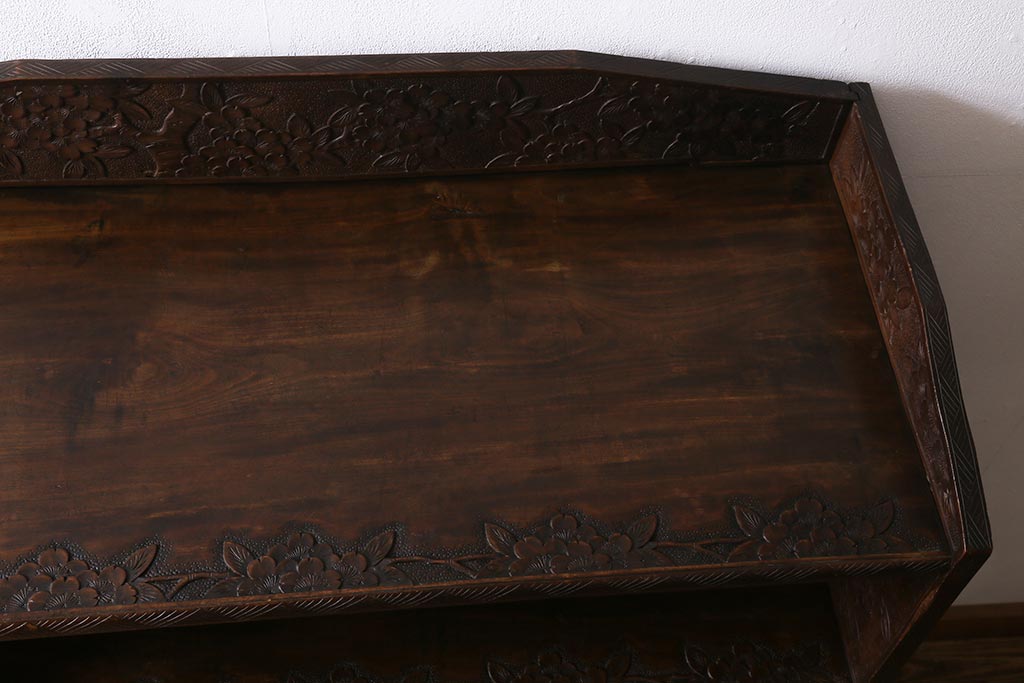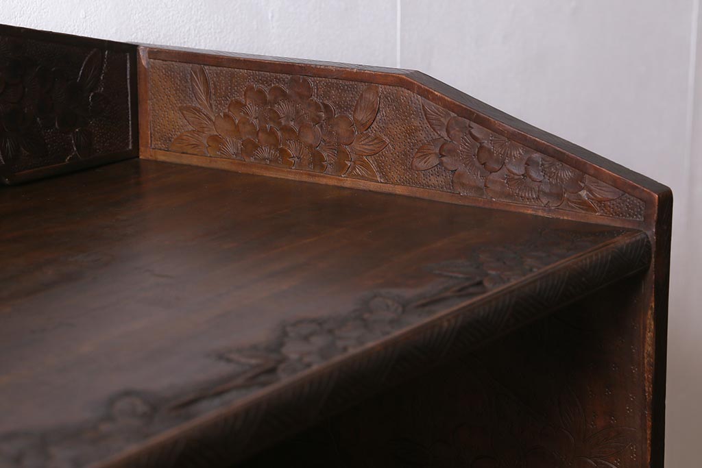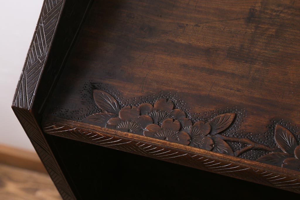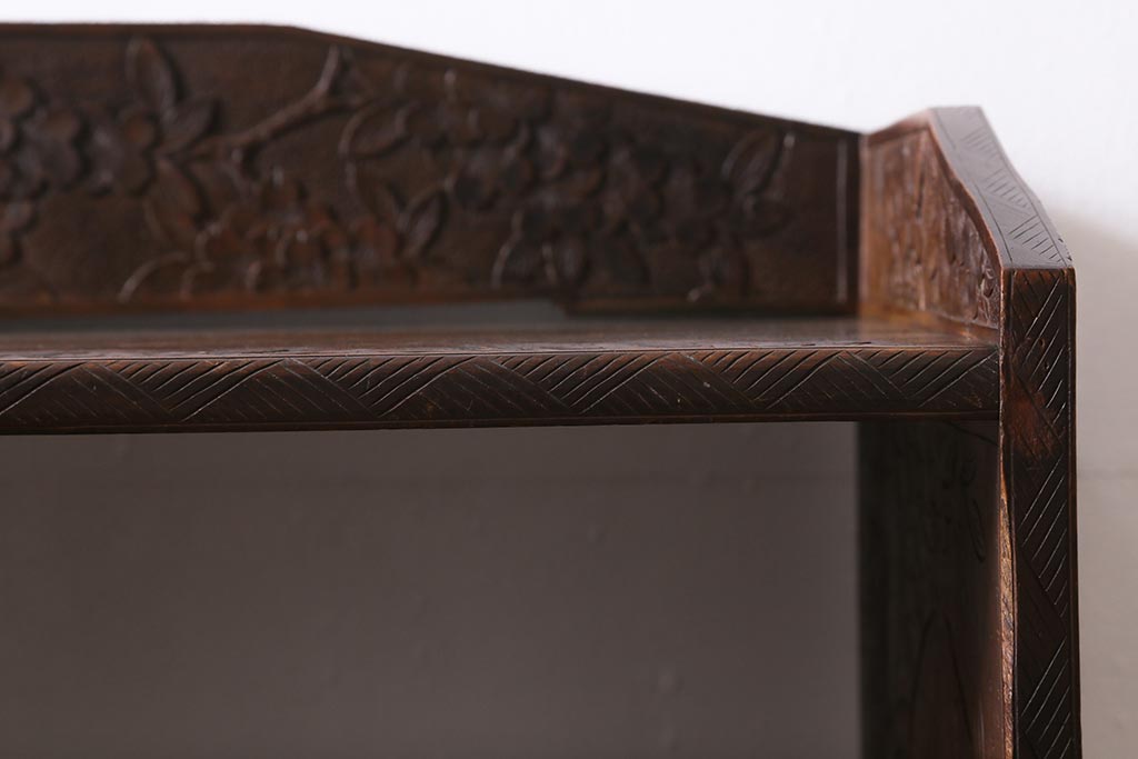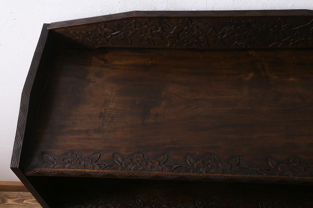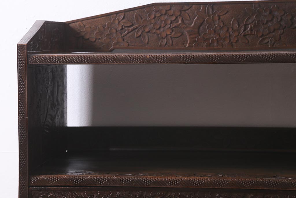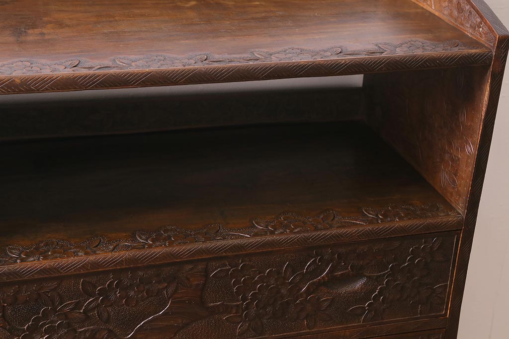 ラフジュ工房> オープンラック・シェルフ > ビンテージ家具 伝統工芸 軽井沢彫り 繊細な彫りが豪華さを演出する棚付きチェスト(衣装タンス、引き出し)(R-039943)