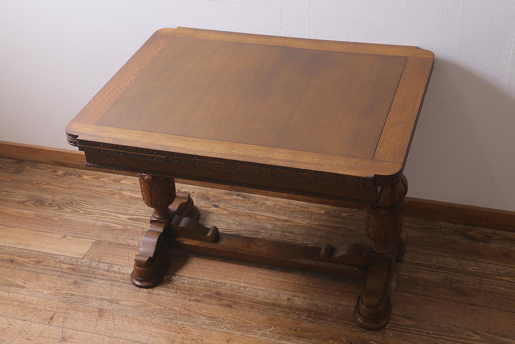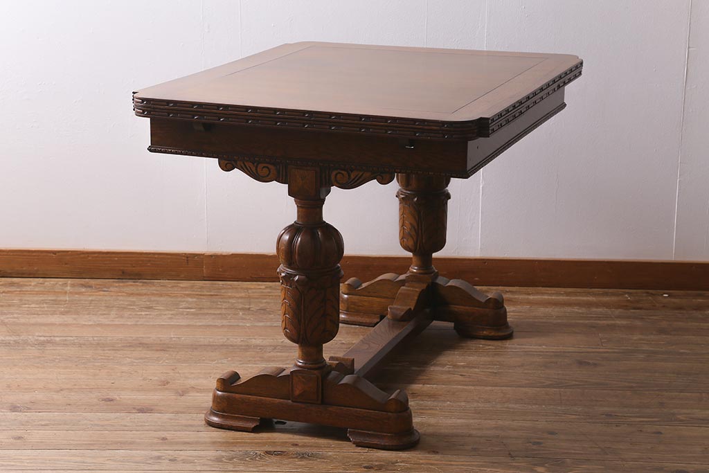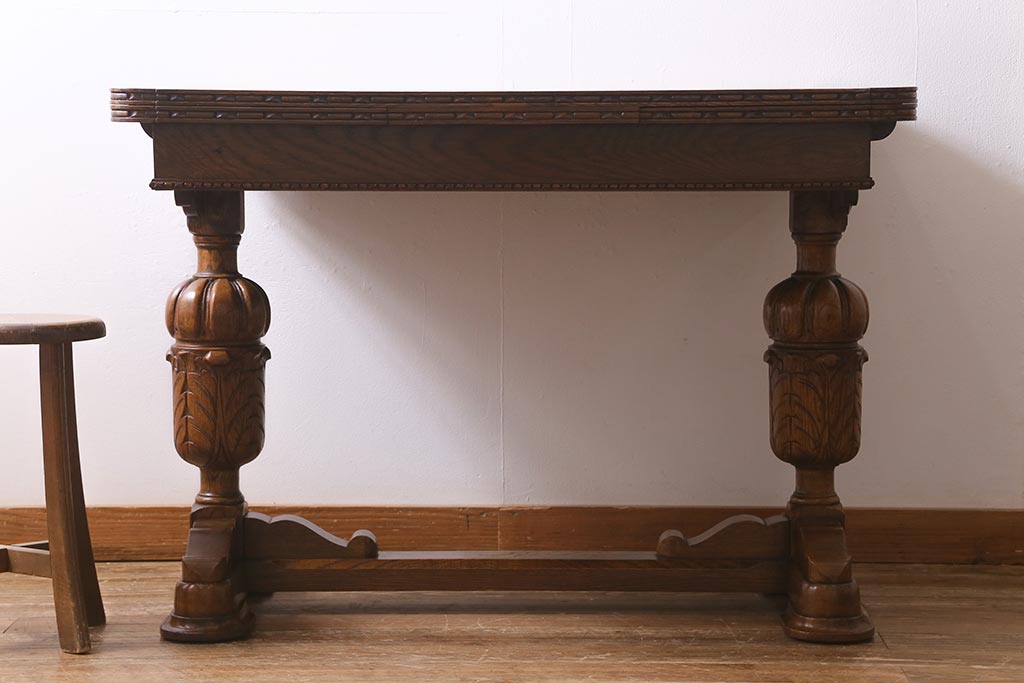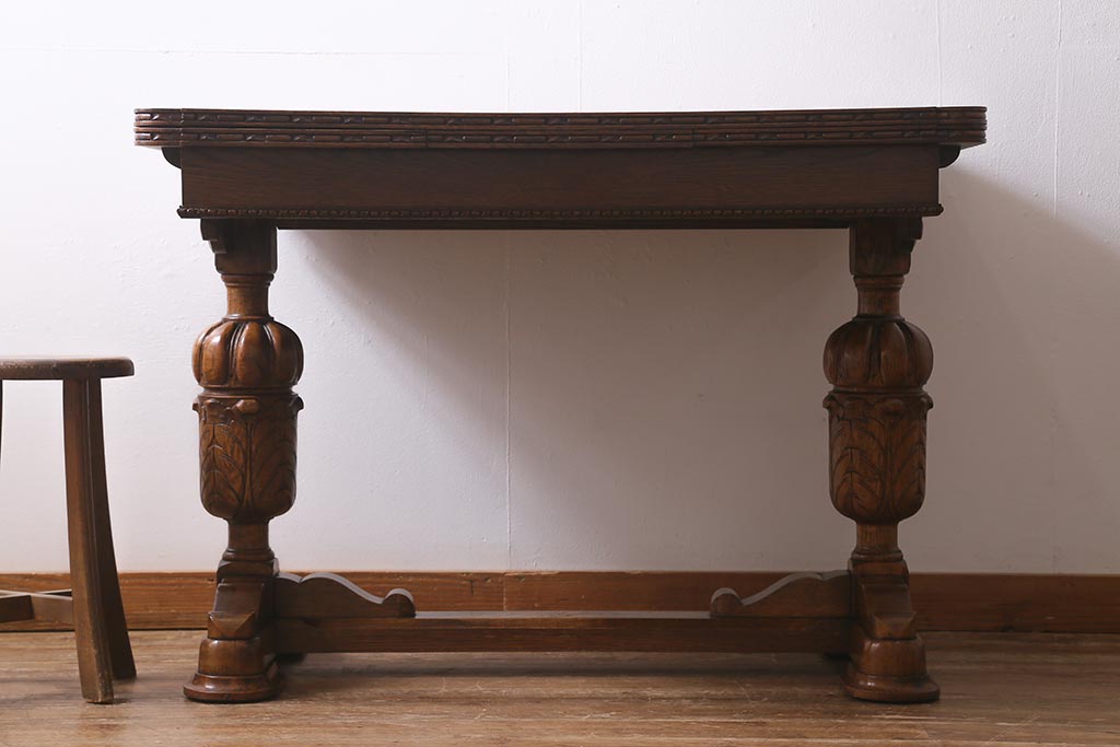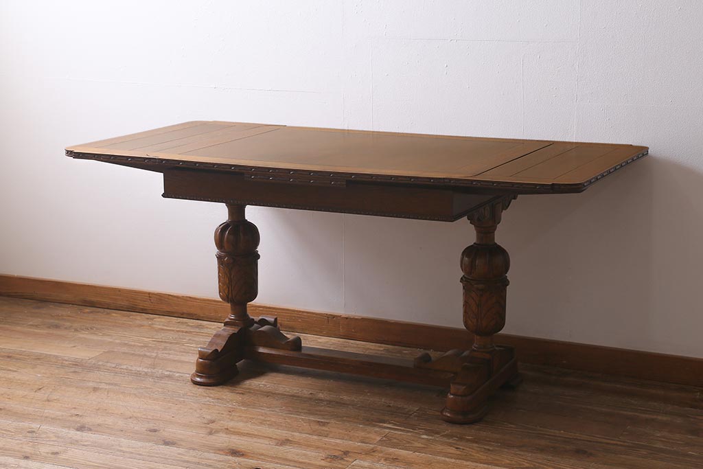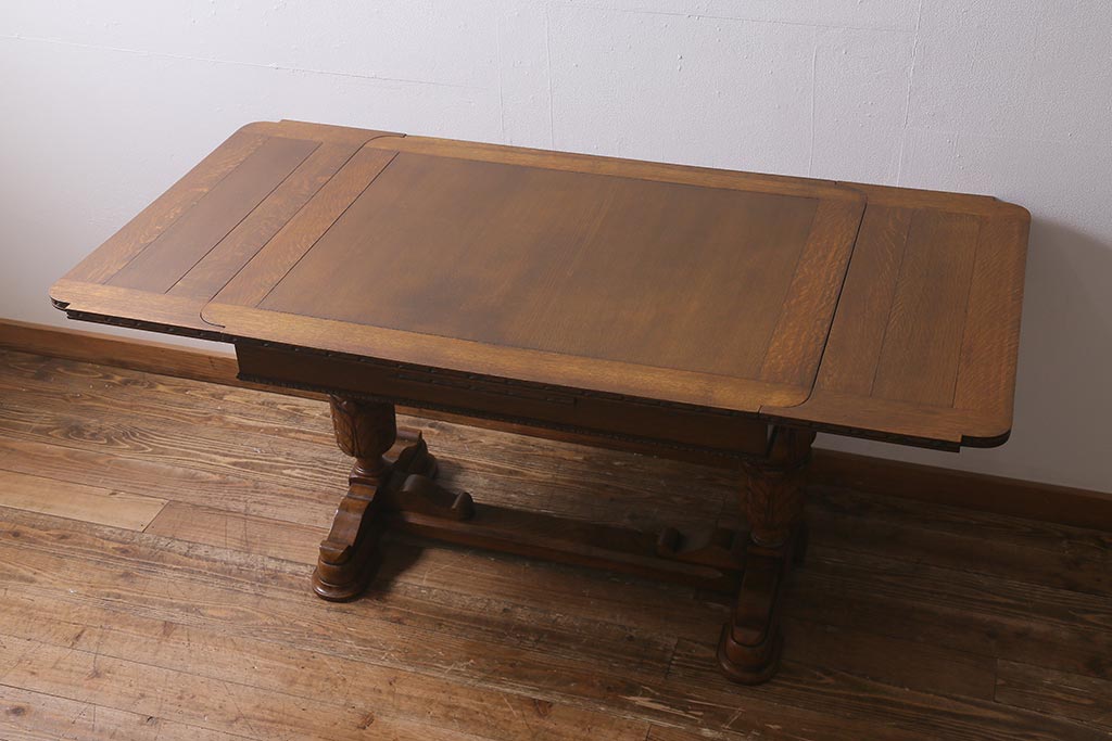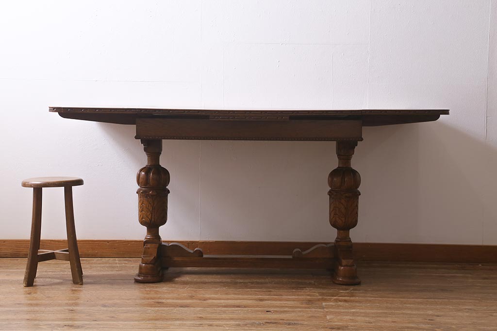アンティーク家具 イギリスアンティーク オーク材 ブルボーズレッグが目を引くドローリーフテーブル(エクステンションテーブル、ダイニングテーブル)(R-039960)です。