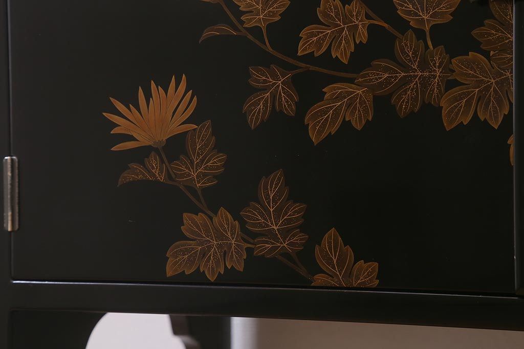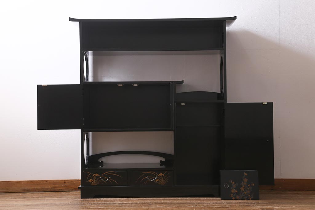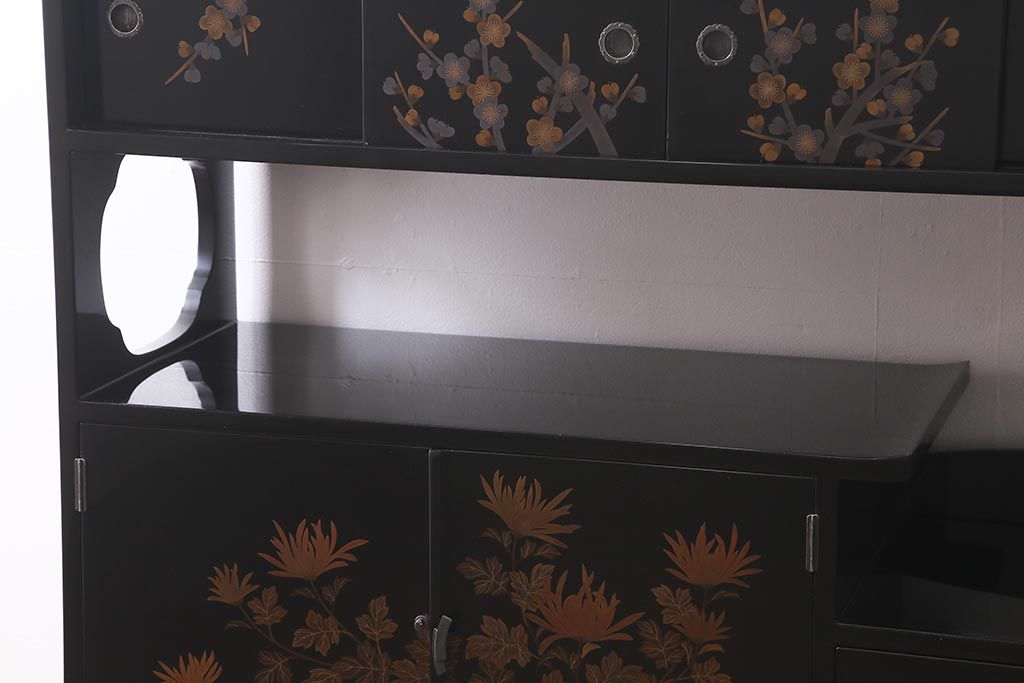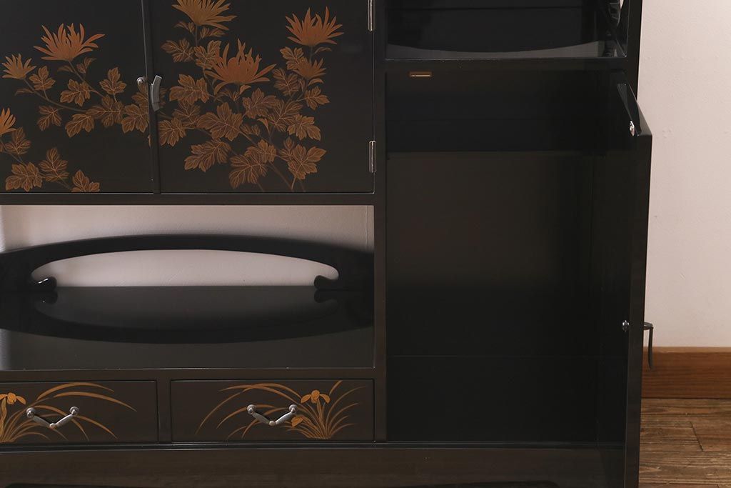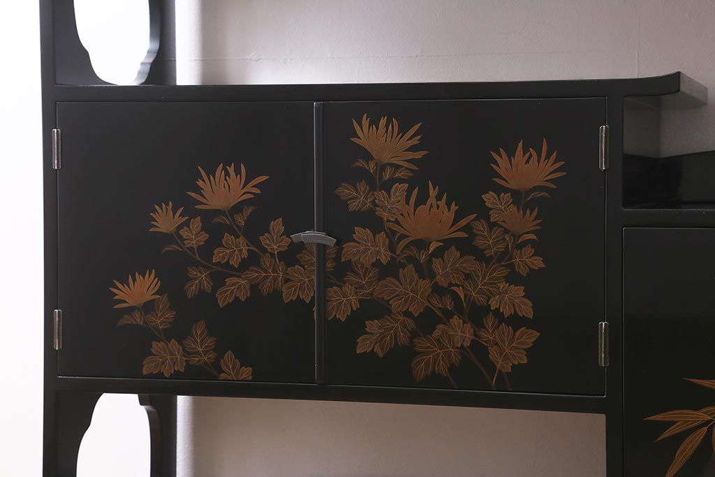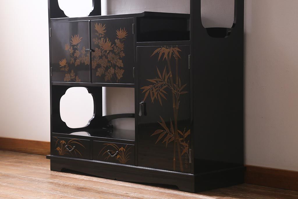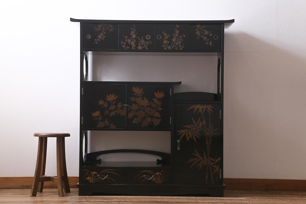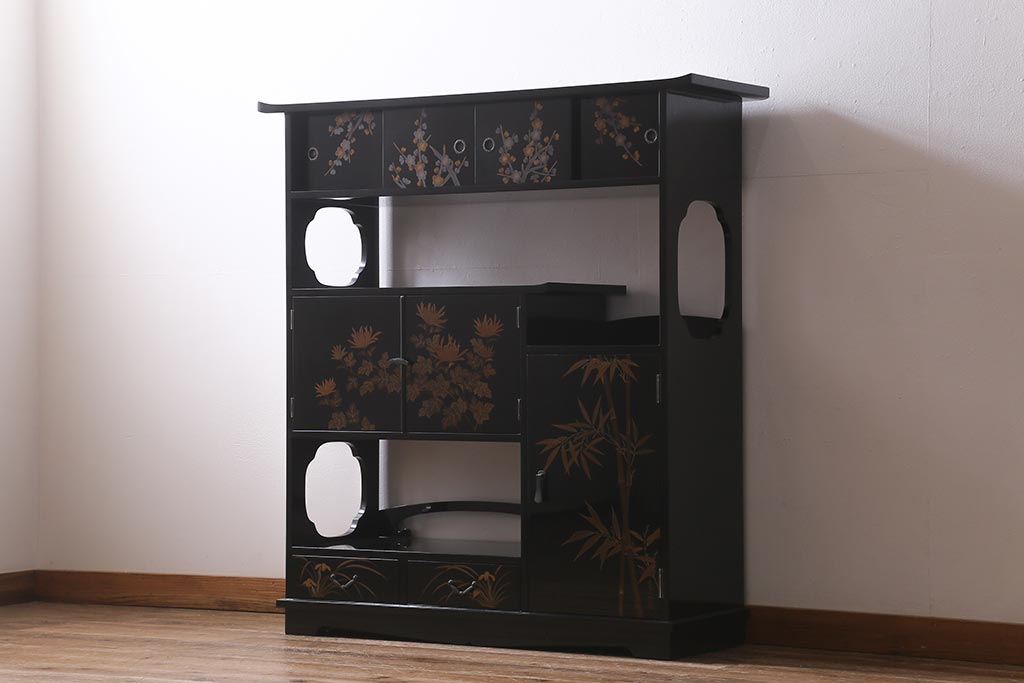 民芸家具 > 中古 伝統工芸品 在銘 六右衛門作 漆塗り 四季折々の草花の蒔絵が美しい飾り棚(茶箪笥、茶棚)(R-039813)