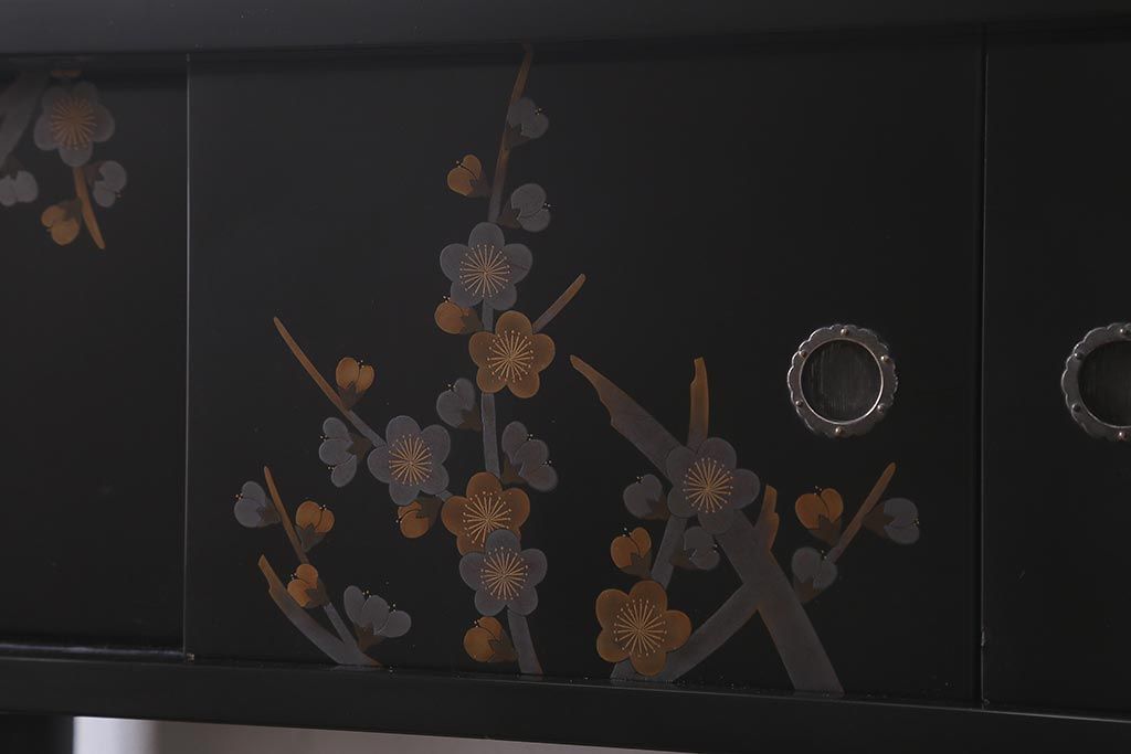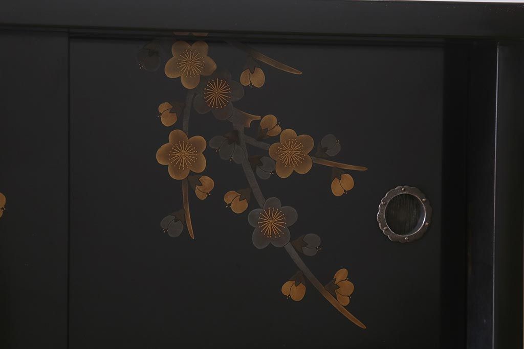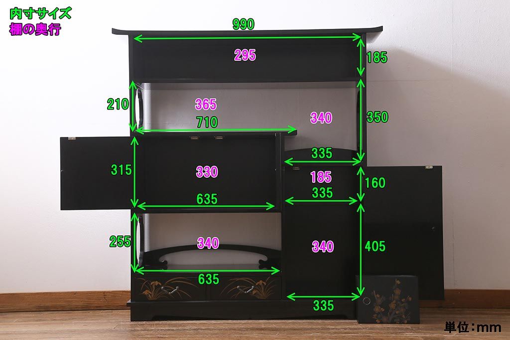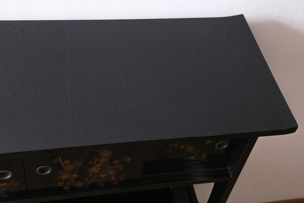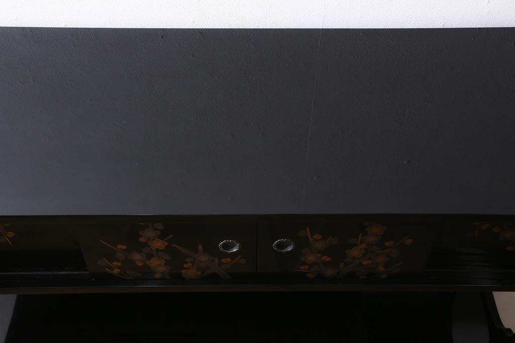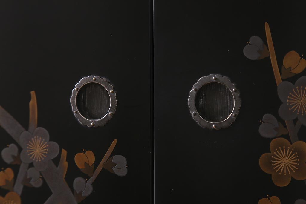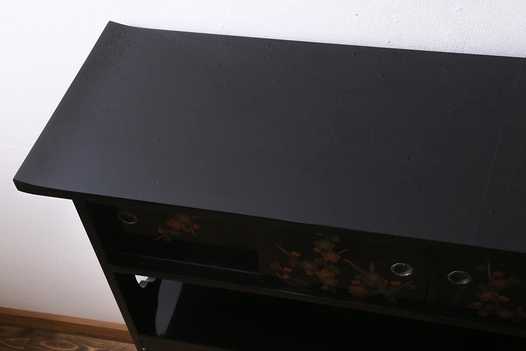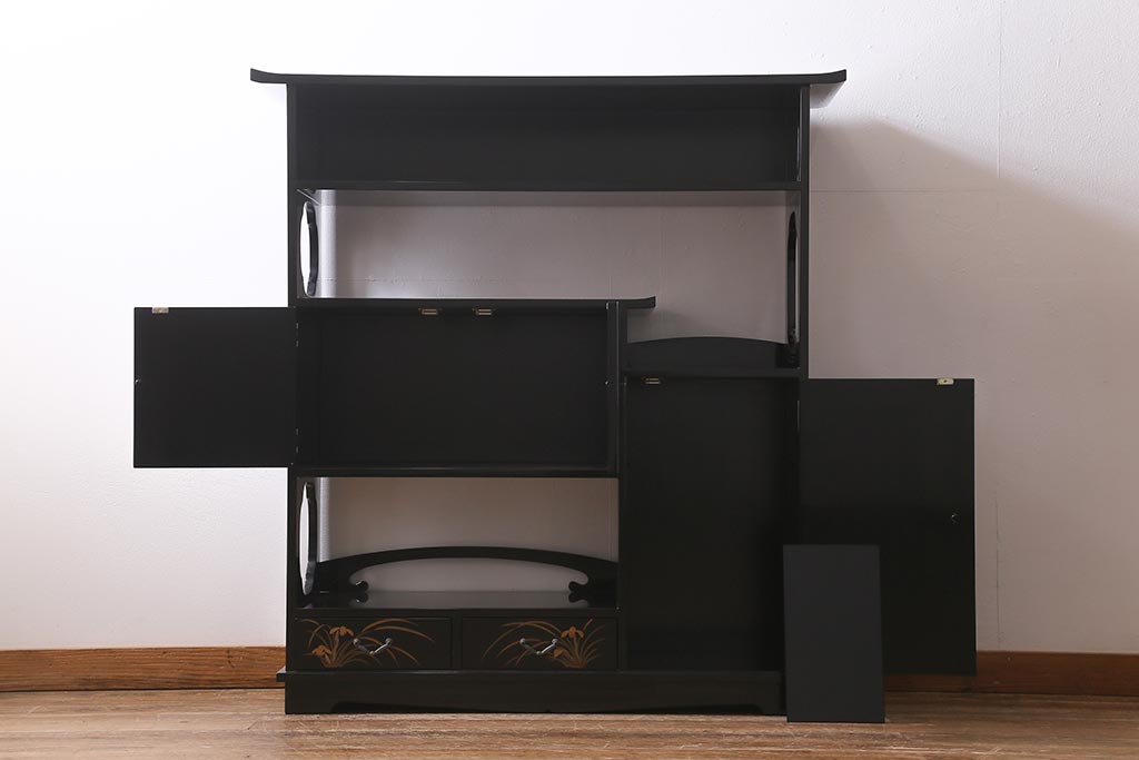 民芸家具 > 中古 伝統工芸品 在銘 六右衛門作 漆塗り 四季折々の草花の蒔絵が美しい飾り棚(茶箪笥、茶棚)(R-039813)