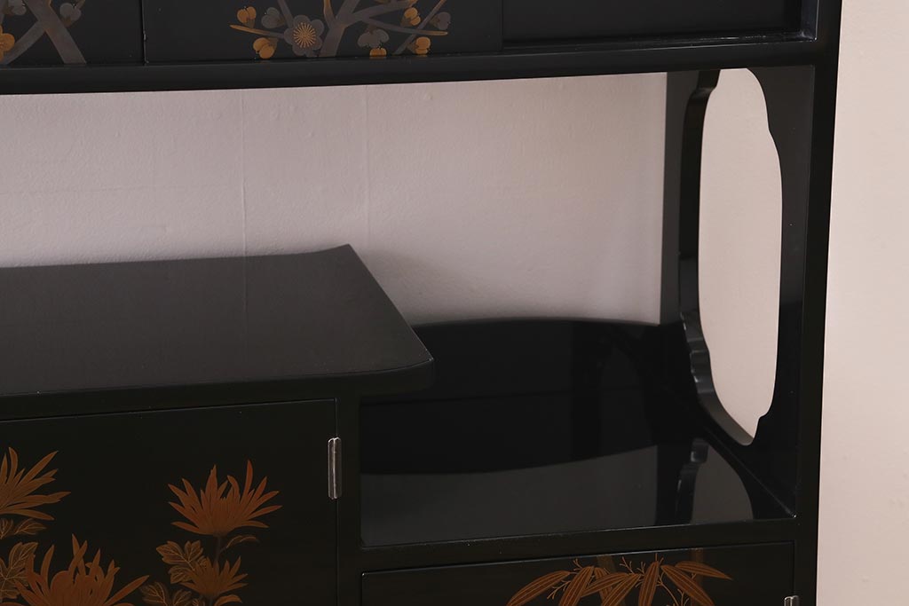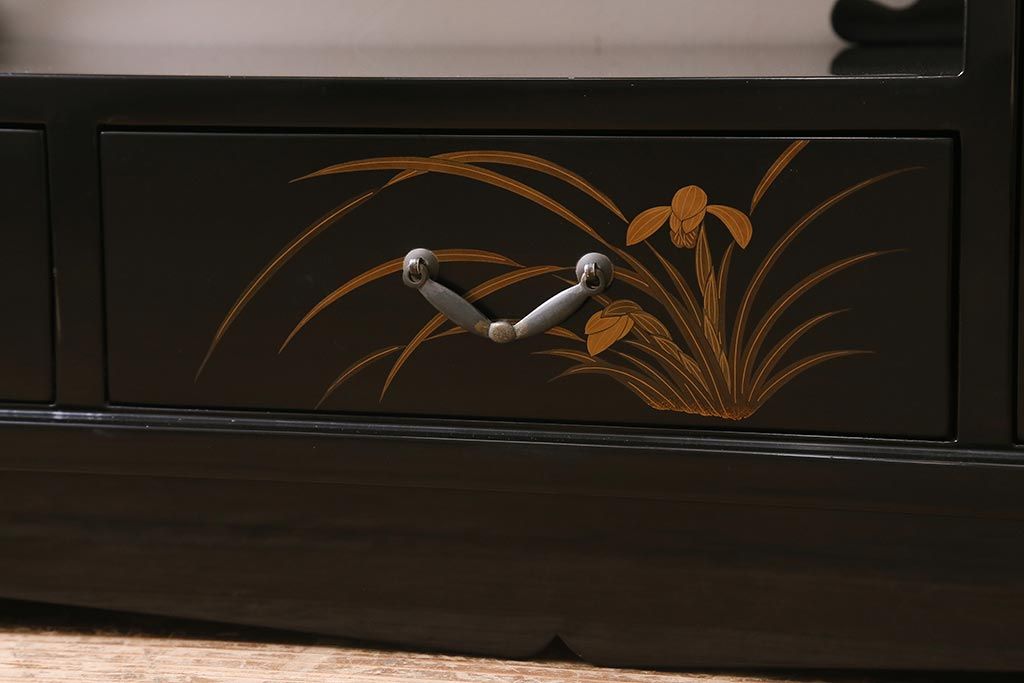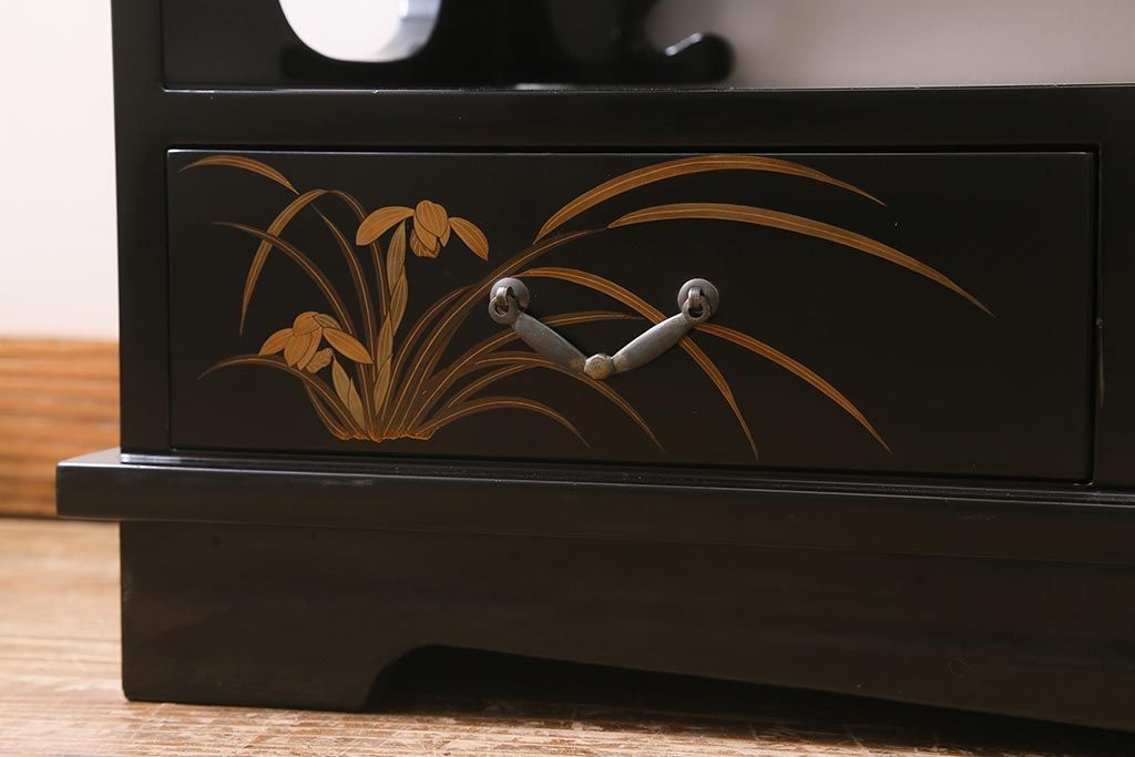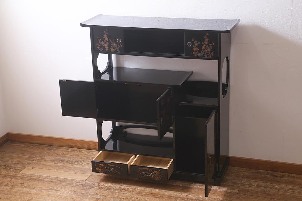 和箪笥> 茶箪笥・茶棚 > 中古 伝統工芸品 在銘 六右衛門作 漆塗り 四季折々の草花の蒔絵が美しい飾り棚(茶箪笥、茶棚)(R-039813)