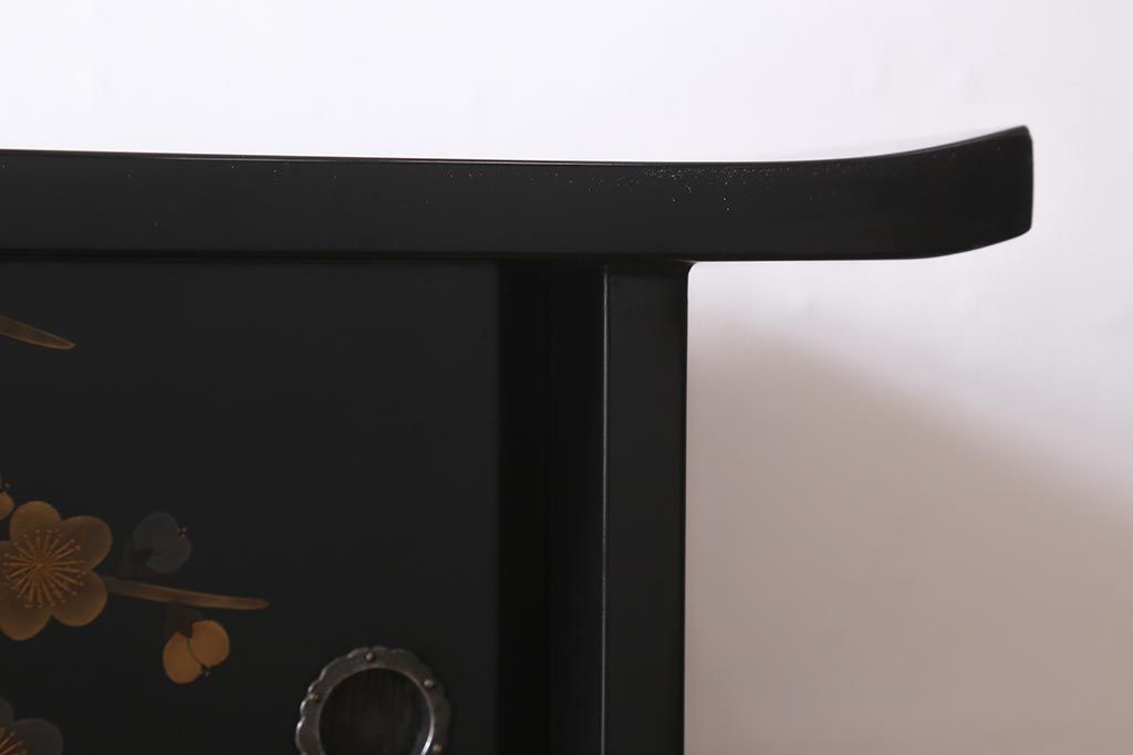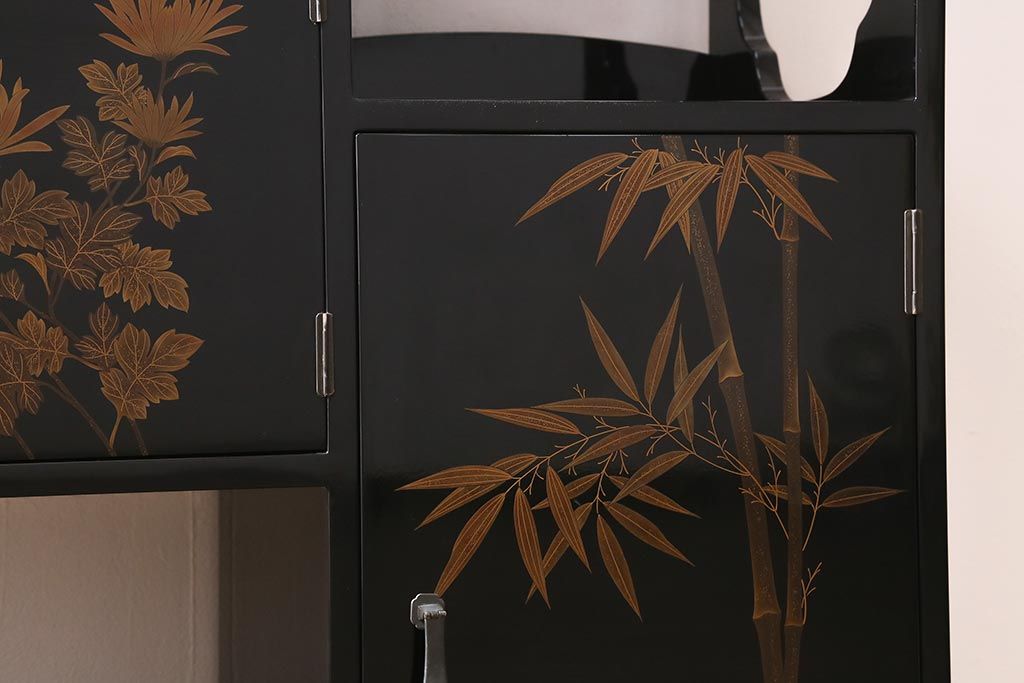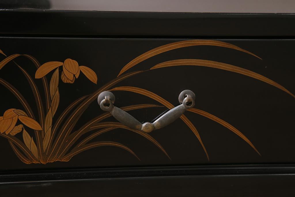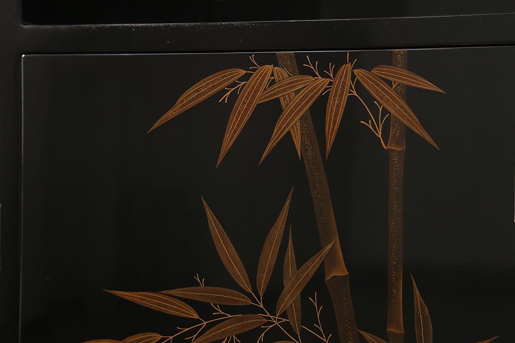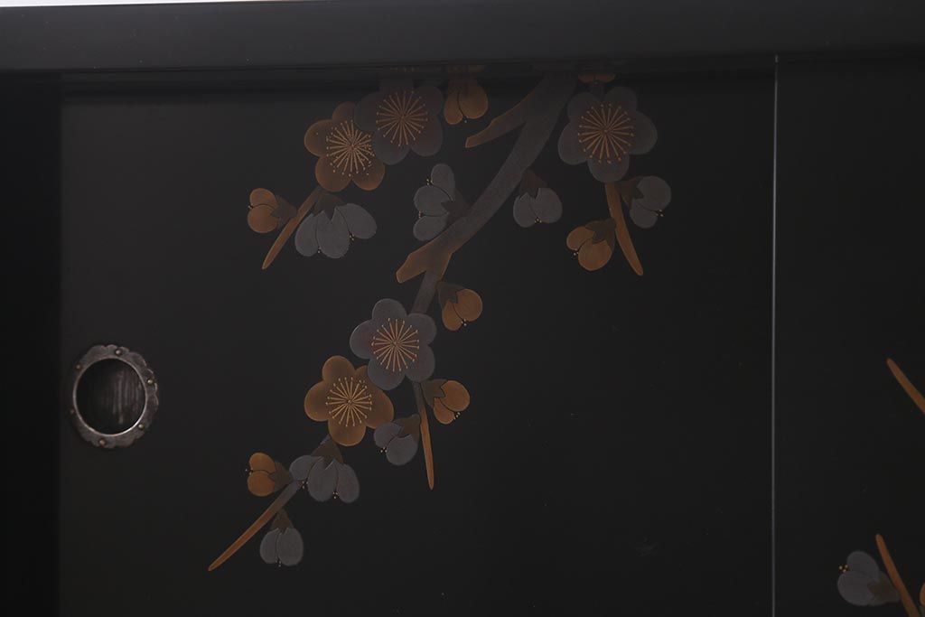 和箪笥> 茶箪笥・茶棚 > 中古 伝統工芸品 在銘 六右衛門作 漆塗り 四季折々の草花の蒔絵が美しい飾り棚(茶箪笥、茶棚)(R-039813)