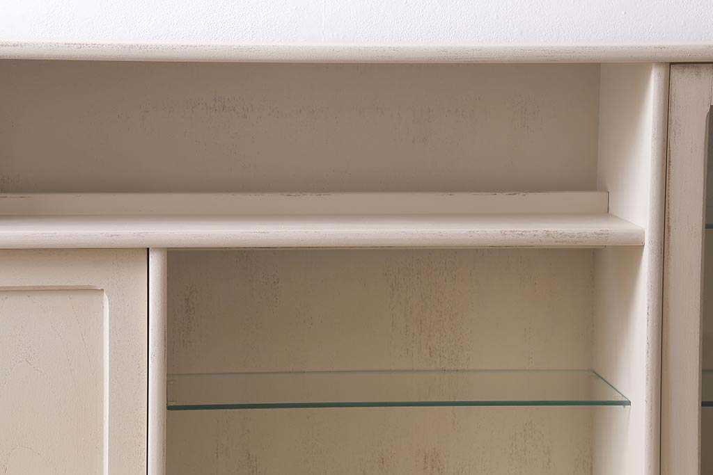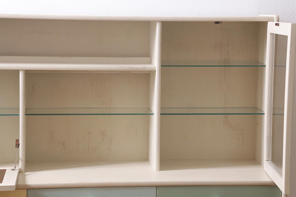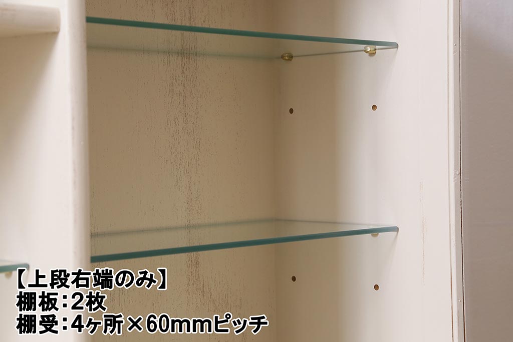 上段ガラス棚板のみ取り外しできます。右のガラス扉内のみ棚板は2枚、棚受けは4ヶ所、60mmピッチで調整できます。棚幅サイズのものが1枚の作りです。