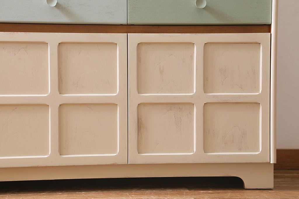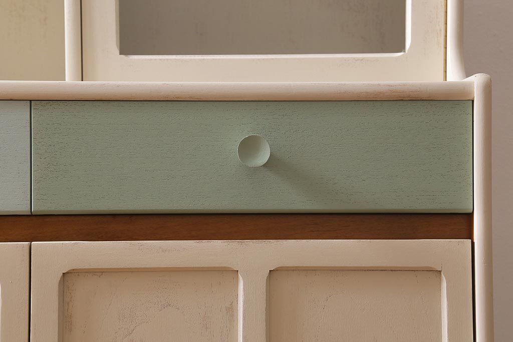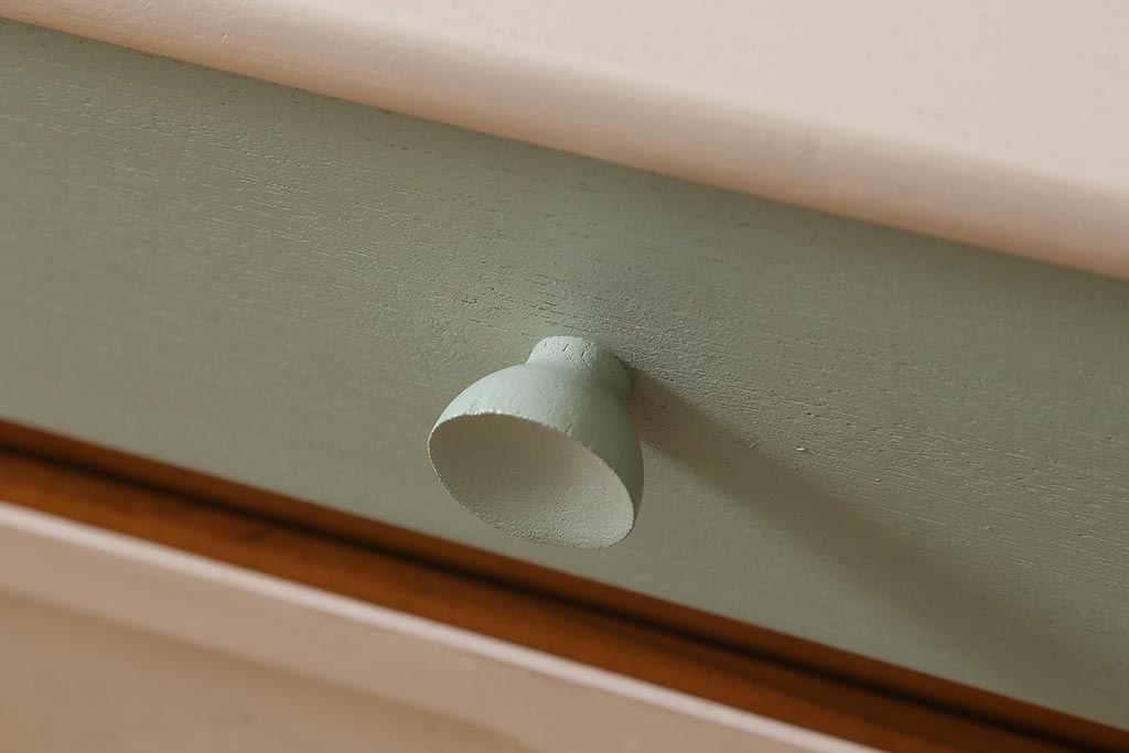 ペイントカラーは本体:茶色がかったアイボリー、引き出し:(左から)クリーム・アイスグリーン・くすんだグリーンです。