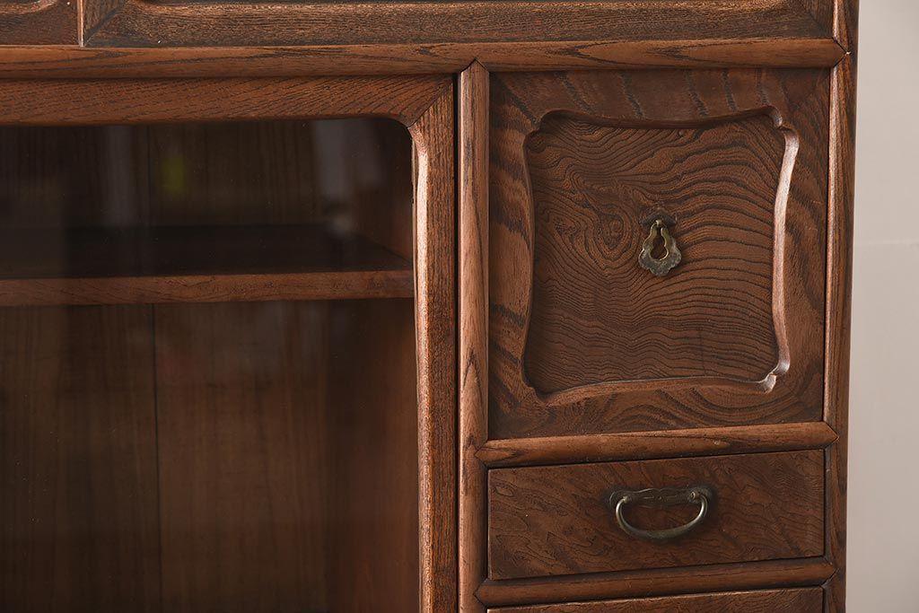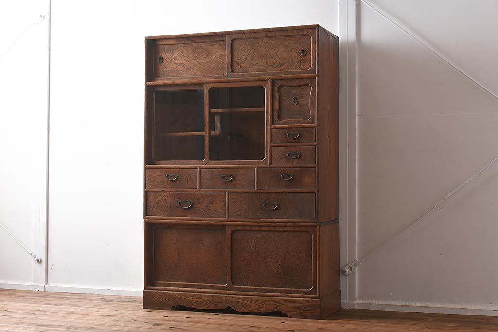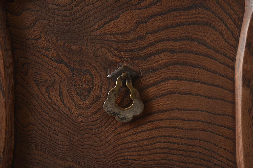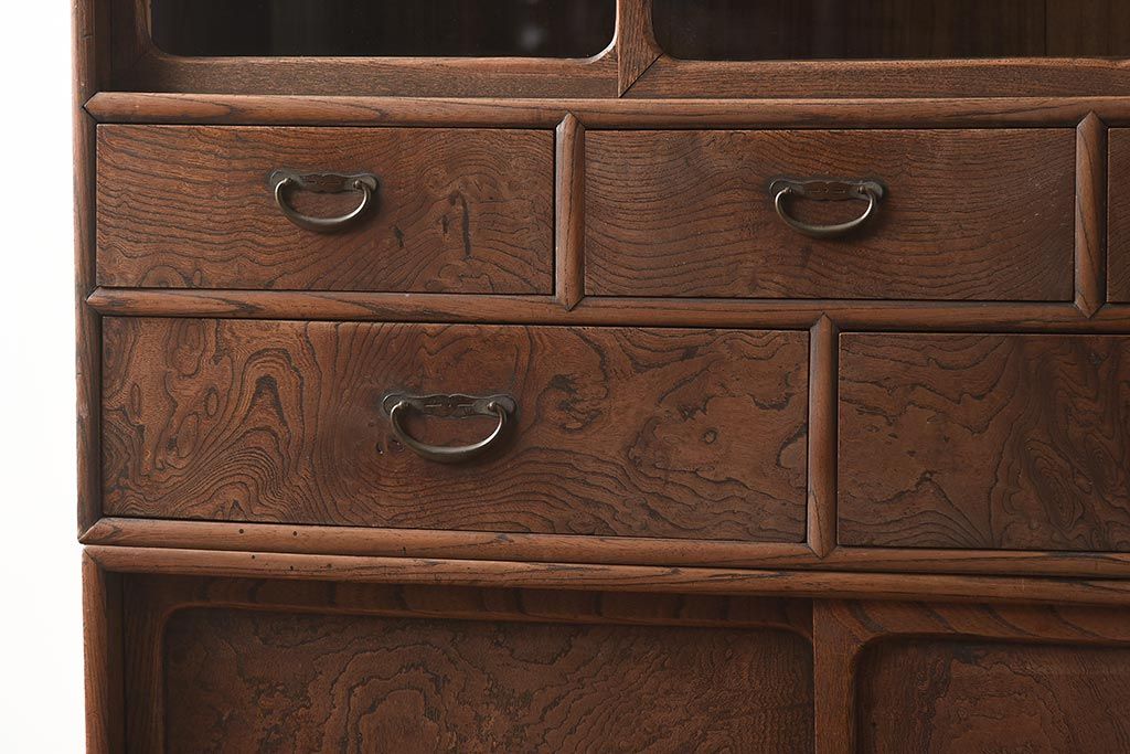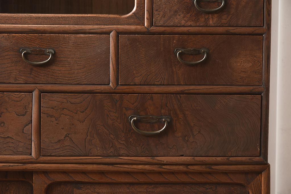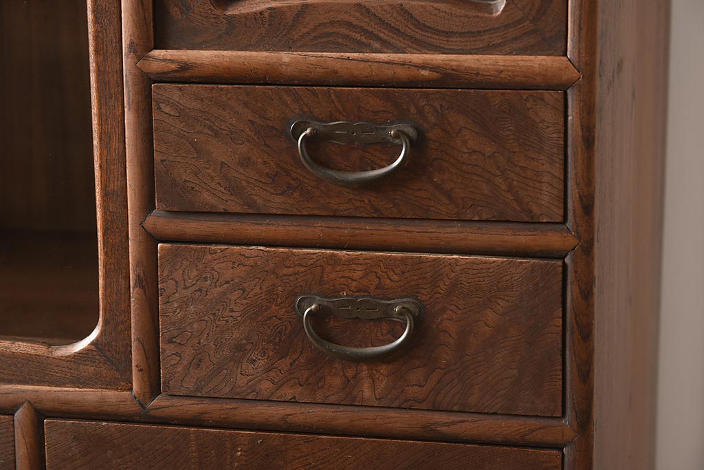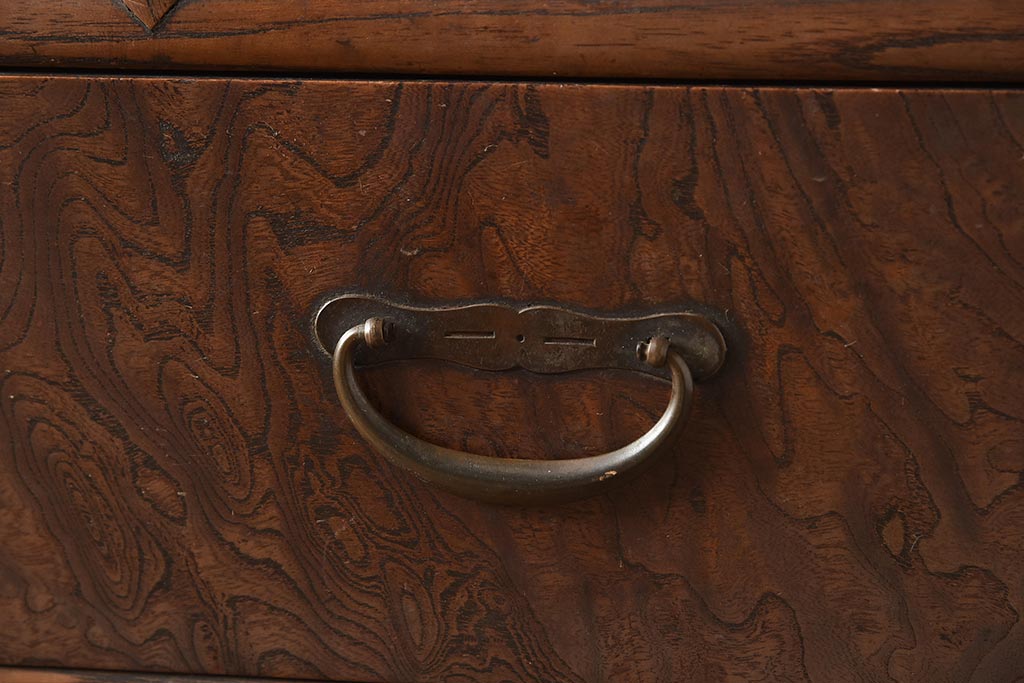 和箪笥> 茶箪笥・茶棚 > アンティーク家具 真鍮金具 三方ケヤキ材 前面玉杢の上質な茶棚(茶箪笥、収納棚、キャビネット)(R-039249)