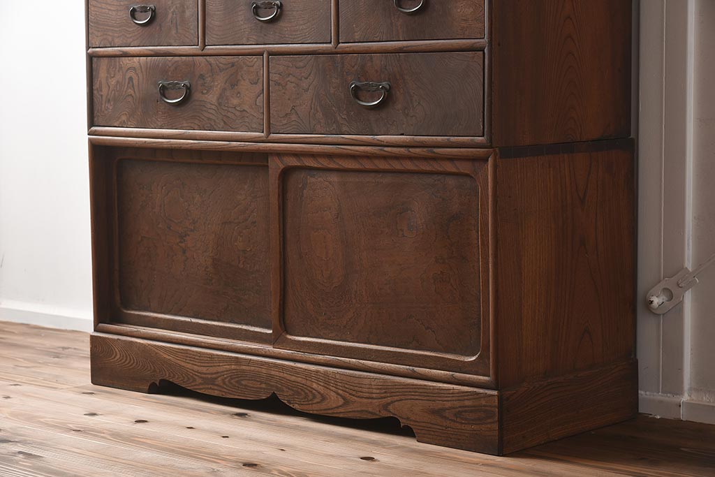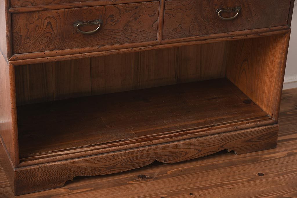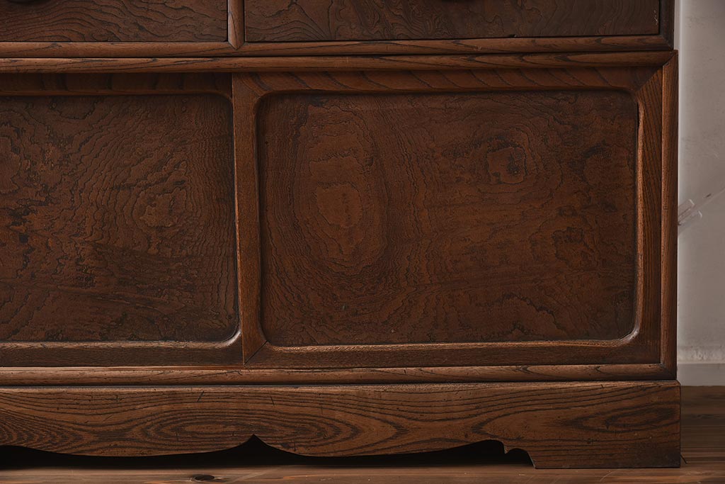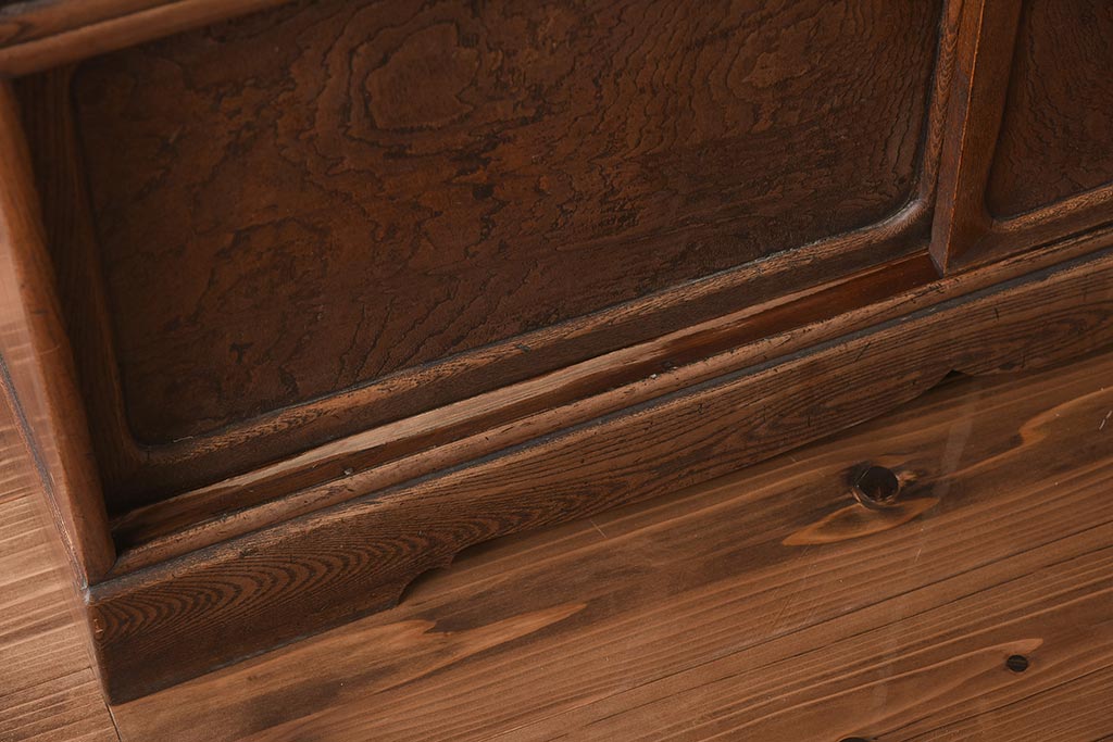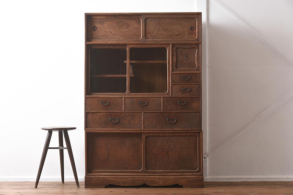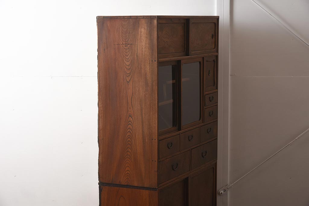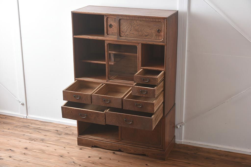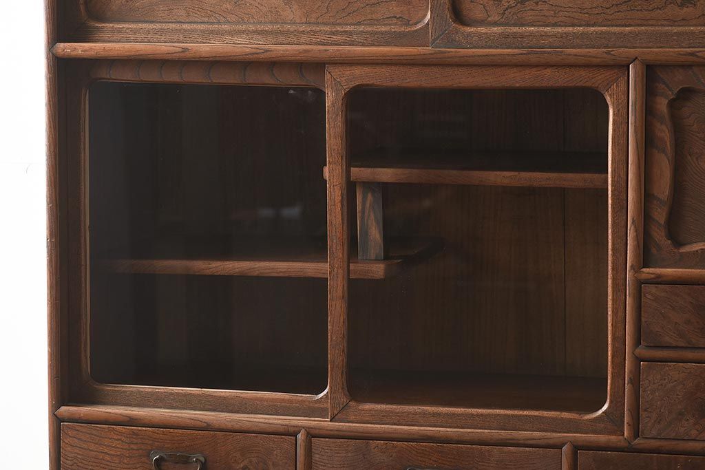 和箪笥> 茶箪笥・茶棚 > アンティーク家具 真鍮金具 三方ケヤキ材 前面玉杢の上質な茶棚(茶箪笥、収納棚、キャビネット)(R-039249)