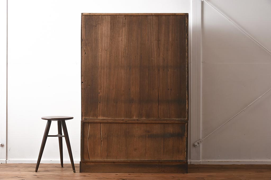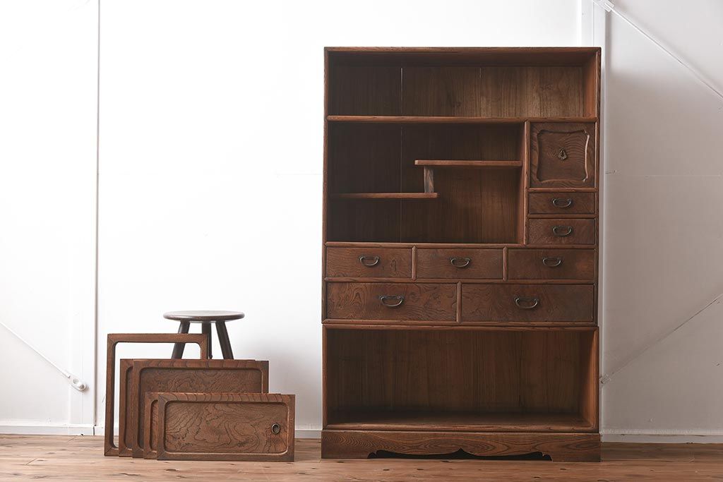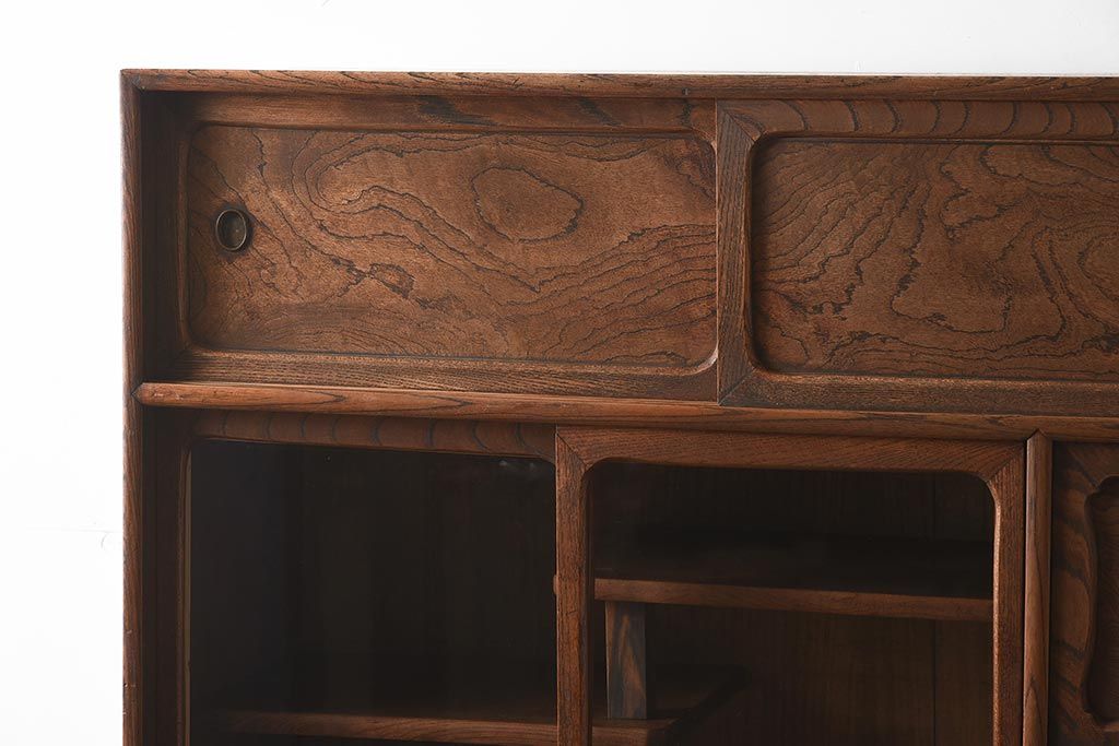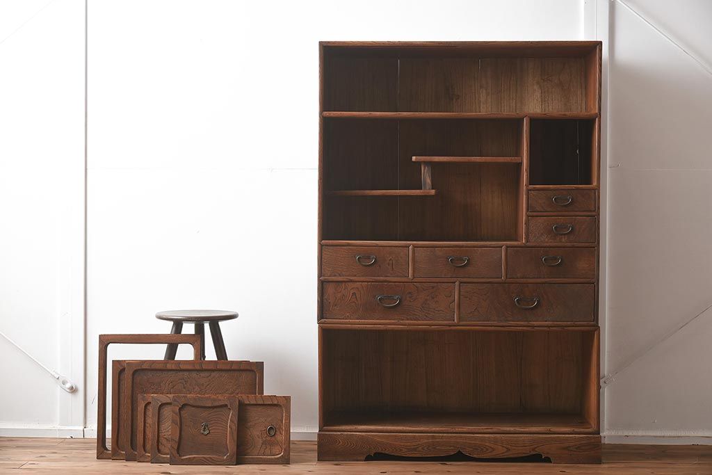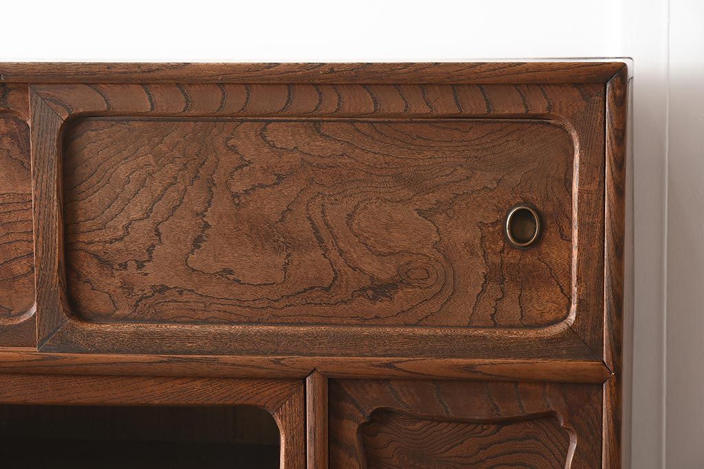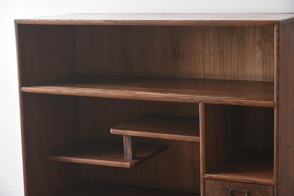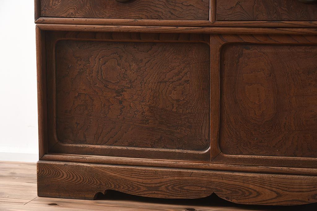 和箪笥> 茶箪笥・茶棚 > アンティーク家具 真鍮金具 三方ケヤキ材 前面玉杢の上質な茶棚(茶箪笥、収納棚、キャビネット)(R-039249)