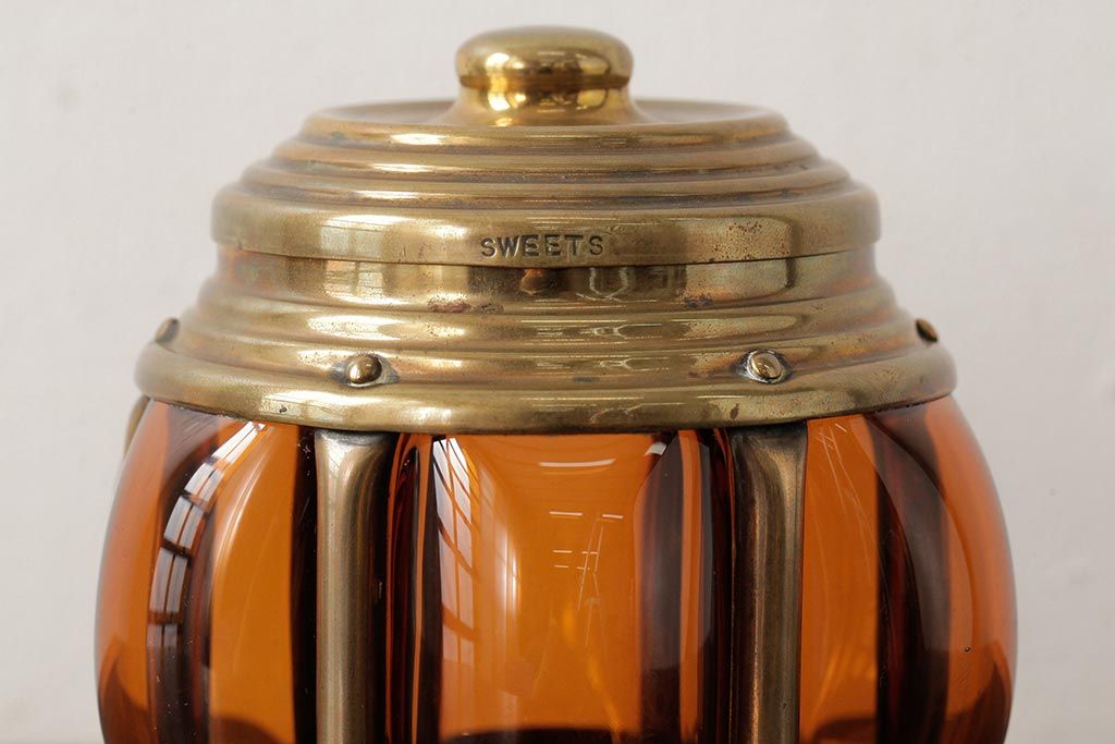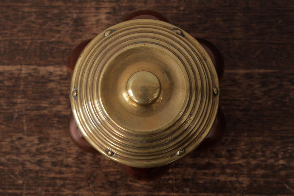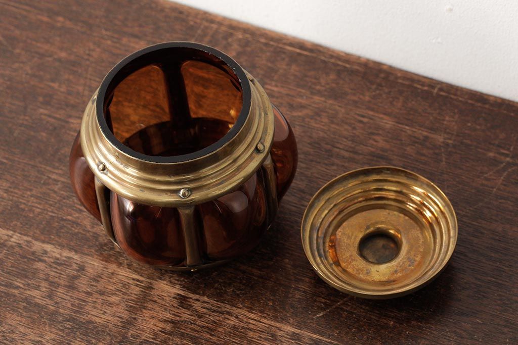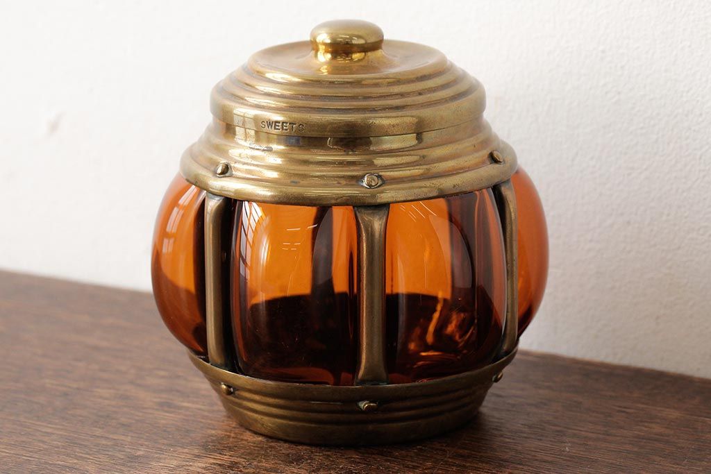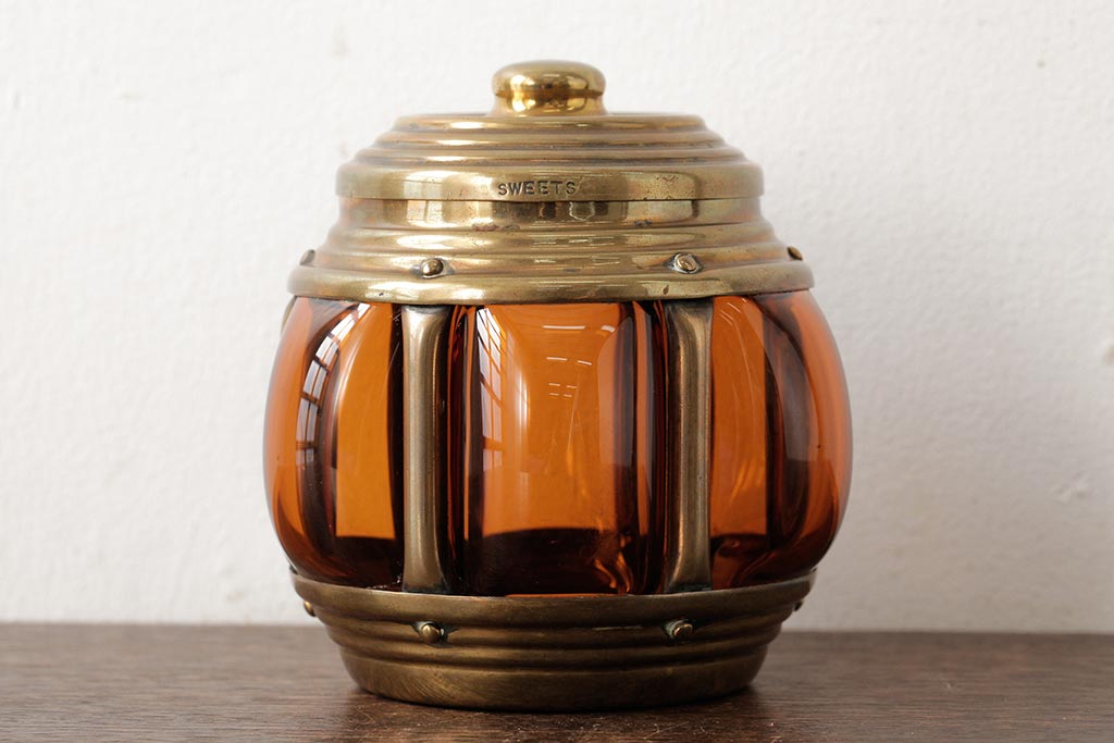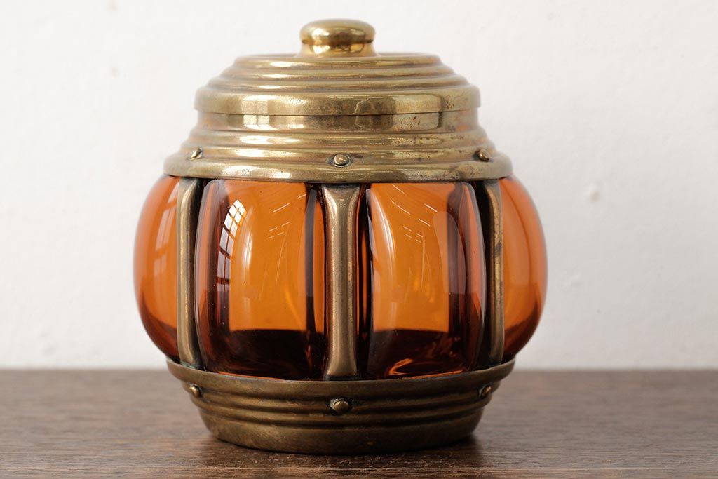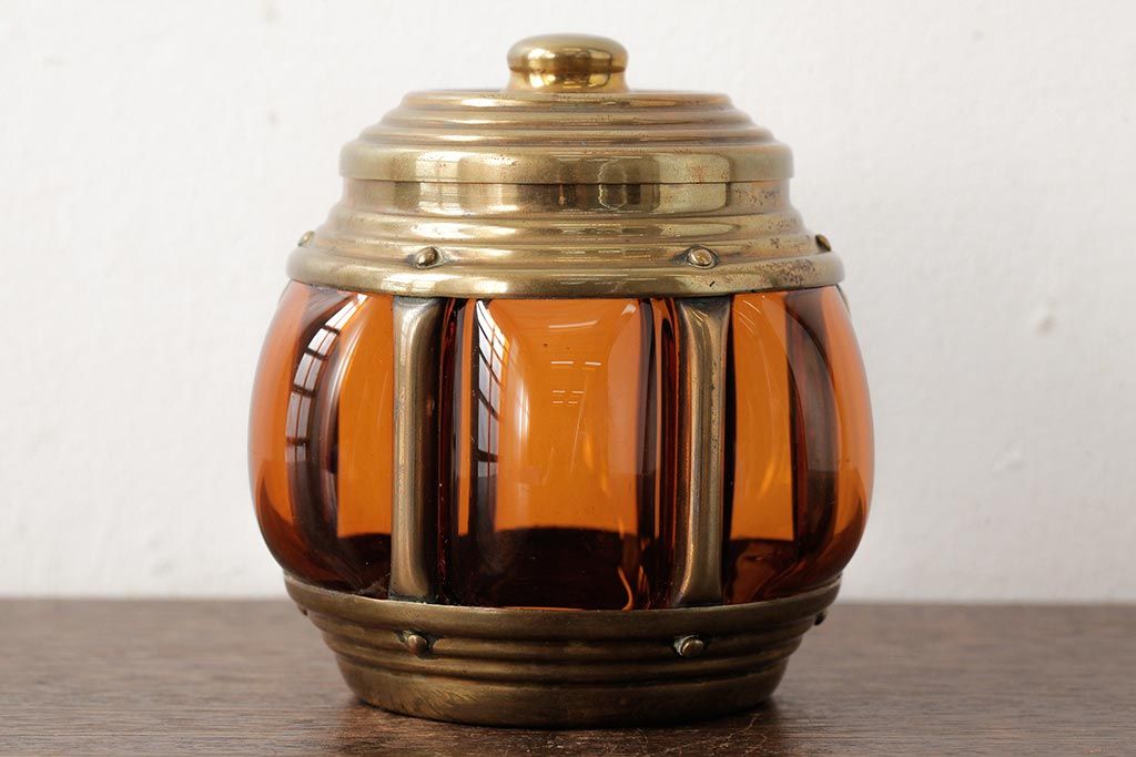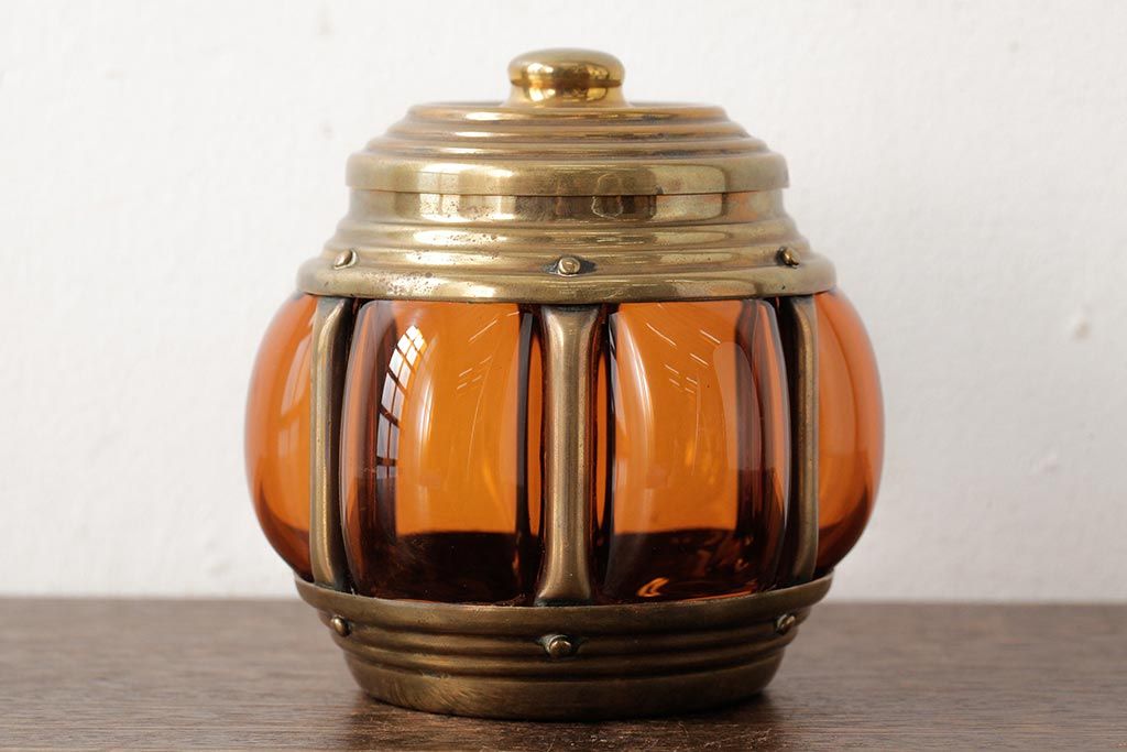 アンティーク雑貨 アメリカビンテージ オレンジのガラスが目を引くキャンディポット(蓋付き器、小物入れ)(R-039323)