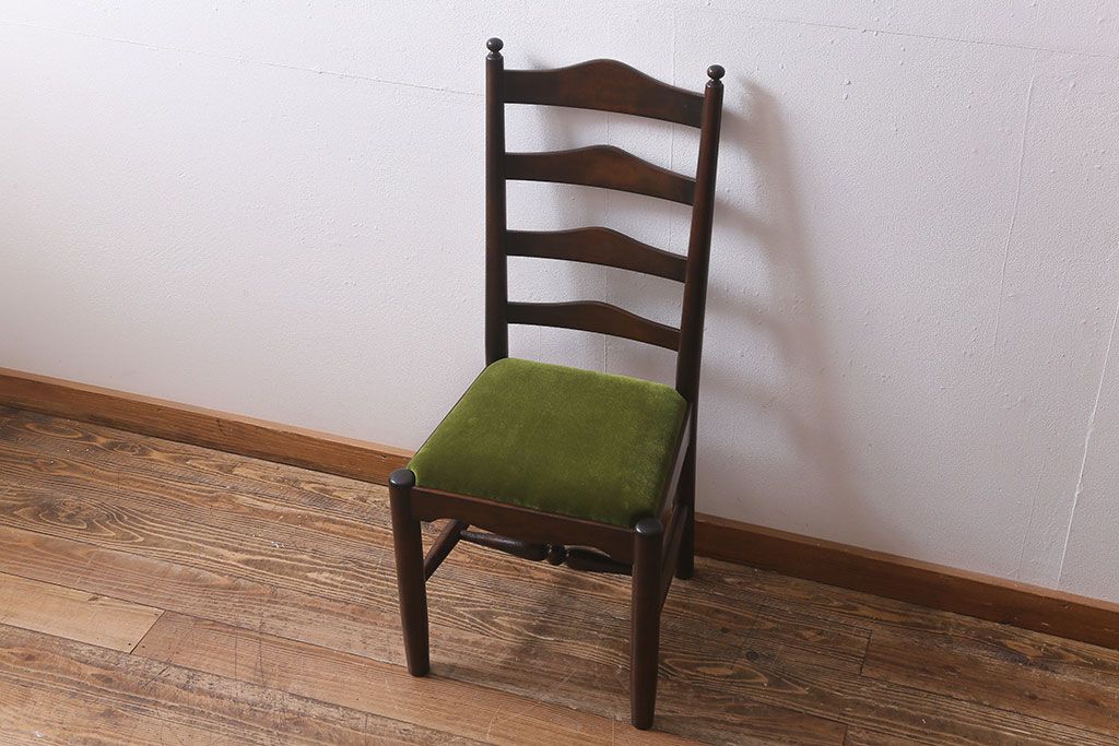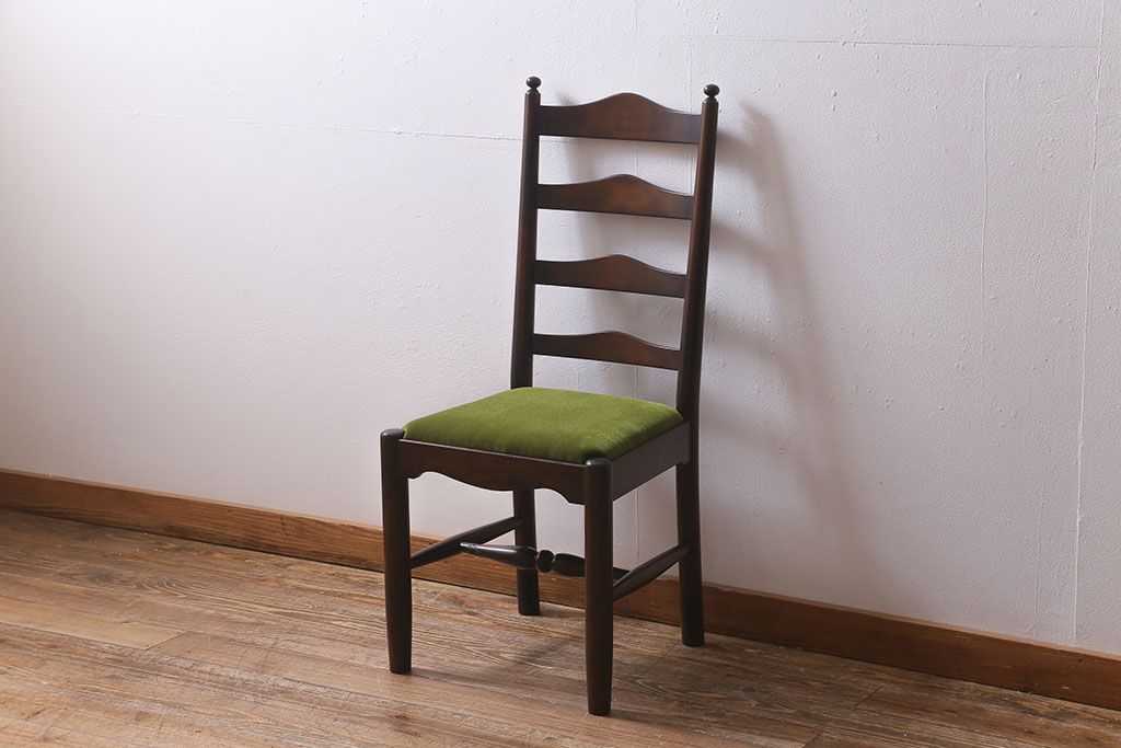 中古 松本民芸家具 グリーンのファブリックが上品な印象のA型布張ラダーバックチェア(ダイニングチェア、椅子)(R-040003)