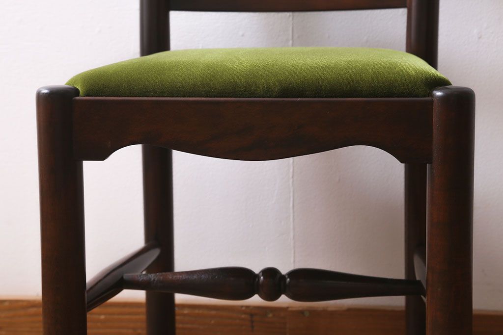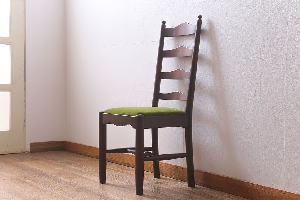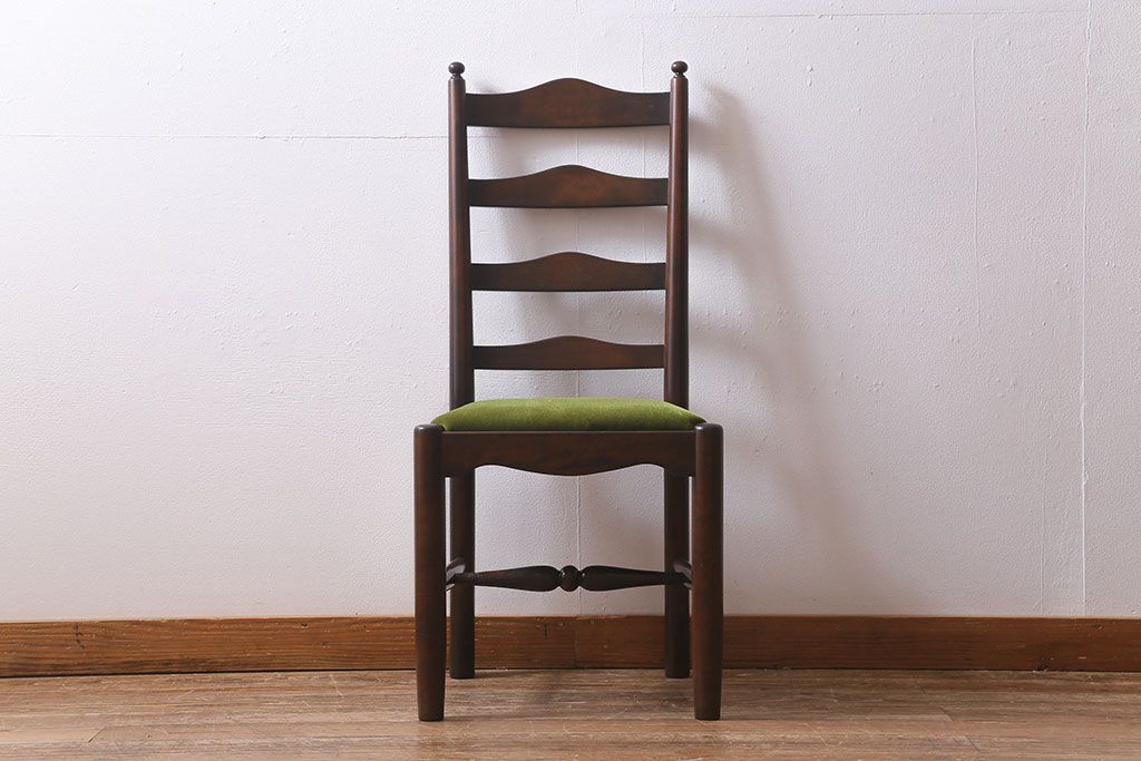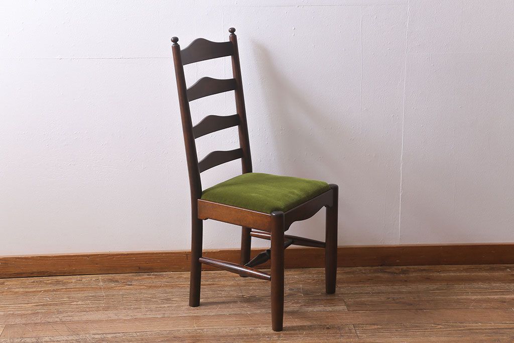 中古 松本民芸家具 グリーンのファブリックが上品な印象のA型布張ラダーバックチェア(ダイニングチェア、椅子)(R-040003)です。