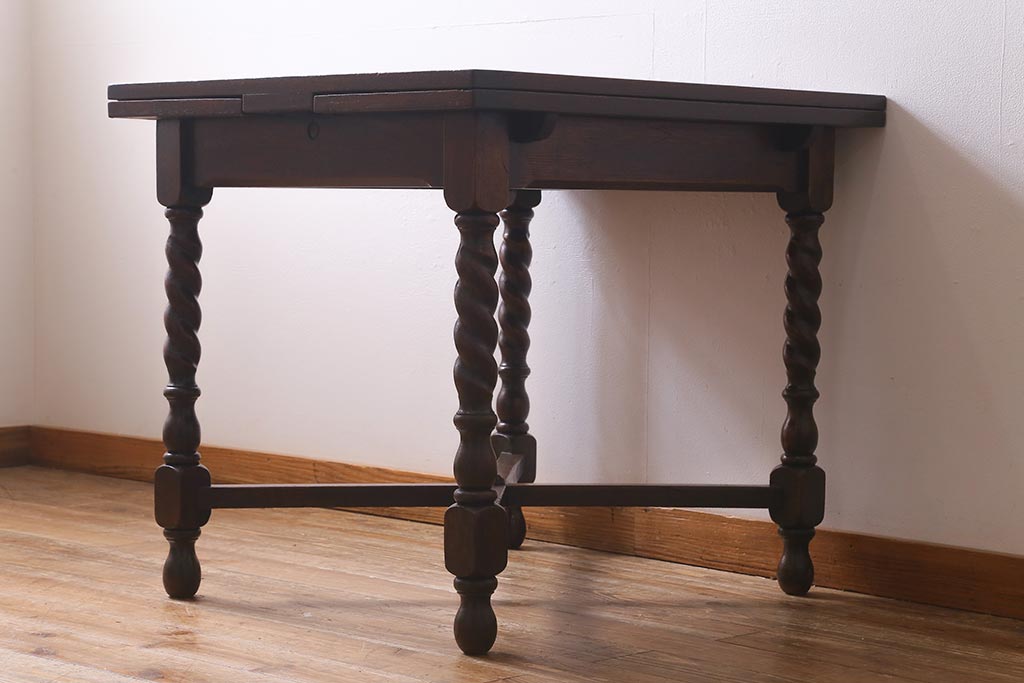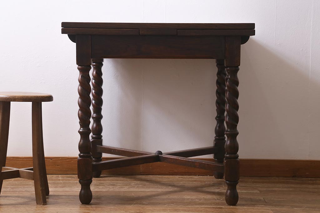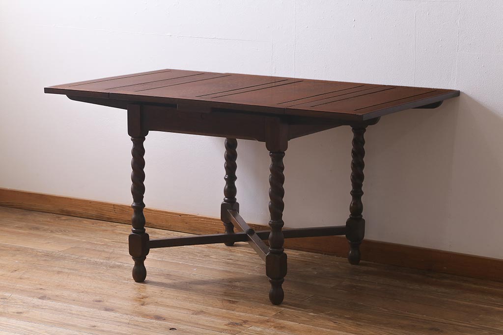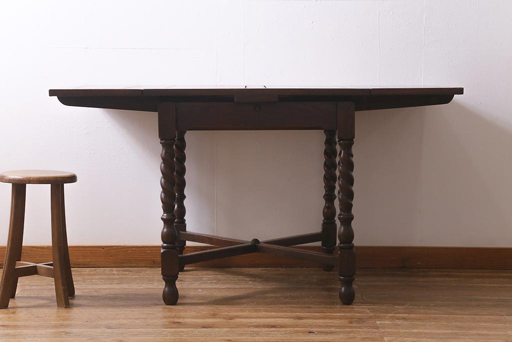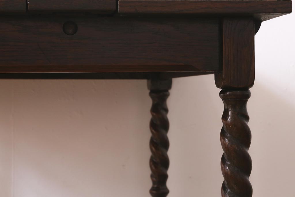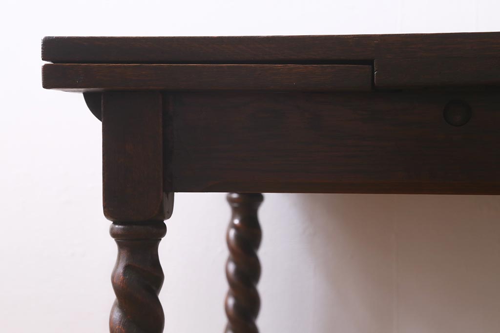 ラフジュ工房> テーブル> 2人用ダイニングテーブル > アンティーク家具 イギリスアンティーク オーク材 ツイストレッグのドローリーフテーブル(エクステンションテーブル、ダイニングテーブル)(R-040141)