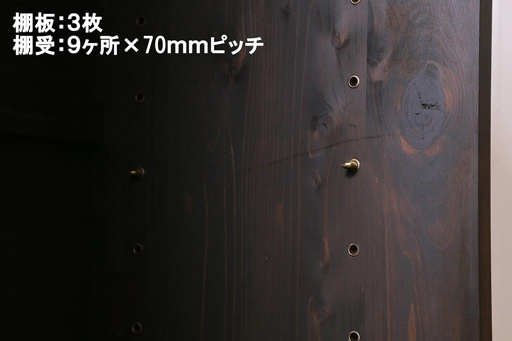棚板は取り外しできます。棚板は3枚あります。棚受けは9ヶ所、70mmピッチで調整できます。棚幅サイズのものが1枚の作りです。