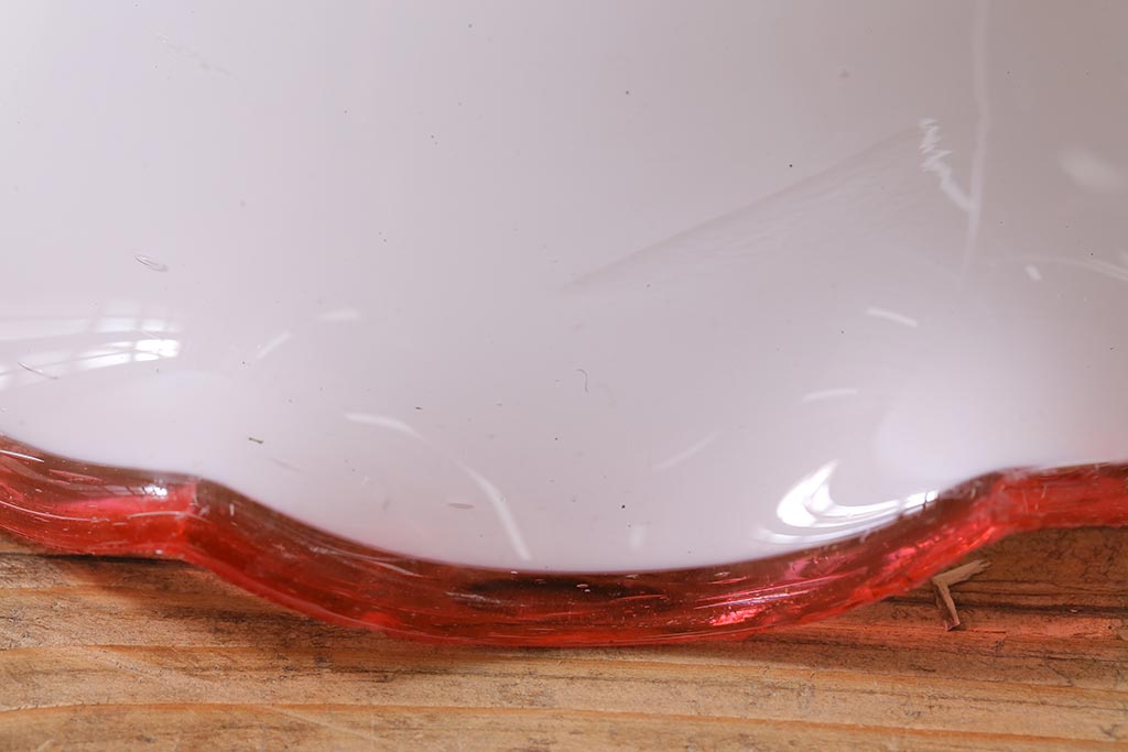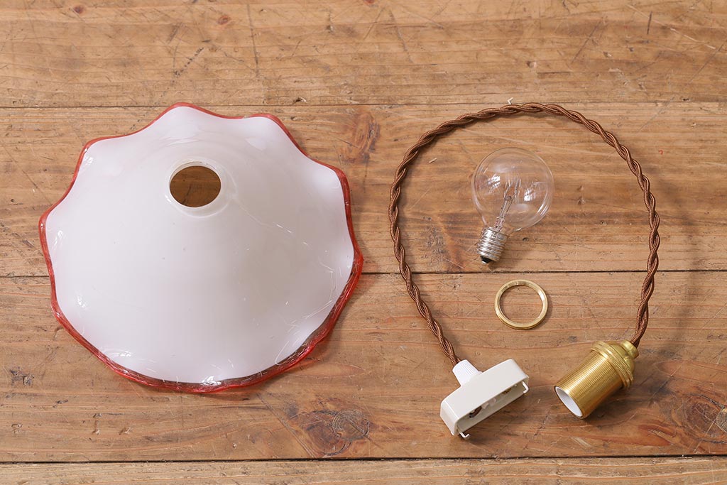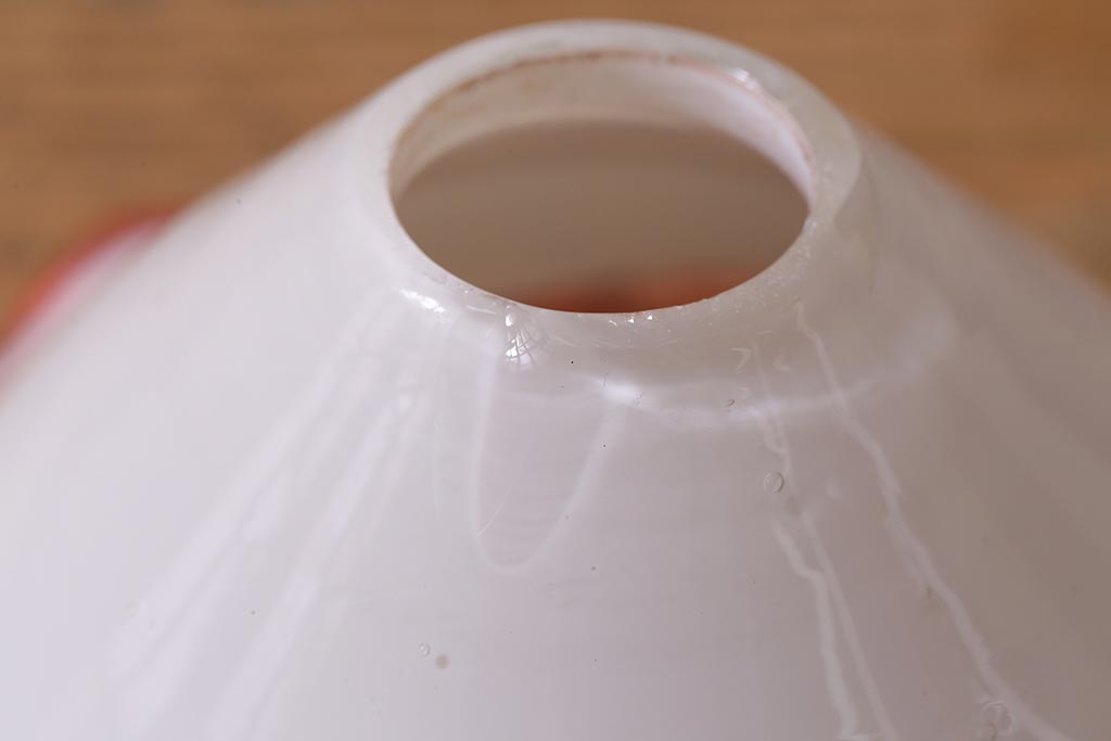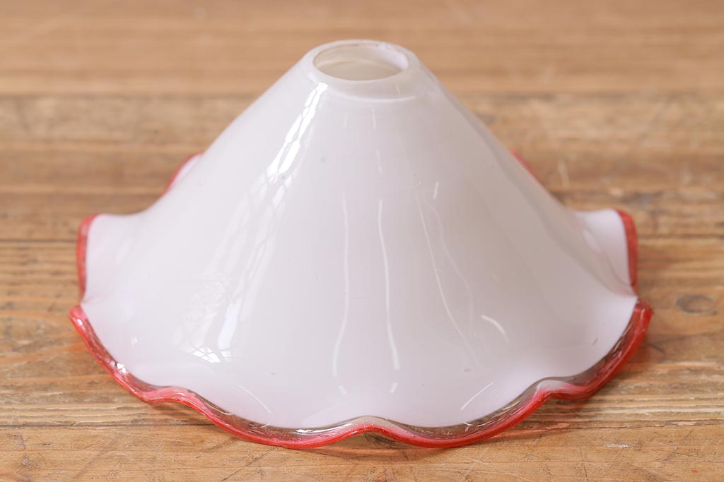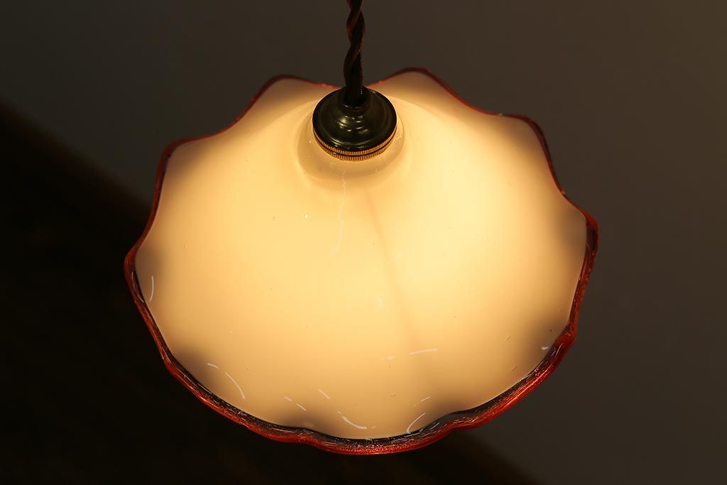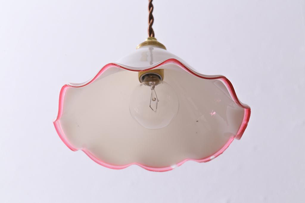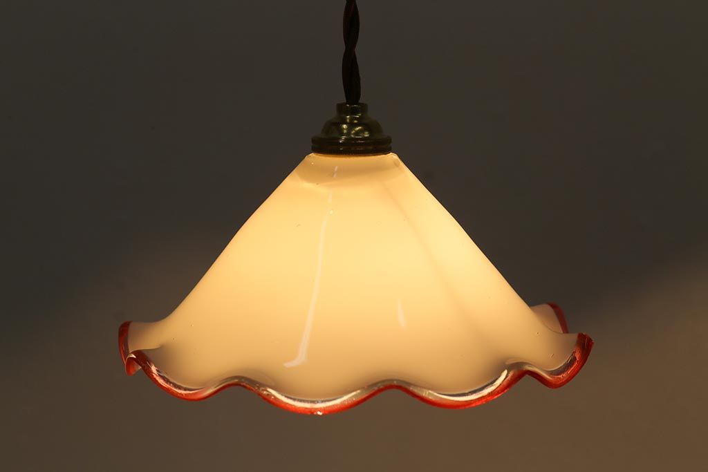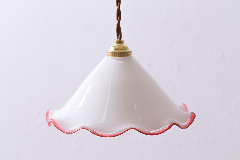 照明・ランプ> ペンダントライト > ヴィンテージ照明 イギリスビンテージ 赤い縁のフリルがアクセントになった三角シェードのペンダントライト(吊り下げ照明、天井照明、シェード)(R-040179)