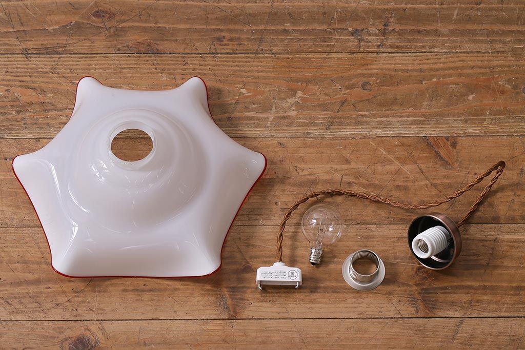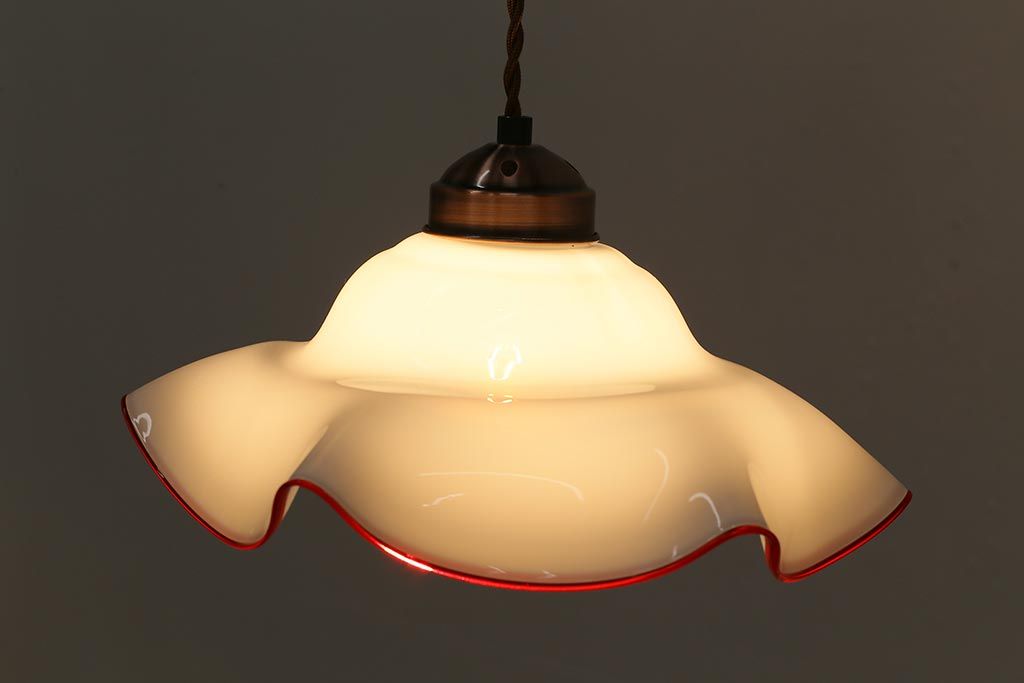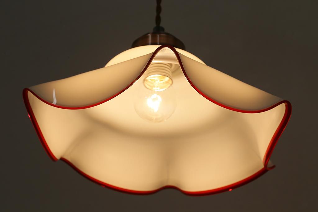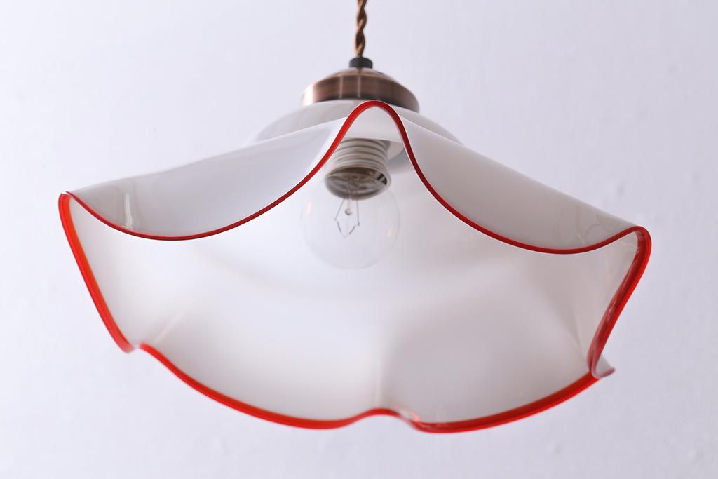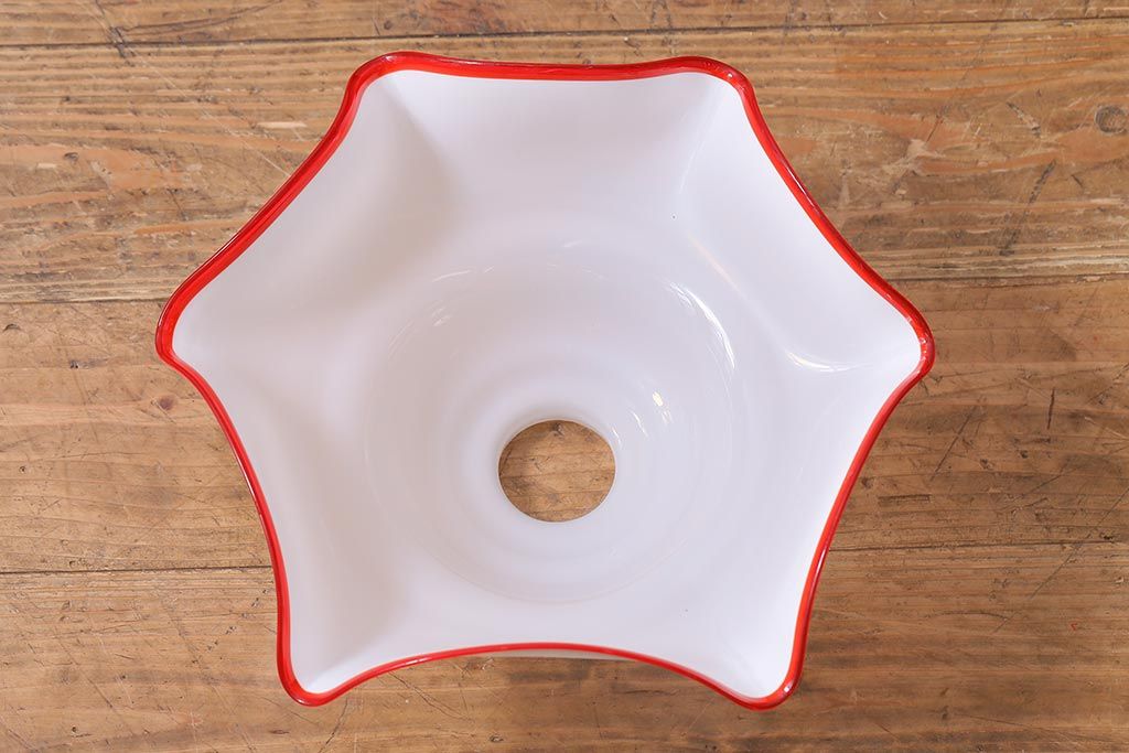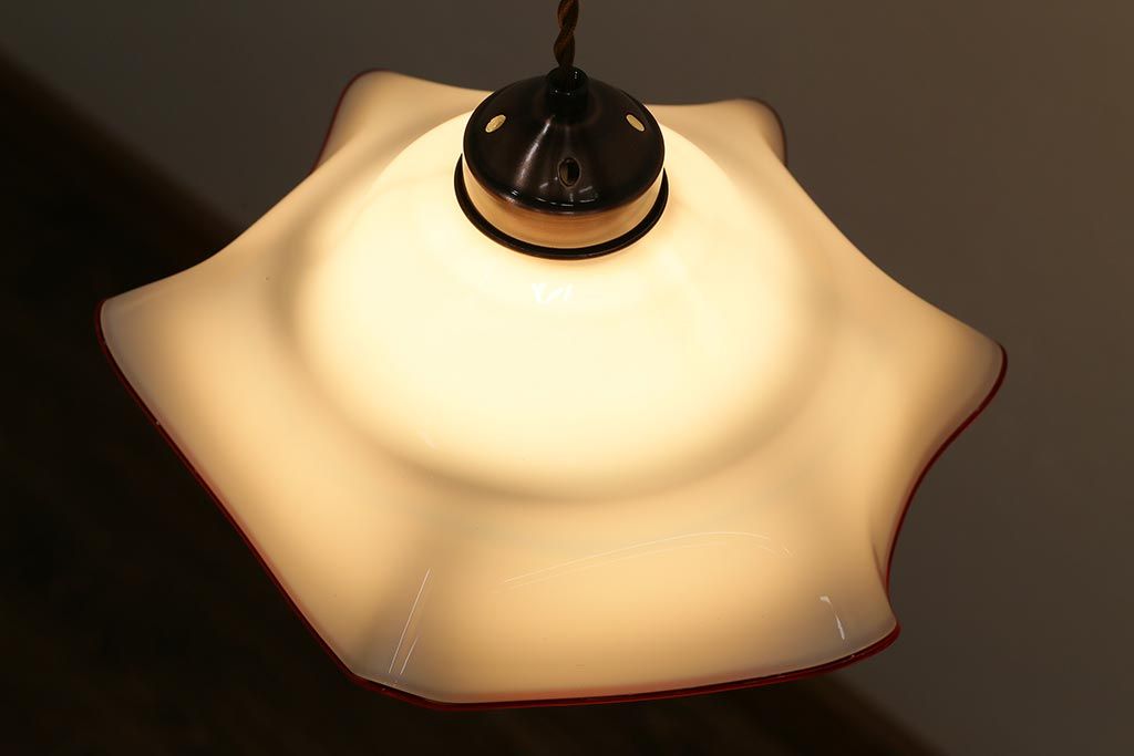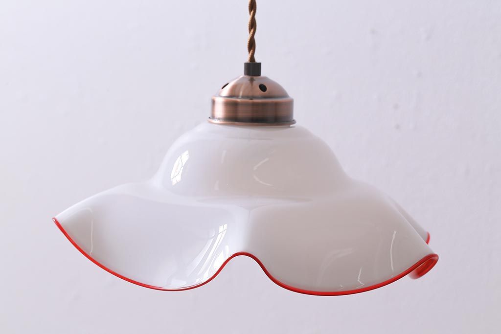 照明・ランプ> ペンダントライト > ビンテージ照明 和製ビンテージ 昭和中期 赤縁フリル レトロなミルクガラスの吊り下げ照明(ペンダントライト、天井照明、シェード、電笠)(R-040176)