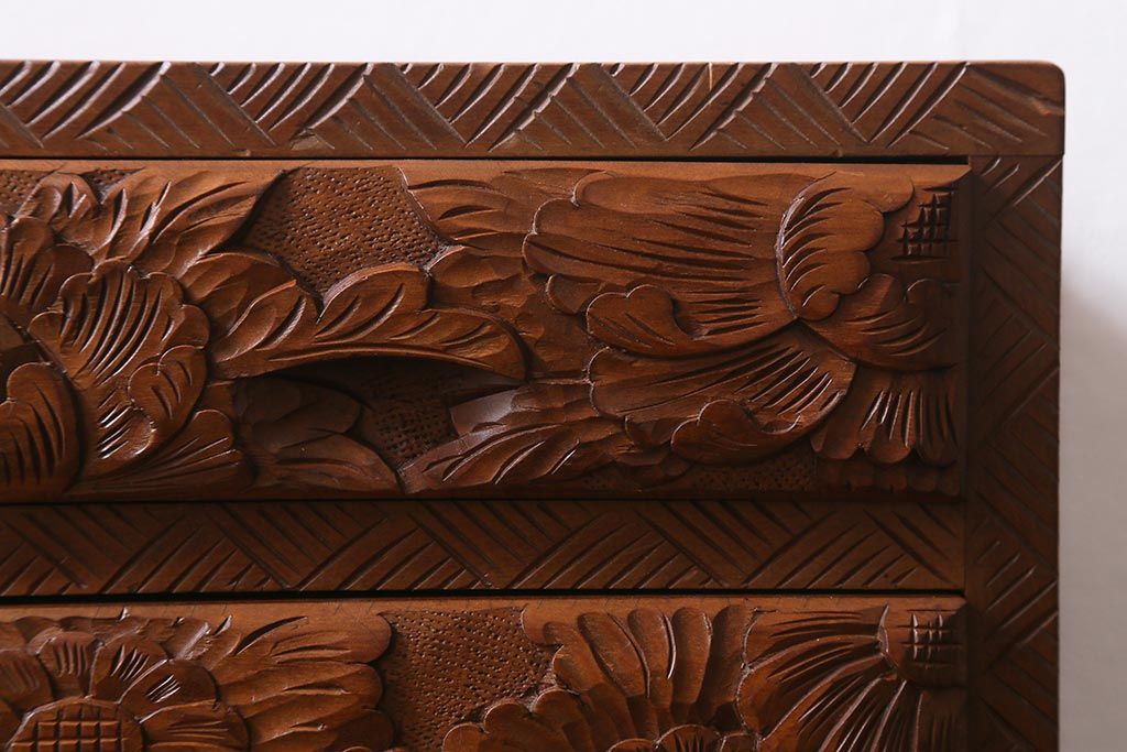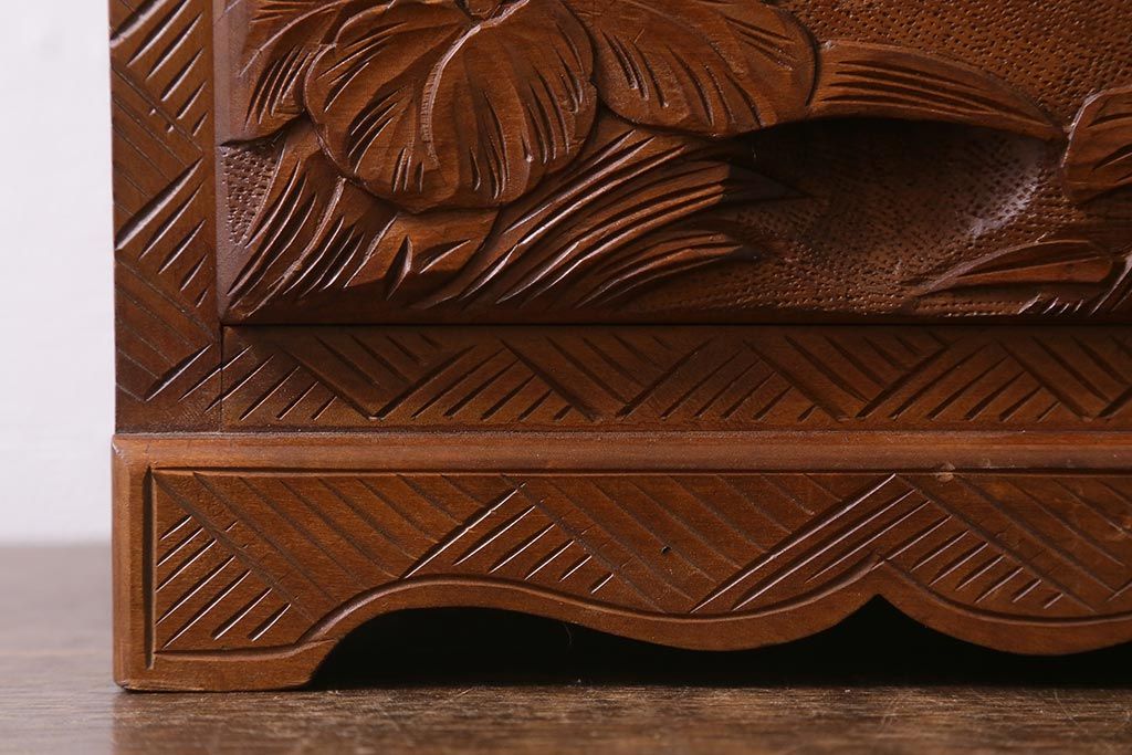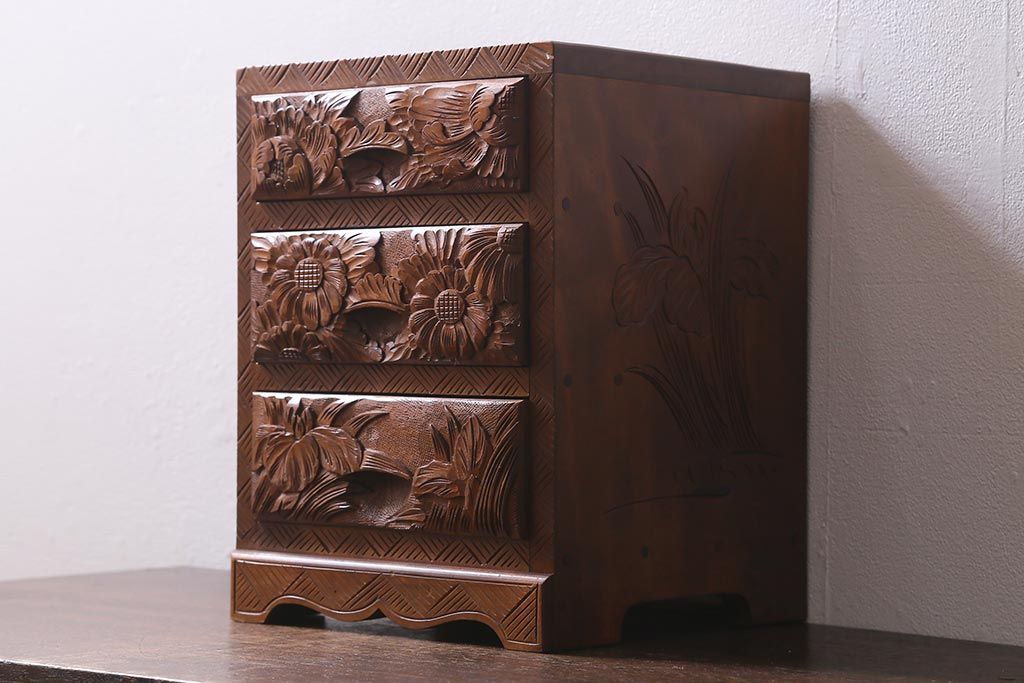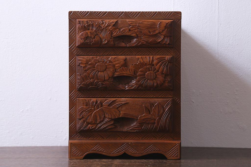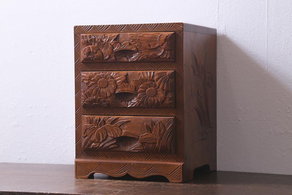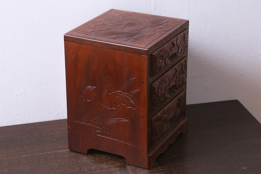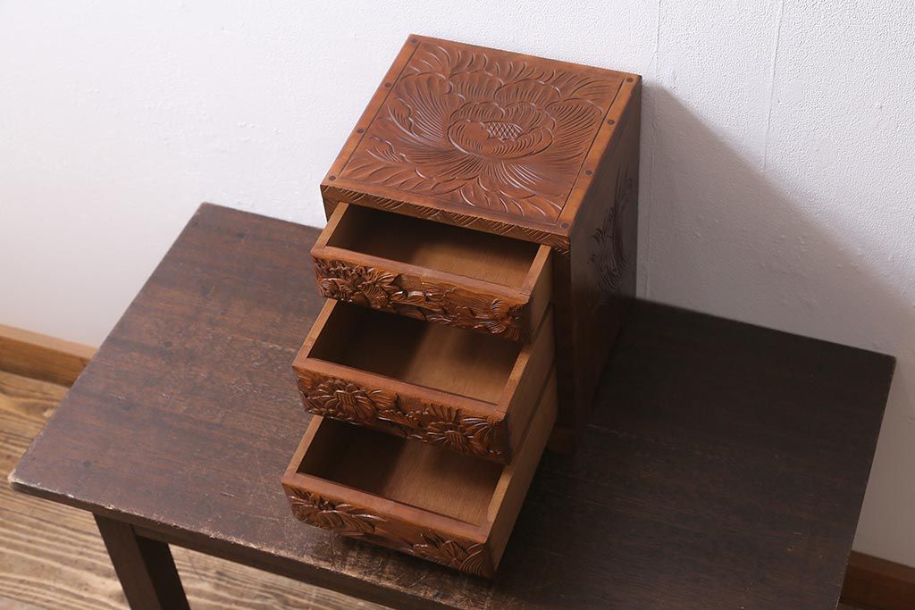 中古 伝統工芸 日光彫り 華やかな花の意匠が目を惹く小引き出し(小物収納)(R-040166)
