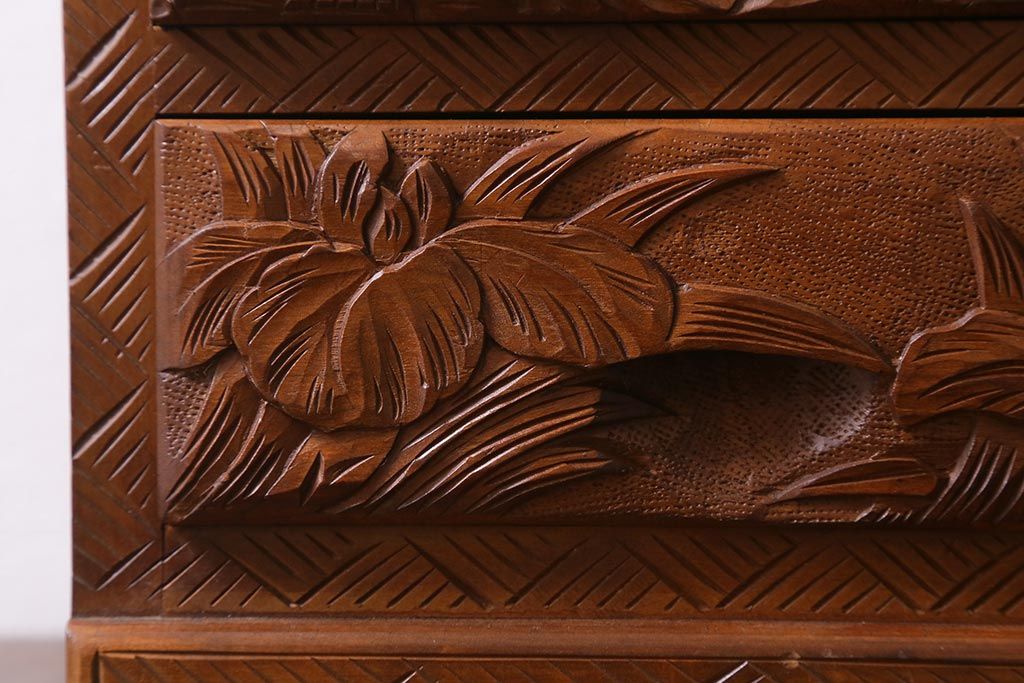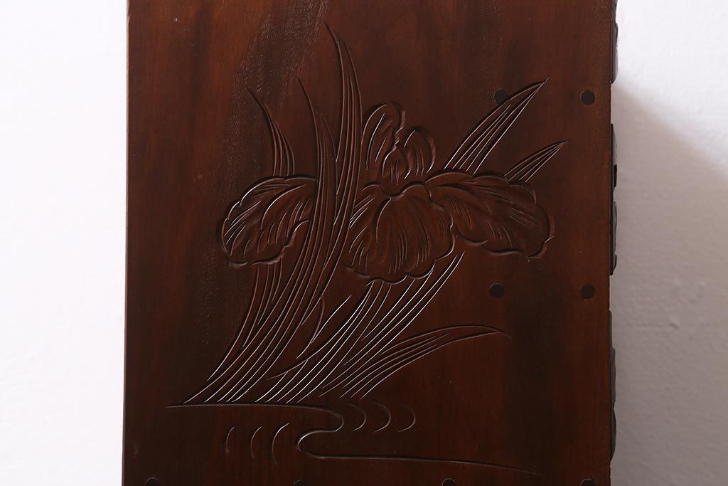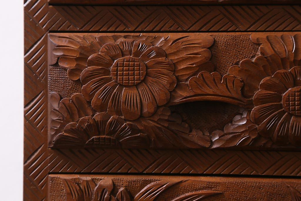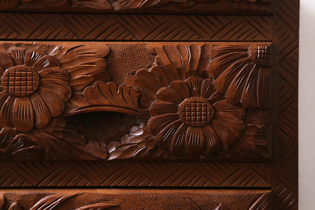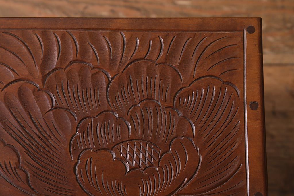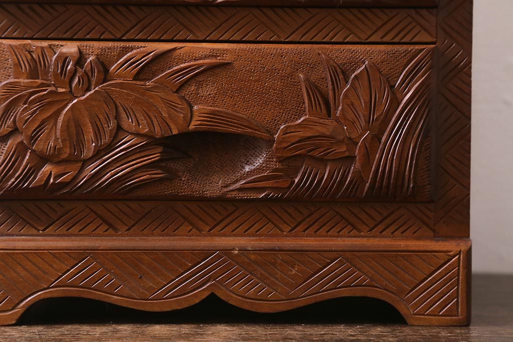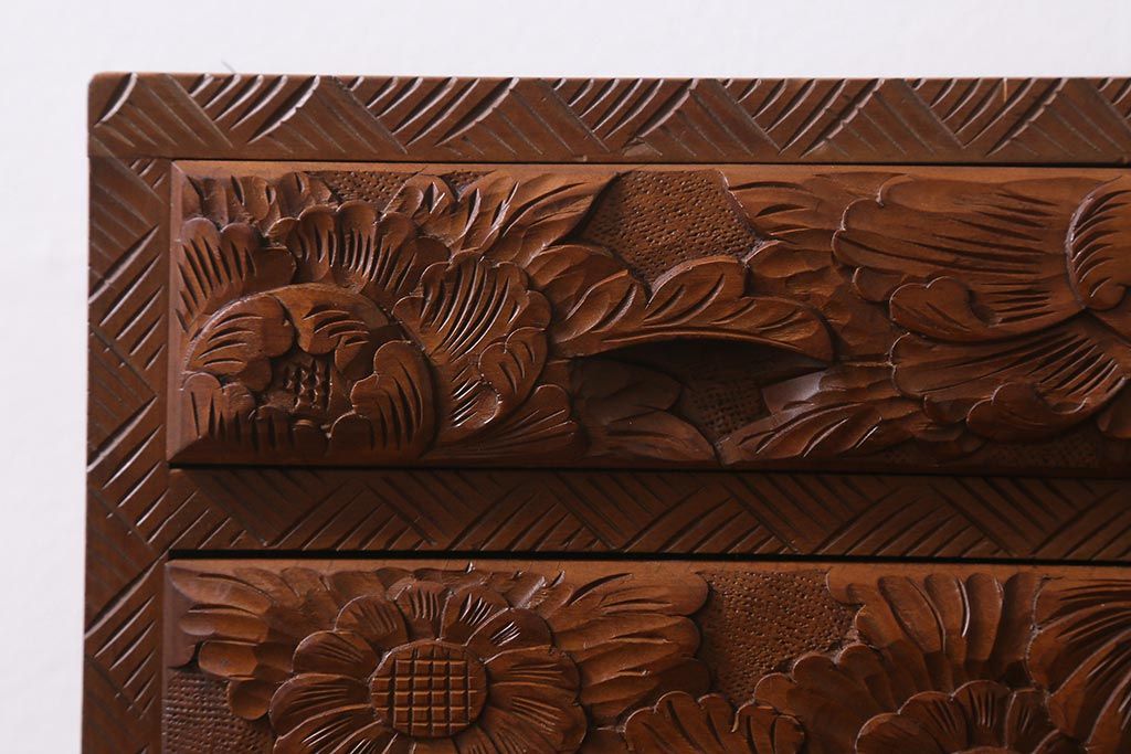 中古 伝統工芸 日光彫り 華やかな花の意匠が目を惹く小引き出し(小物収納)(R-040166)