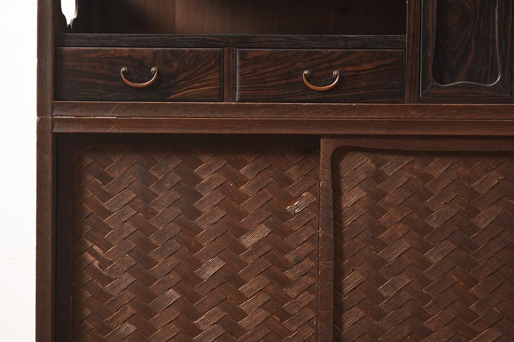 アンティーク家具 工芸家具 京都産 桑材・黒檀材 網代編み戸 上品な造りの茶棚(茶箪笥、収納棚)(R-040282)