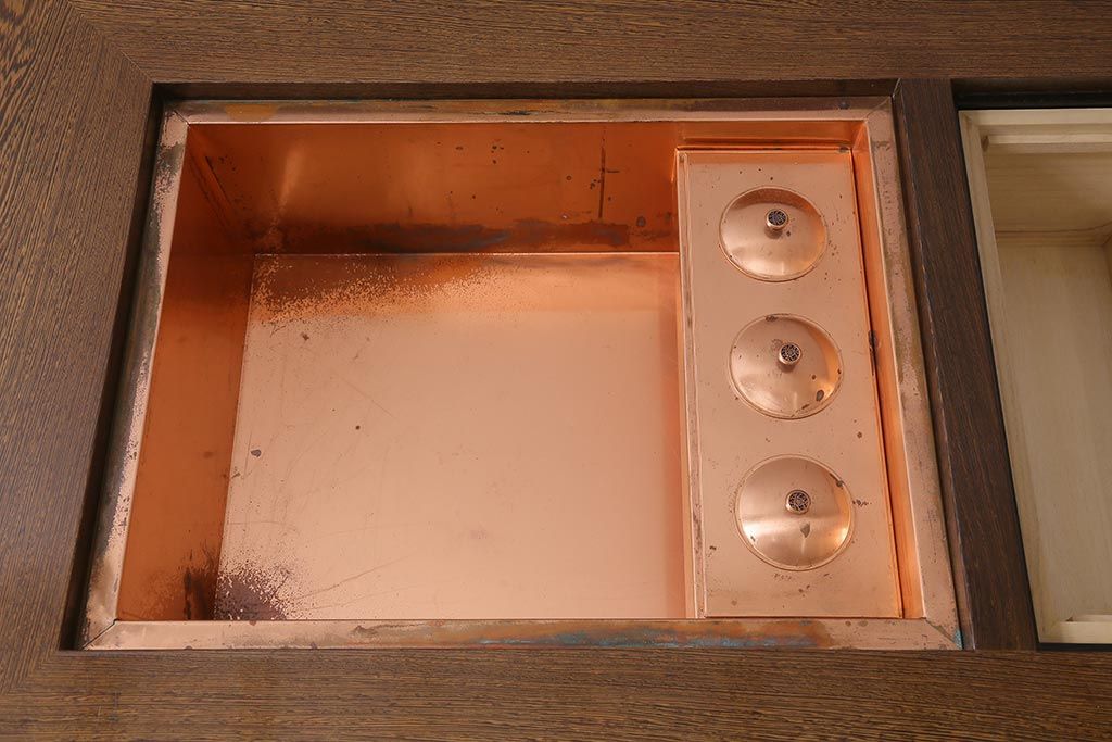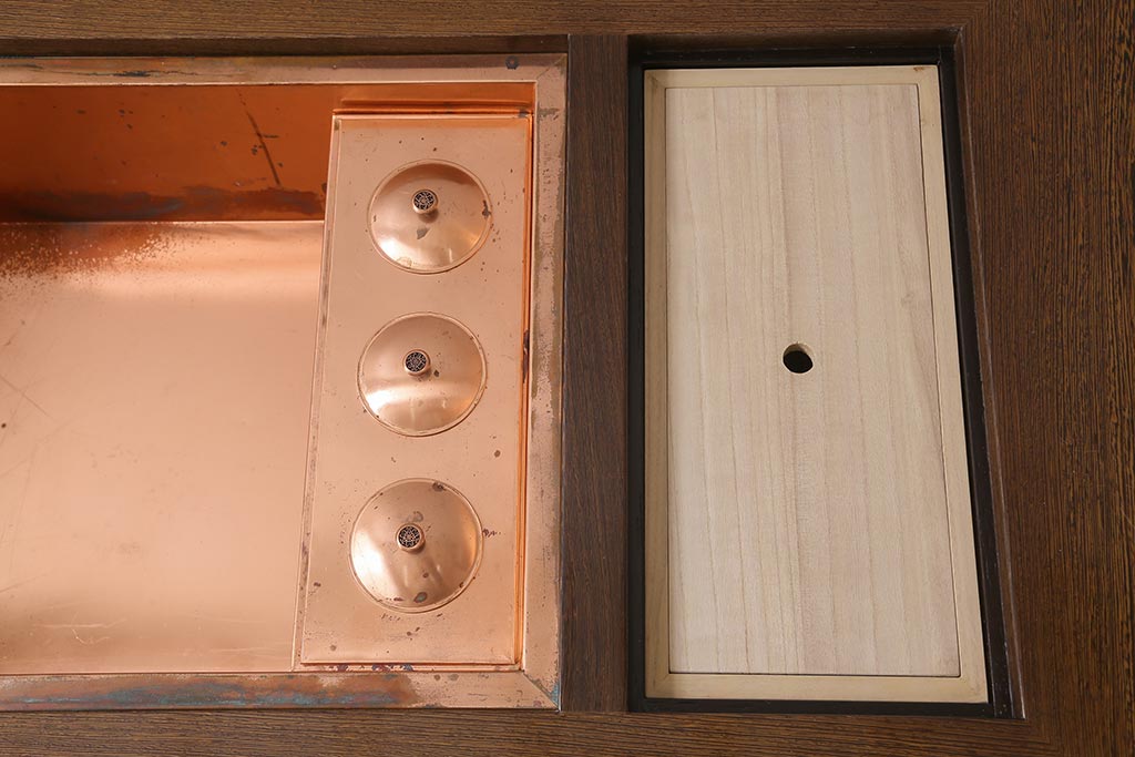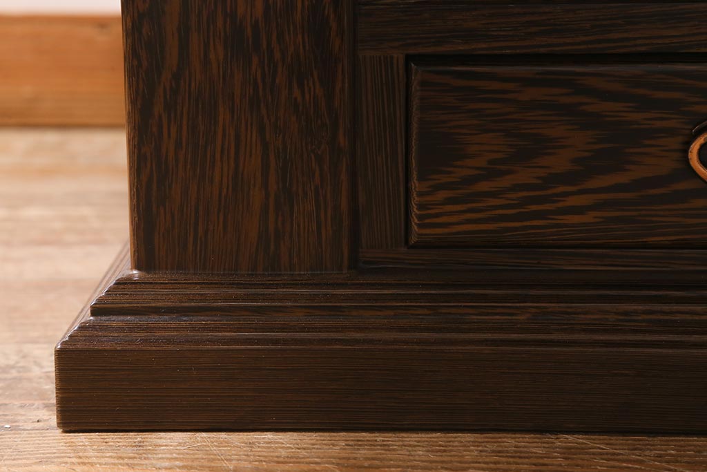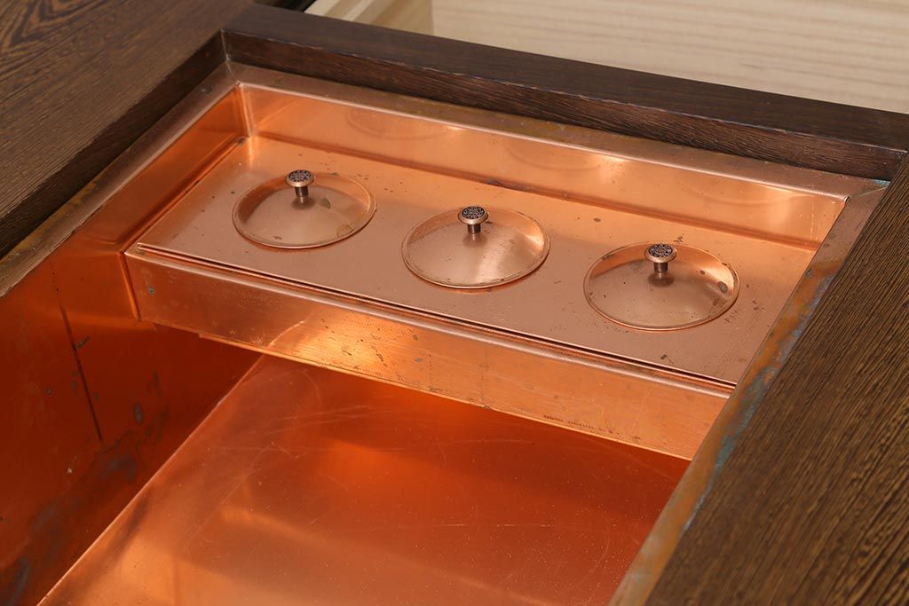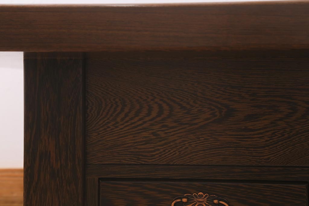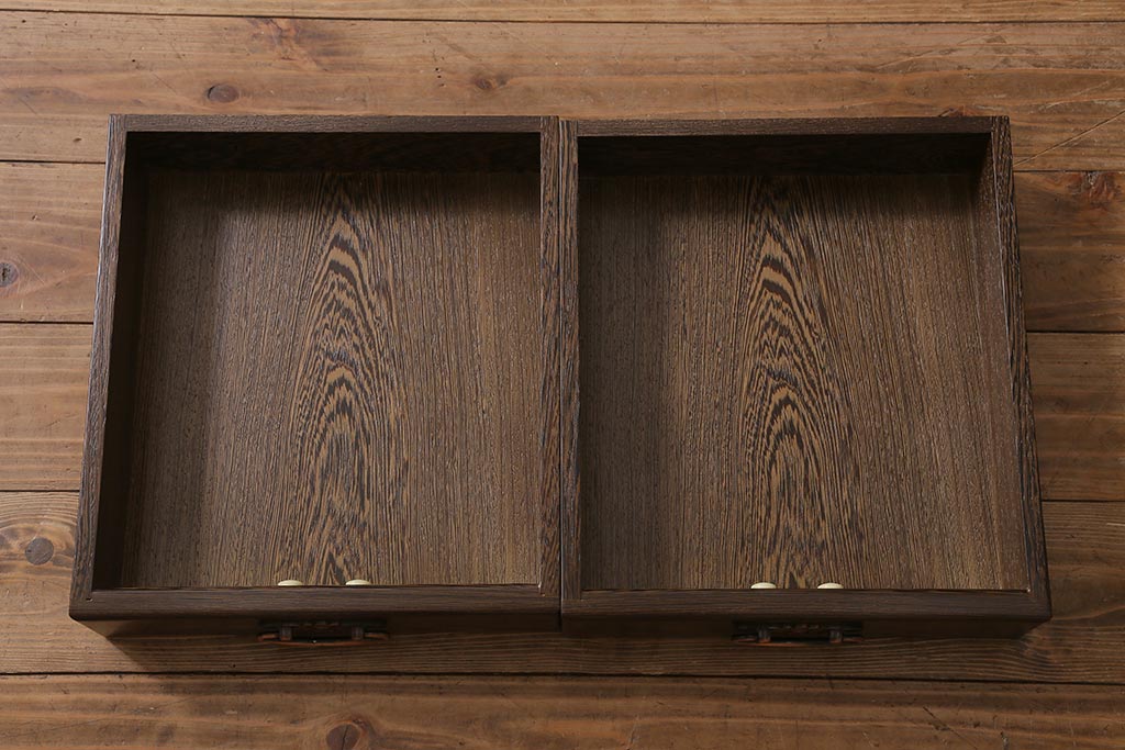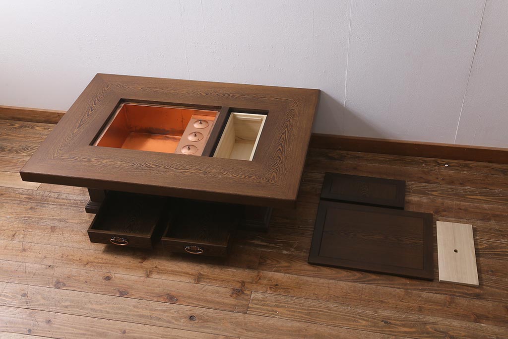 中古 最高級品 鉄刀木(タガヤサン)無垢材 内部銅製 美しい木目が魅力の関西火鉢(ローテーブル、長火鉢、座卓、リビングテーブル、囲炉裏)(R-040239)