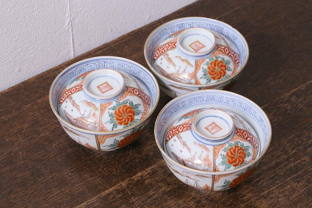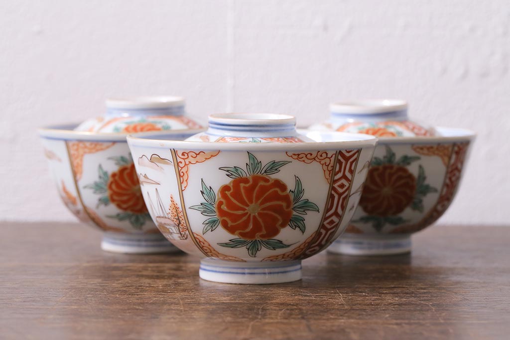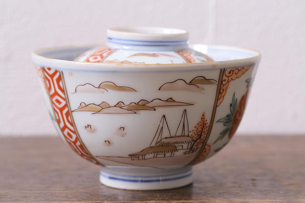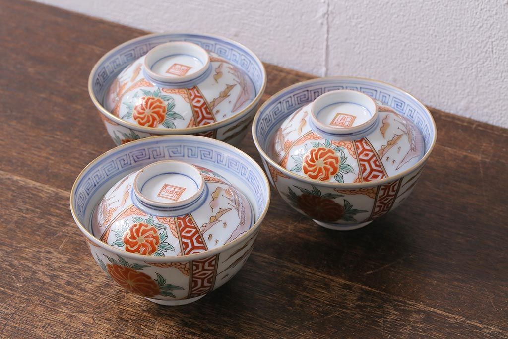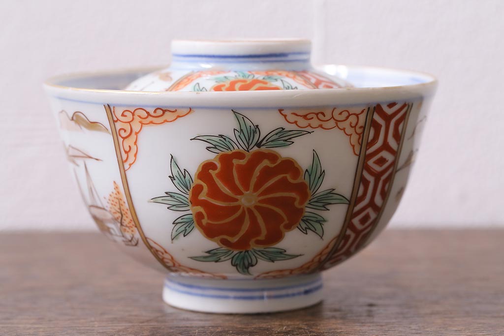 ラフジュ工房> 和食器・茶道具> お椀・茶碗 > 和製アンティーク 古伊万里 江戸期 華やかな色絵染付の蓋つき茶碗2客セット(和食器)(R-040138)