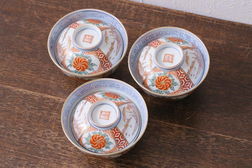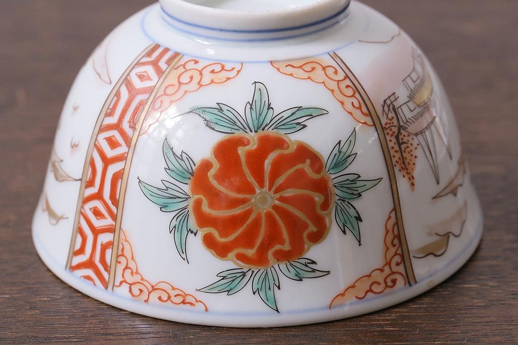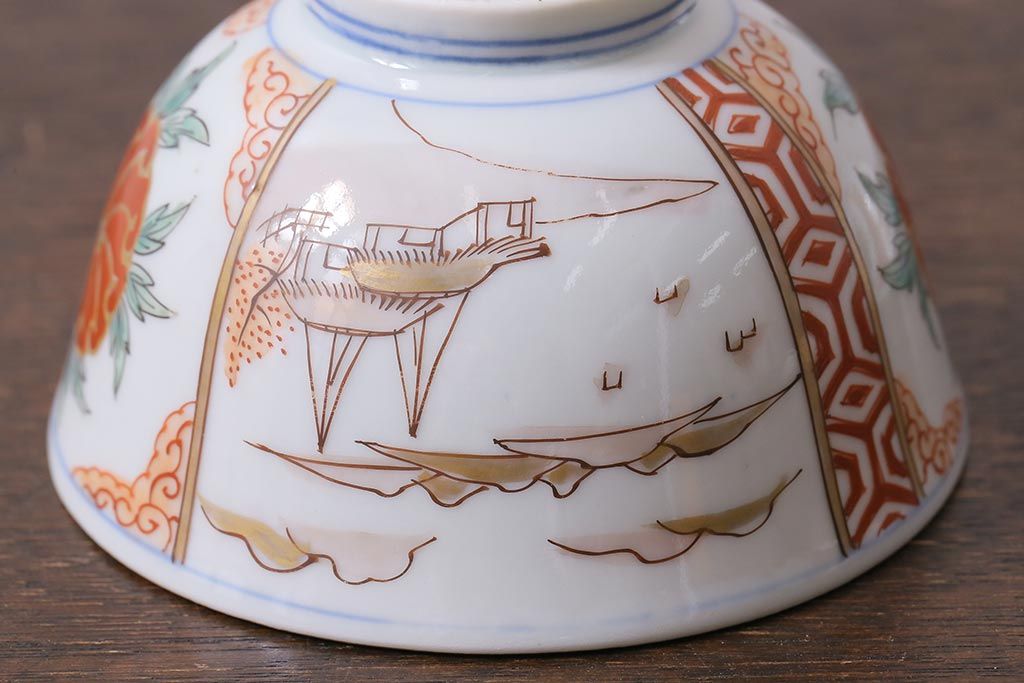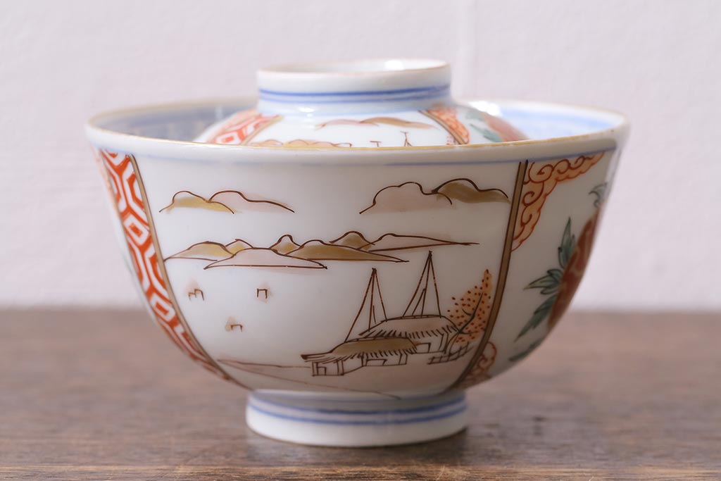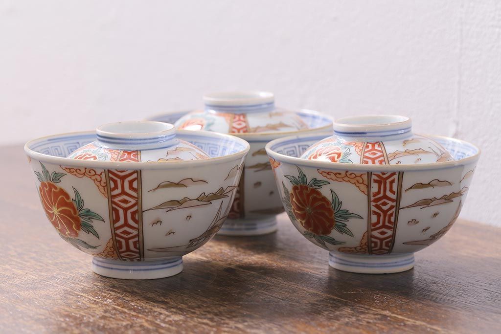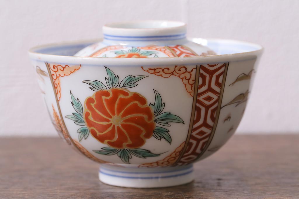 ラフジュ工房> 骨董・美術品> 骨董-陶磁器 > 和製アンティーク 古伊万里 江戸期 華やかな色絵染付の蓋つき茶碗2客セット(和食器)(R-040138)