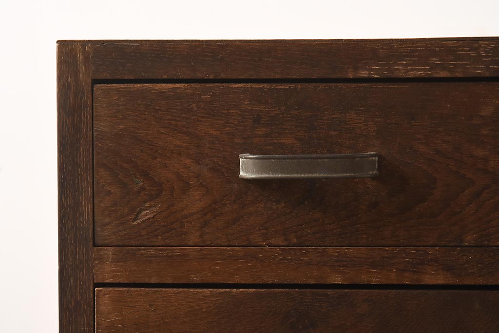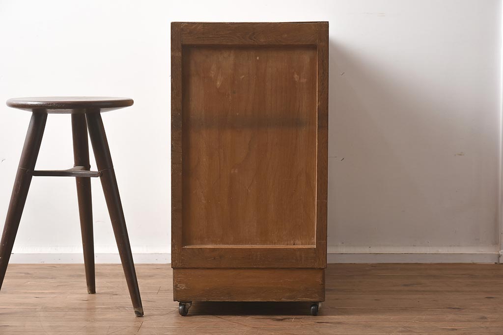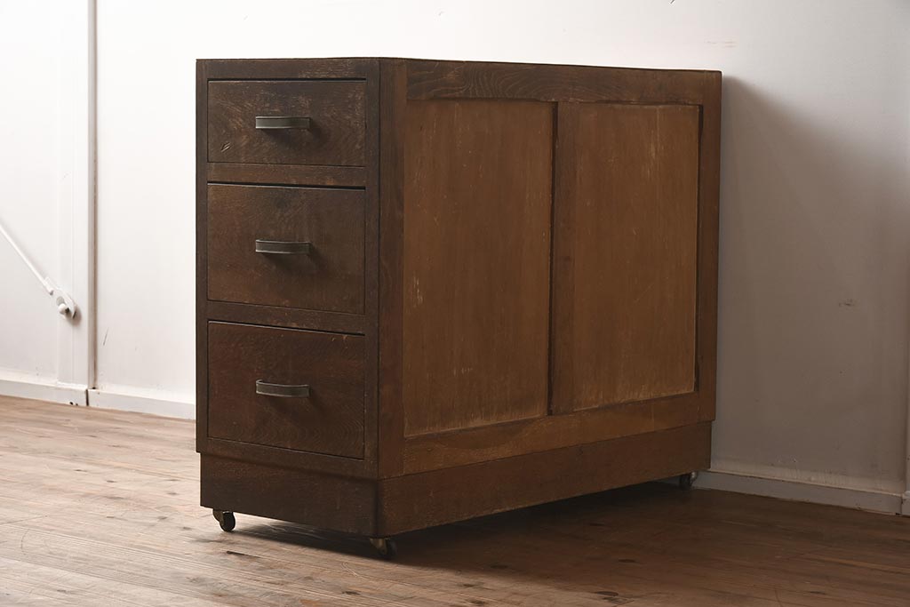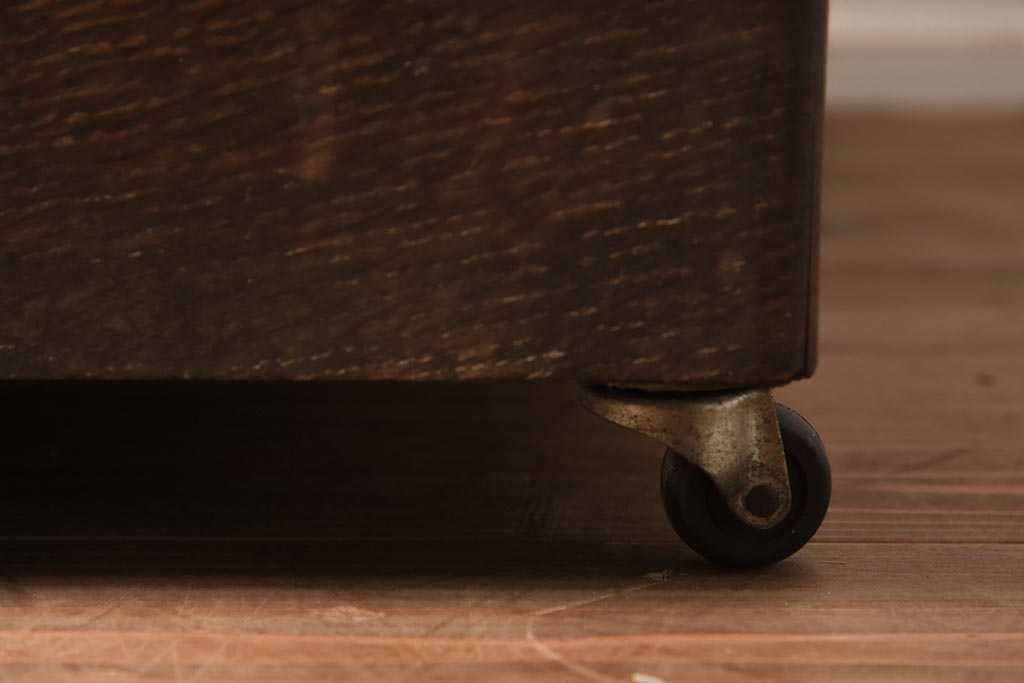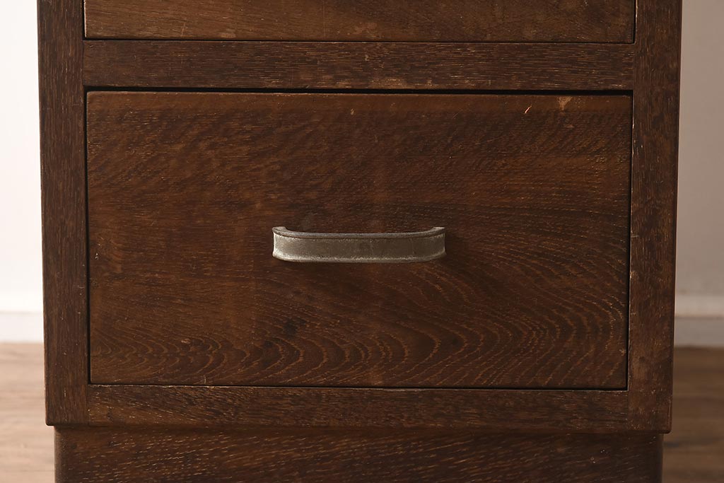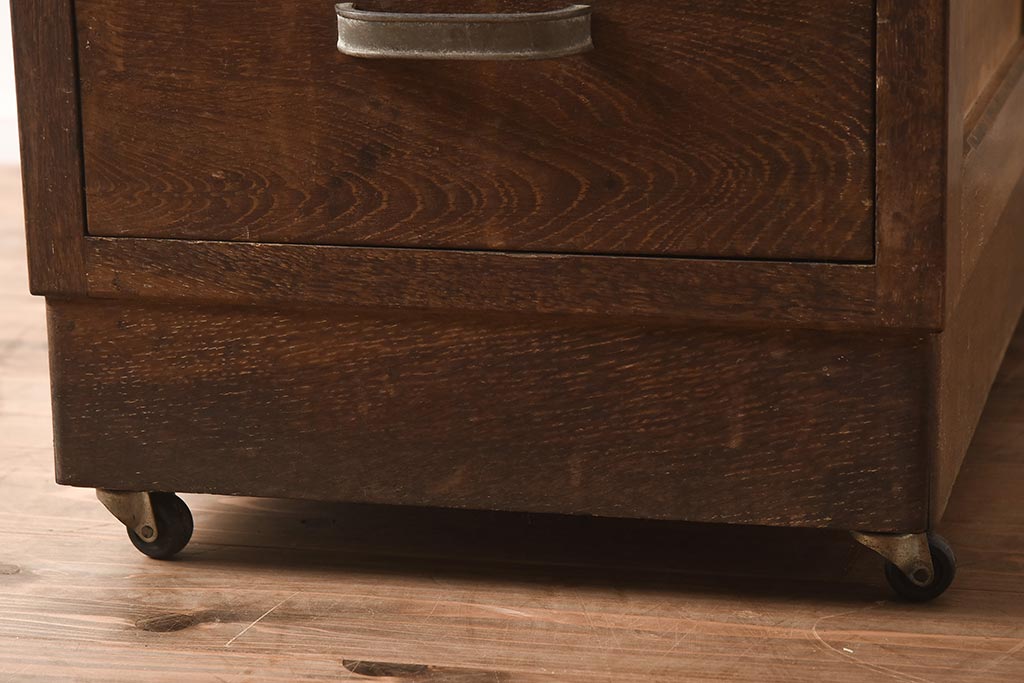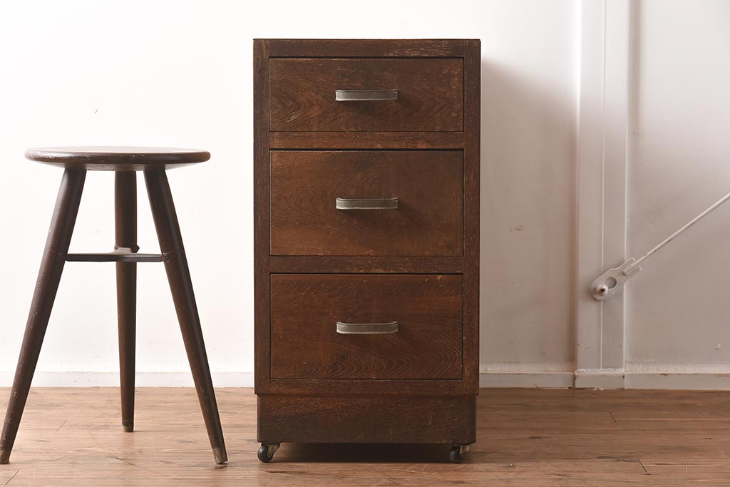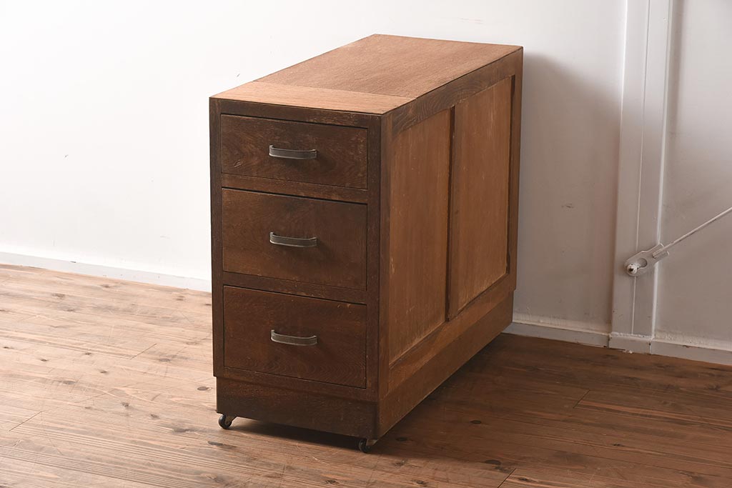 レトロ家具 昭和中期 ナラ材 味わい深いキャスター付きサイドチェスト(袖机、引き出し、ドロアー)(R-040233)です。