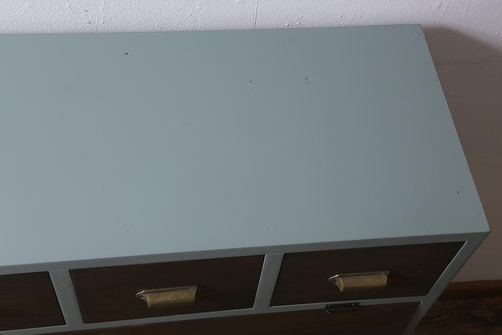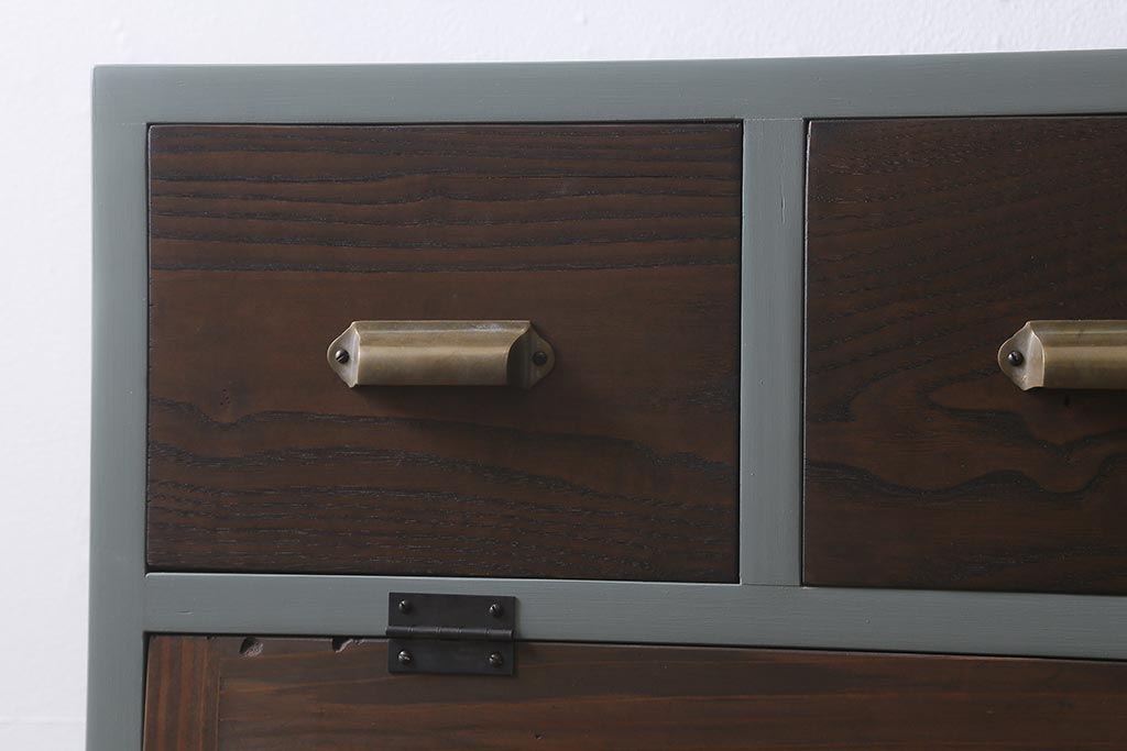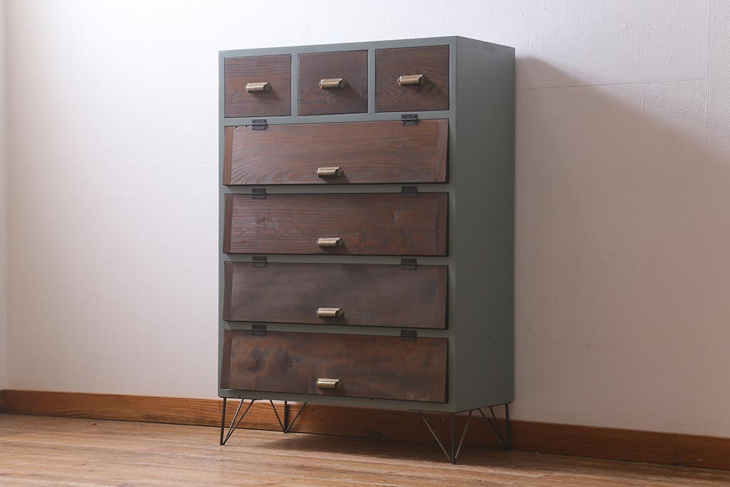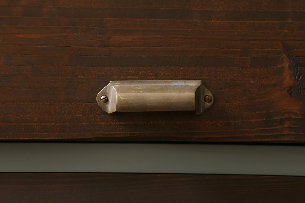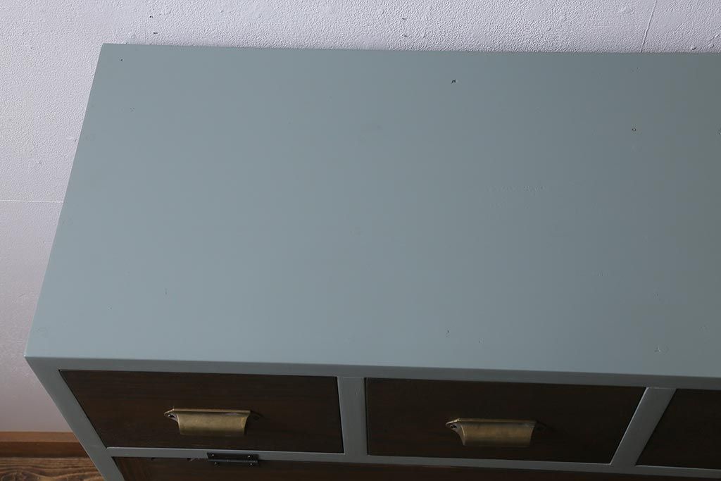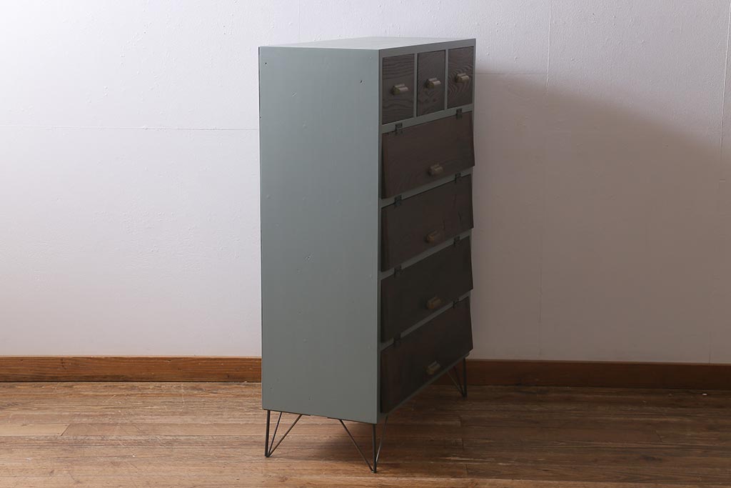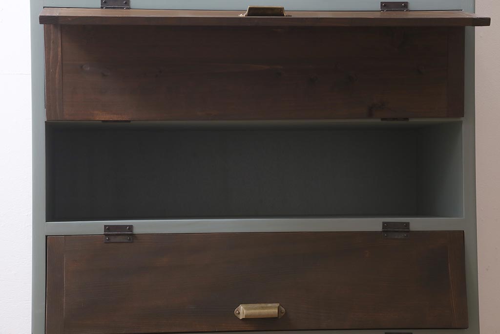 ラフジュ工房オリジナル家具 古材リメイク ペイント家具 鉄脚 引き出し付きパタパタ扉の下駄箱(収納棚、キャビネット)(R-040257)です。